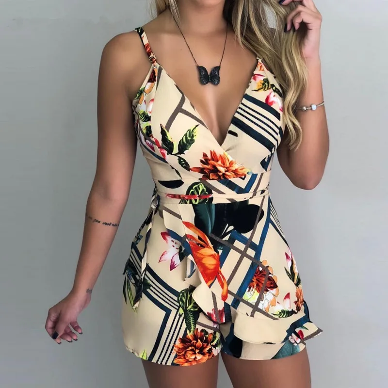 Sexy V-neck Spaghetti Strap Floral Print Women Short Romper Playsuit Female Beach Ruffle Sleeveless 2023 Fashion Casual Jumpsuit