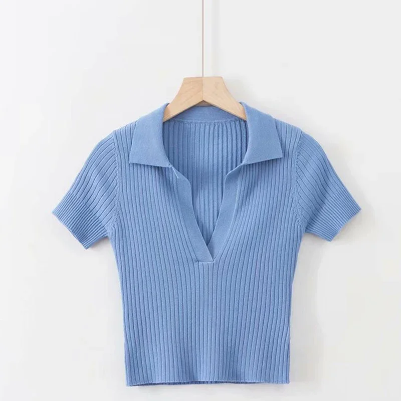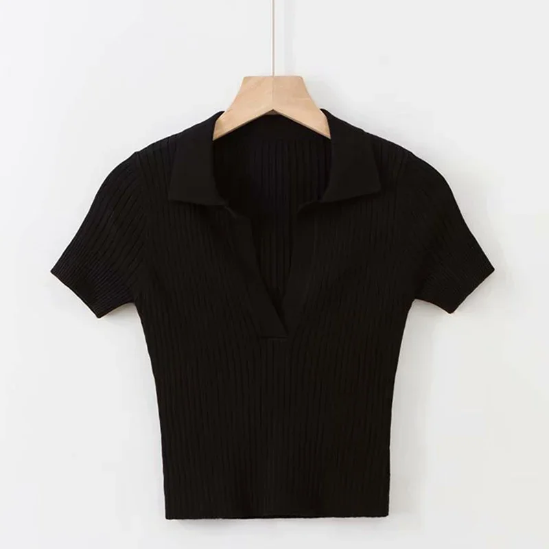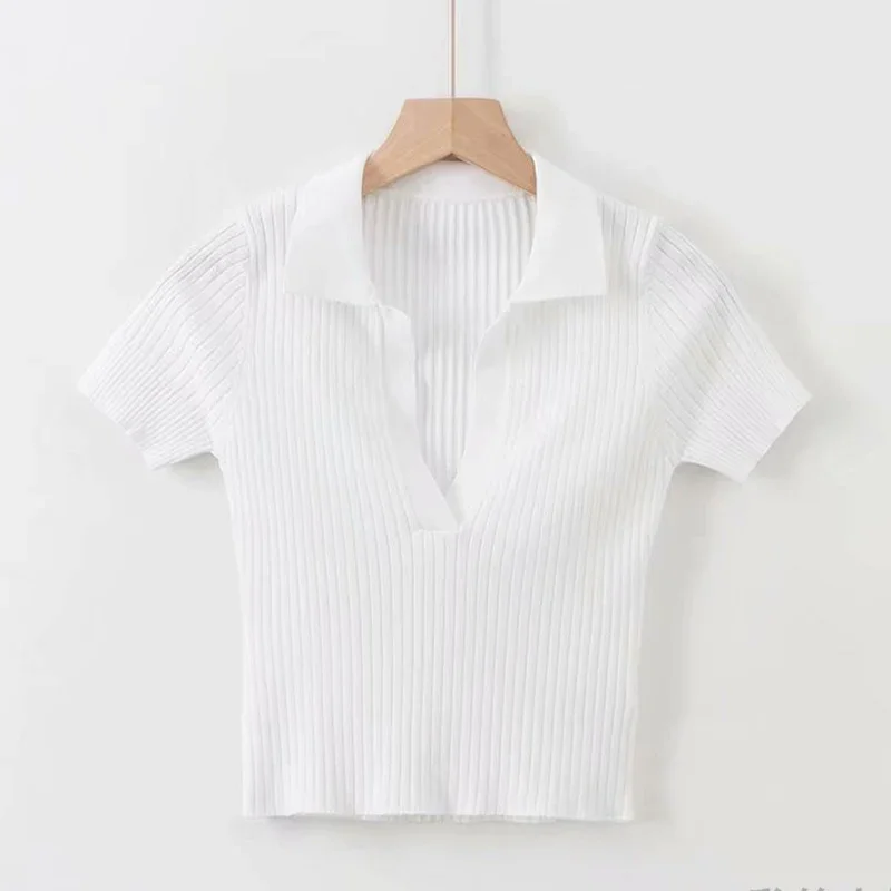 Short Sleeve Collared Crop Top for Women Turn-down Collared Fitted Rib-Knit Tee Shirt Summer Teengirl Y2K Outfit
