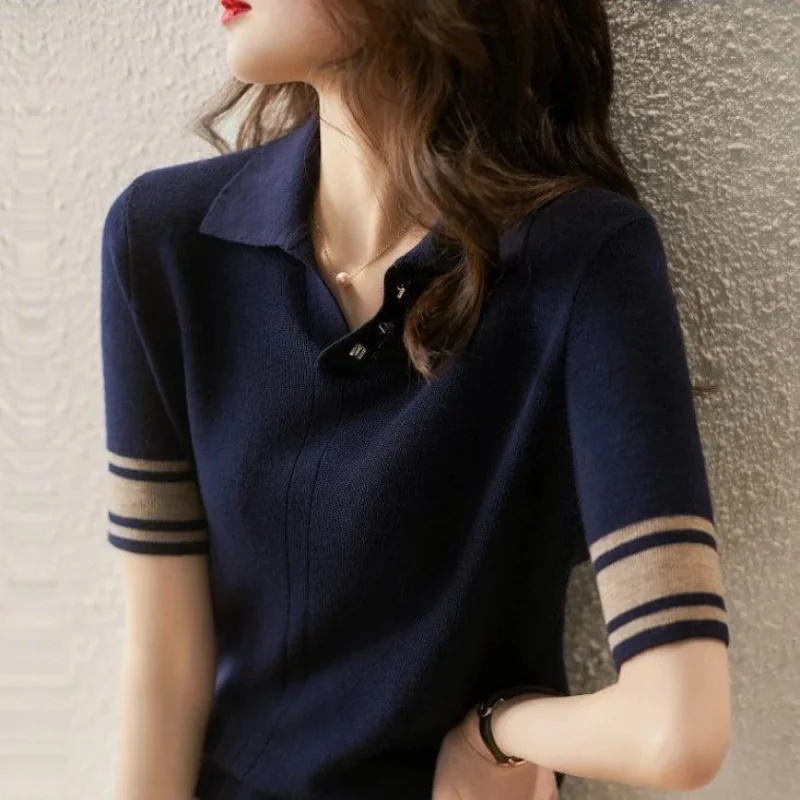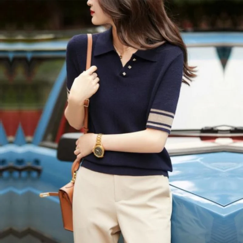 Short Sleeve Polo Shirts Woman Aesthetic Hot Black Women Vintage Sweatshirt Flower Knitted Korean Shirt High Quality Top Cotton