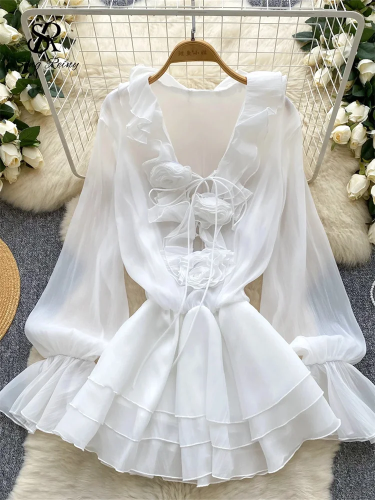 SINGREINY 3D Floral Beach Short Dress Female Long Sleeves Lace Up Ruffle Chiffon Cake Sundress Sheer Sexy Vintage Bohemian Dress