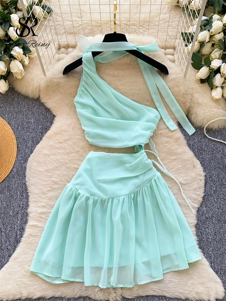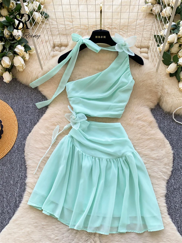 SINGREINY 3D Floral Chiffon Seaside Dresses Summer Fairycore Off Shoulder A-line Lace Up Holiday Sensual Hollow Out Mini Dresses