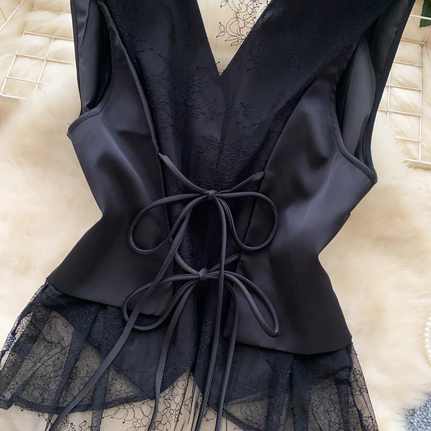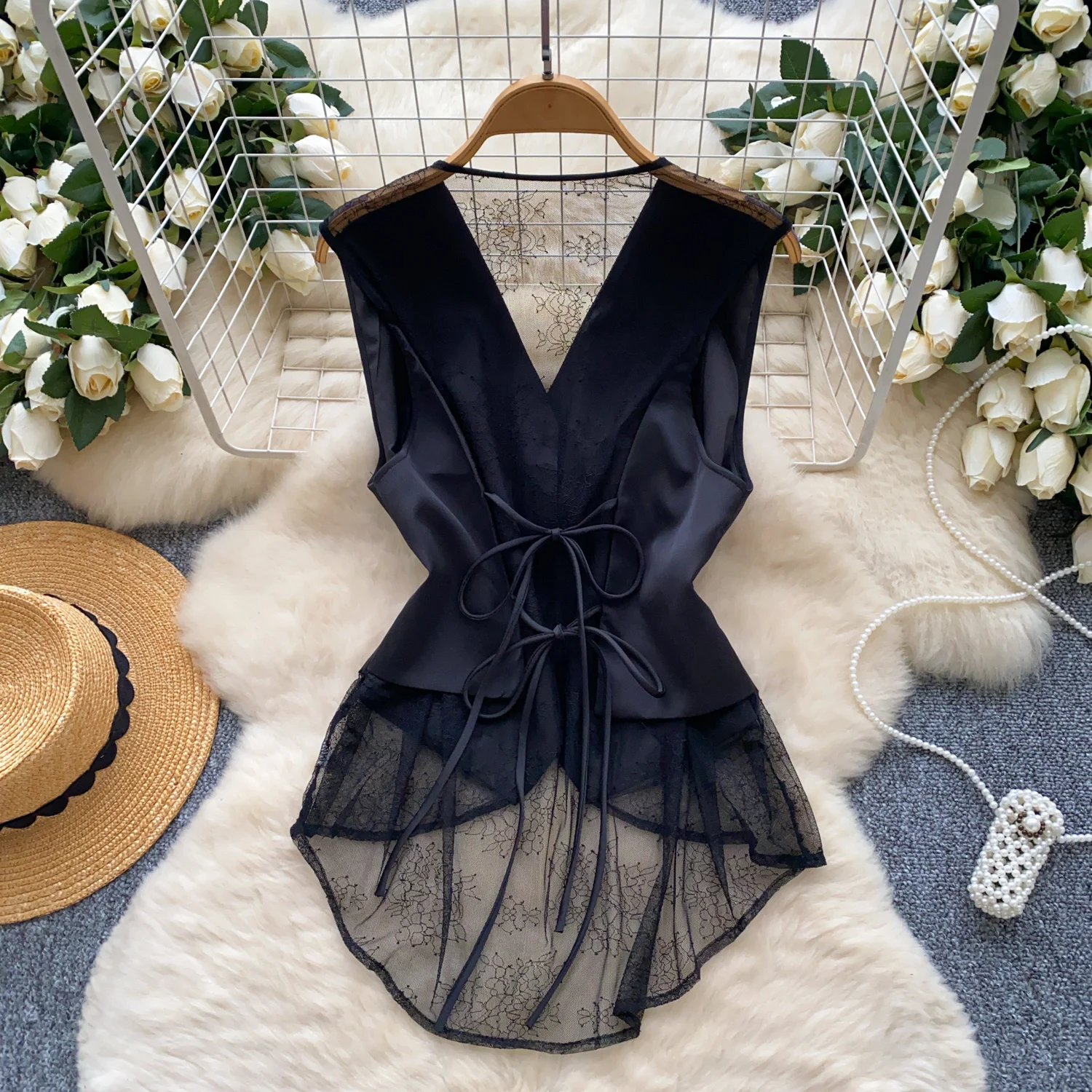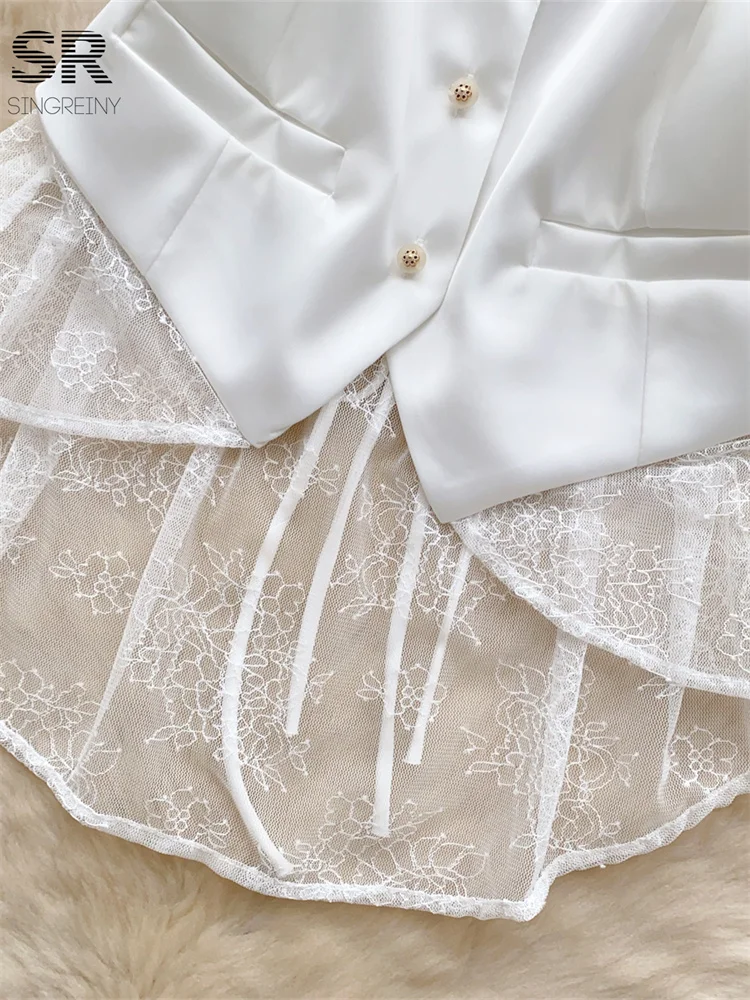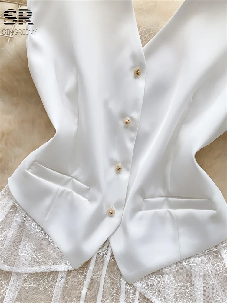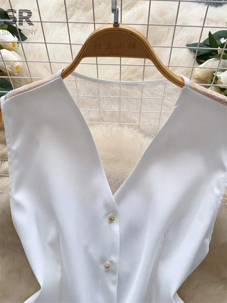 SINGREINY Backless Sexy Tank Vest Sleeveless Single Breasted V Neck Spliced Lace Skinny Sheer Irregular Summer Women Design Tops