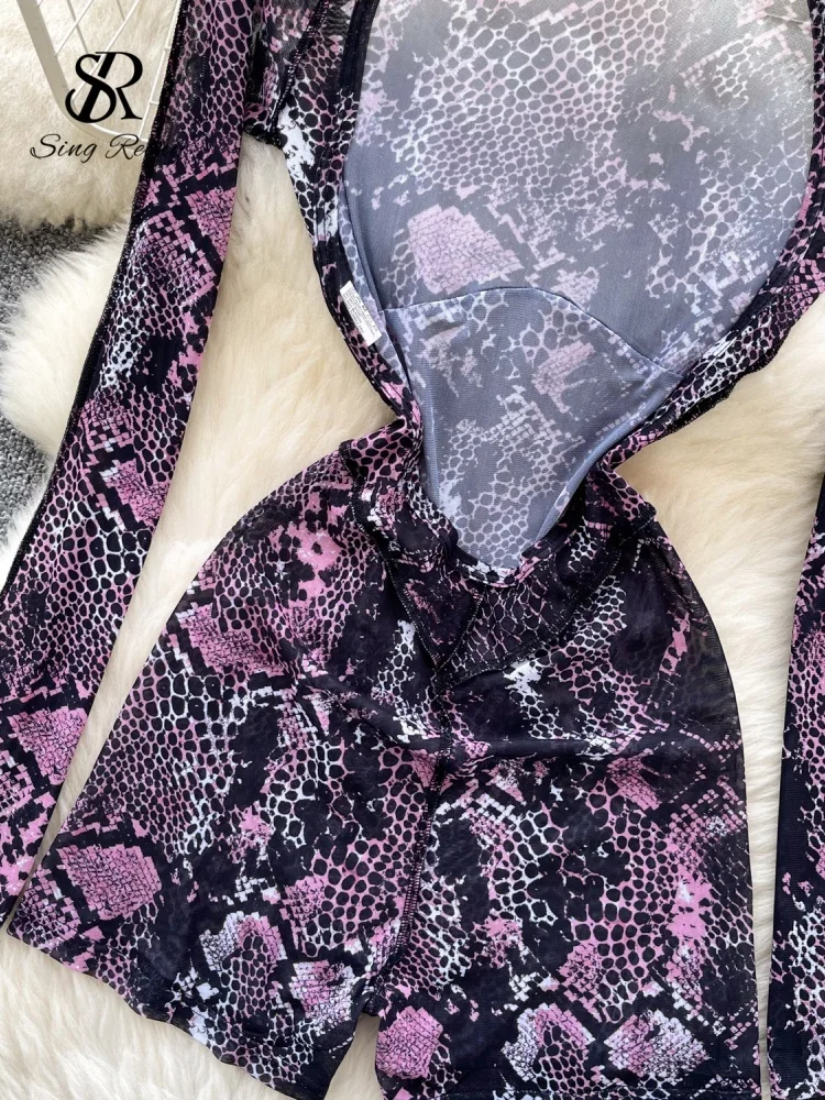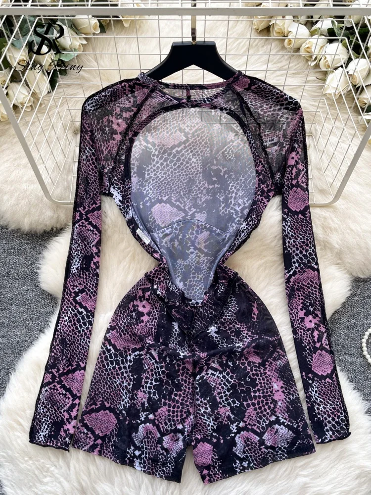 SINGREINY Serpentine Print Sexy Playsuits Female O Neck Long Sleeves Hollow Out Sheer Bodysuits Fashion Backless Short Jumpsuits