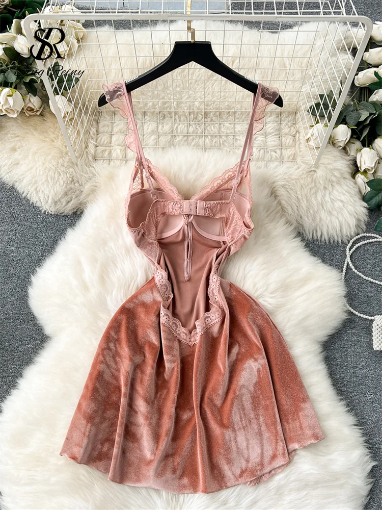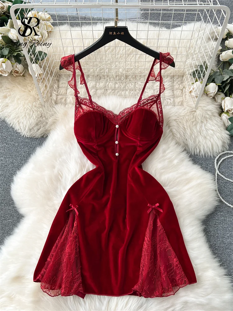 SINGREINY Strap Sexy Velvet Dress Fashion Senior Pearls Sleeveless Slim Women Lace Hollow out Backless High Quality Mini Dress