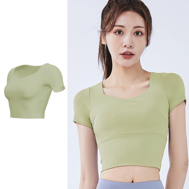 Slim Solid T Shirts for Women with Chest Pads Yoga T Shirts Gym Trainning Running High Elastic Fashion Knit Fitness Short Sleeve