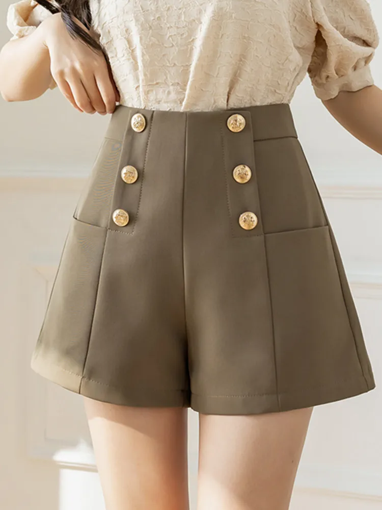 SMTHMA Casual Shorts For Women’s 2026 New Summer High Waisted Shorts Versatile Gold Buttons Solid Wide Leg Pants