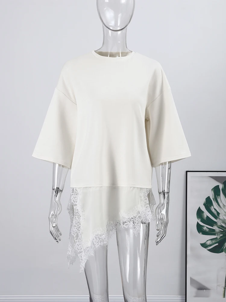Solid Summer Lace Patchwork T-shirt For Women Chic Short Sleeve O-neck Top All-match Casual Loose Lady Streetwear 2026
