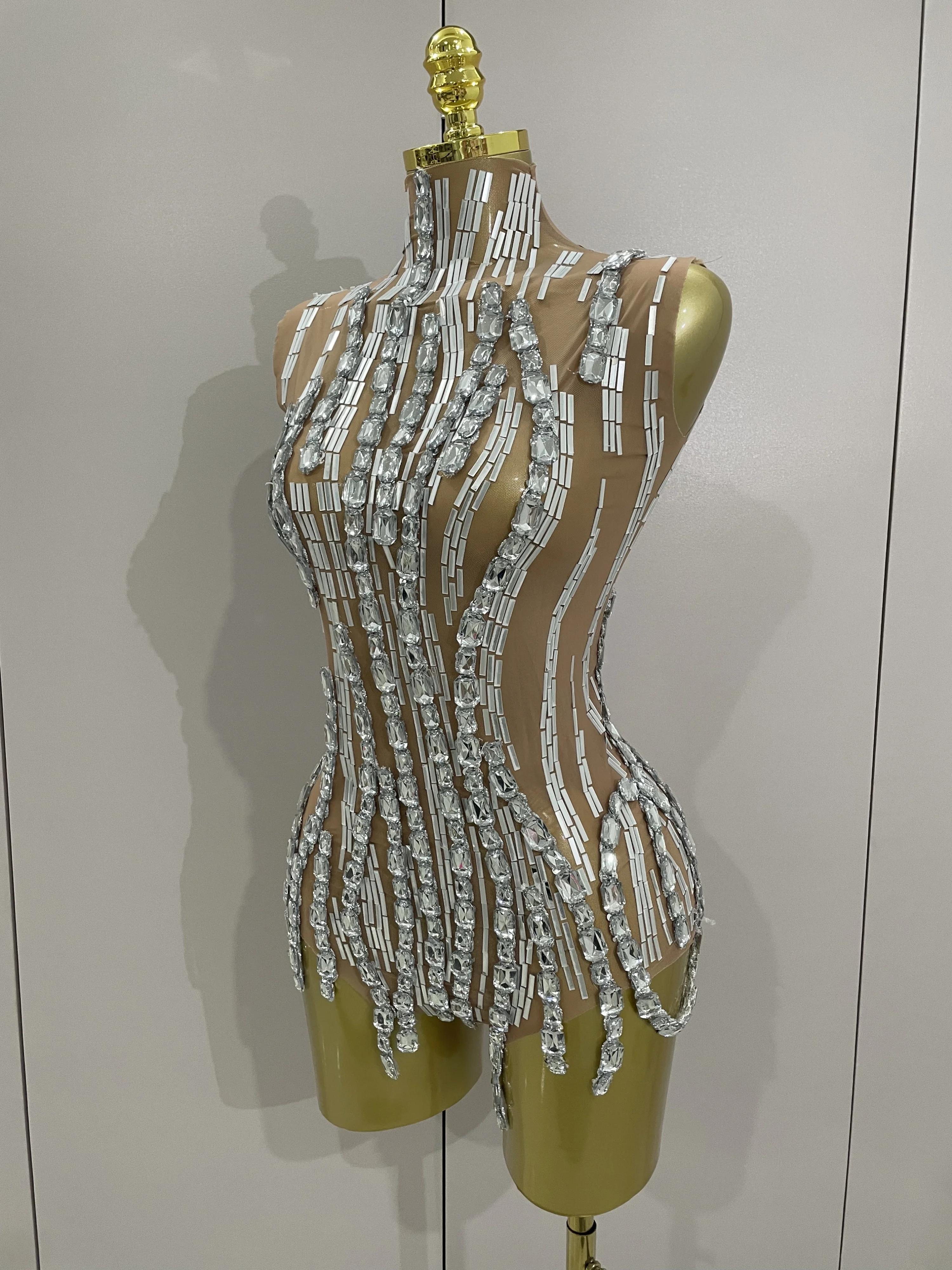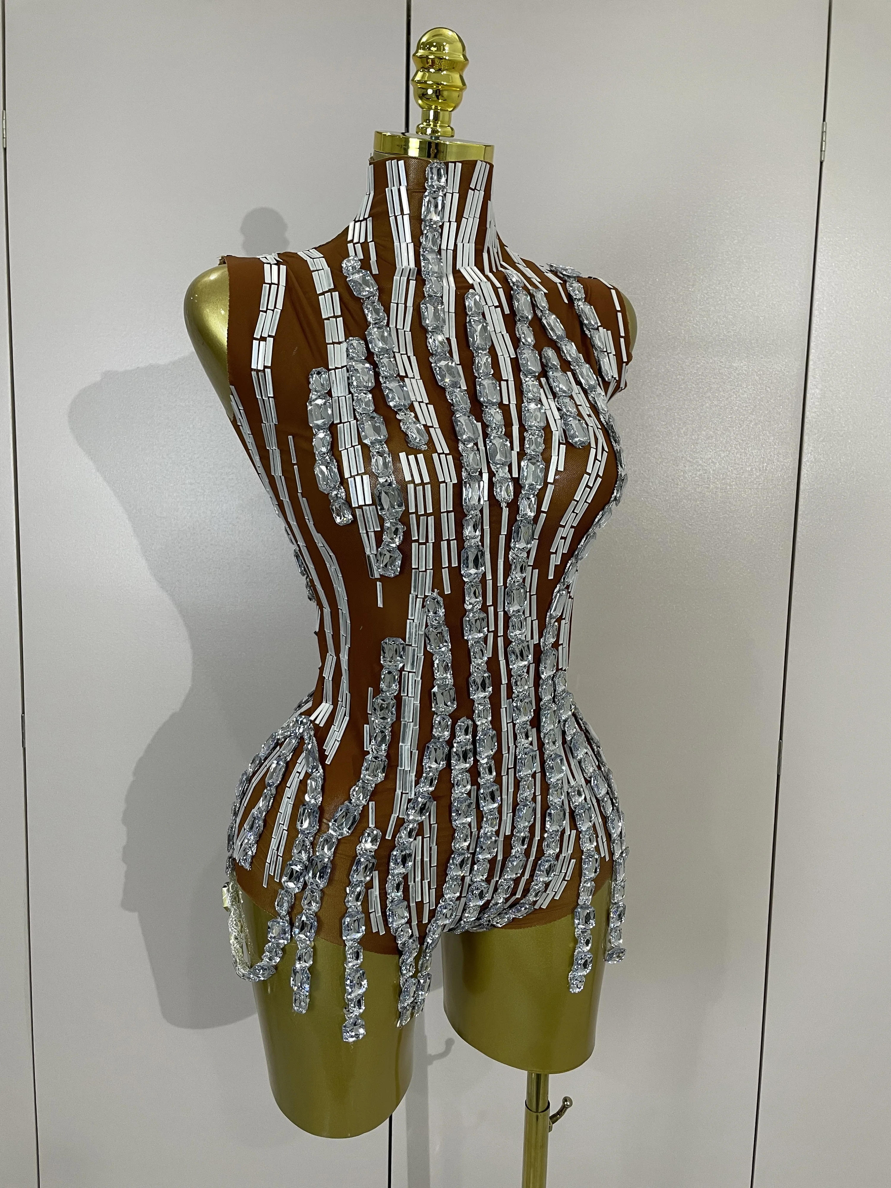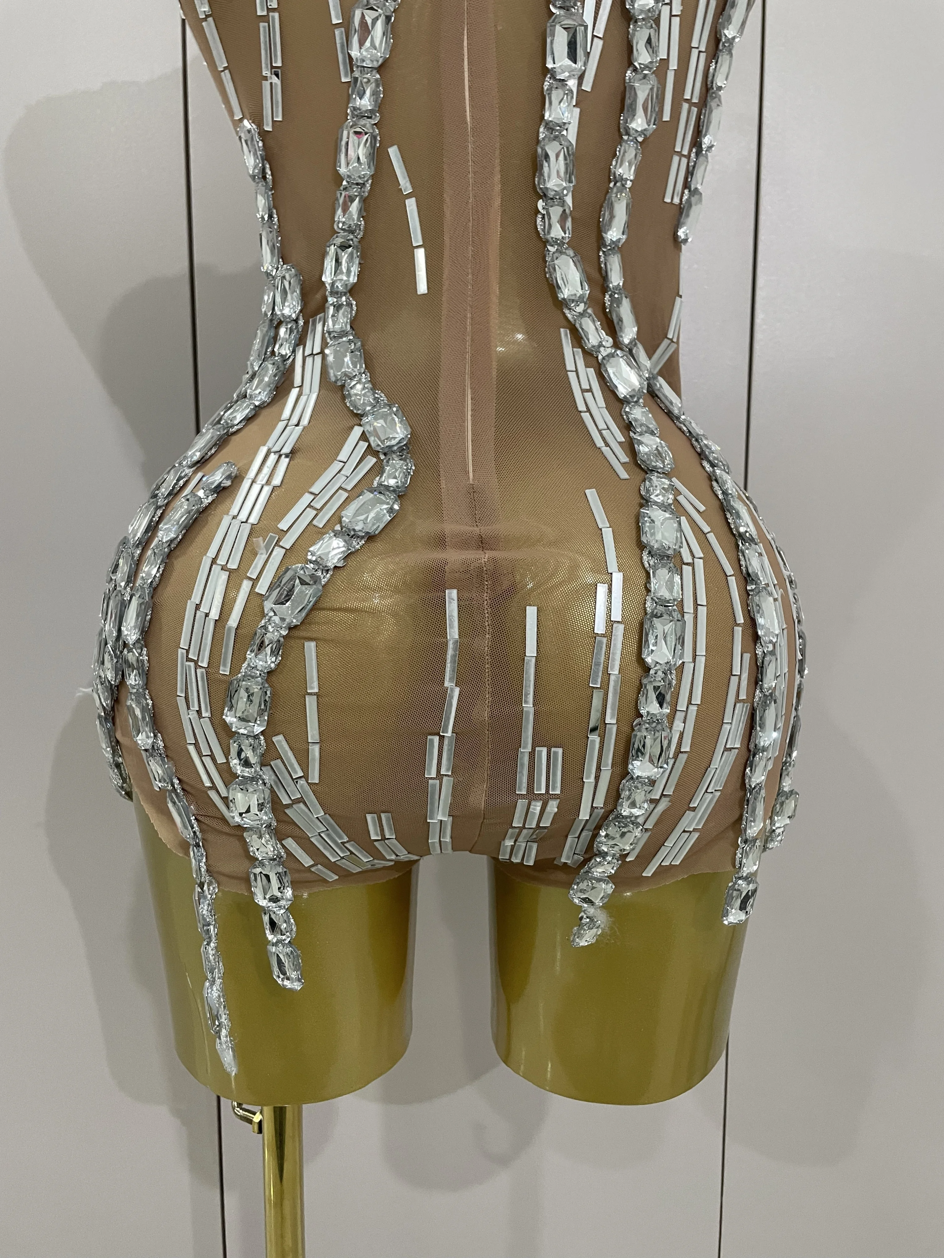Sparkly Rhinestone Chain Sexy Transparent Sleeveless Bodysuit 2025Women Party Nightclub Team Performance Costume Show Stage Wear