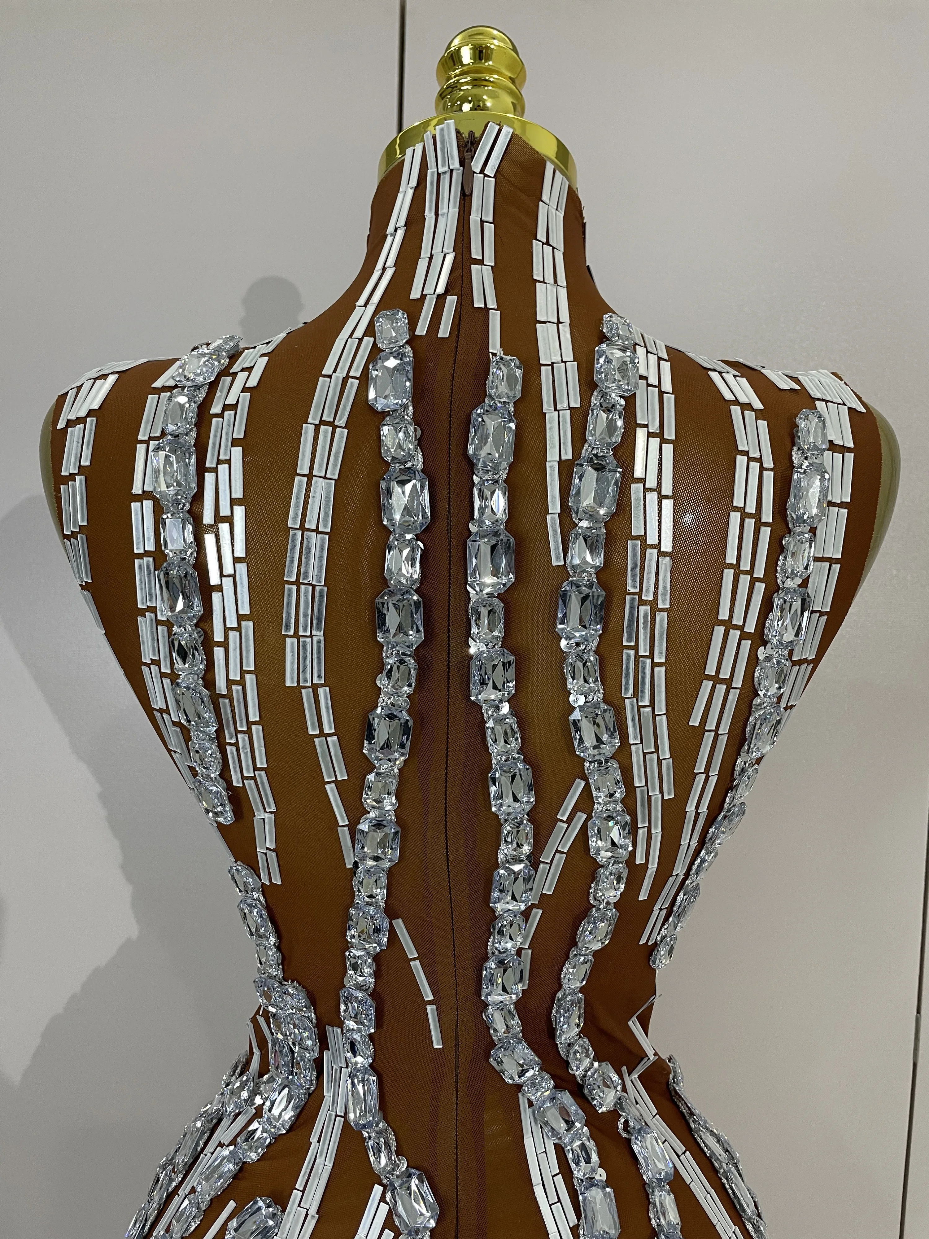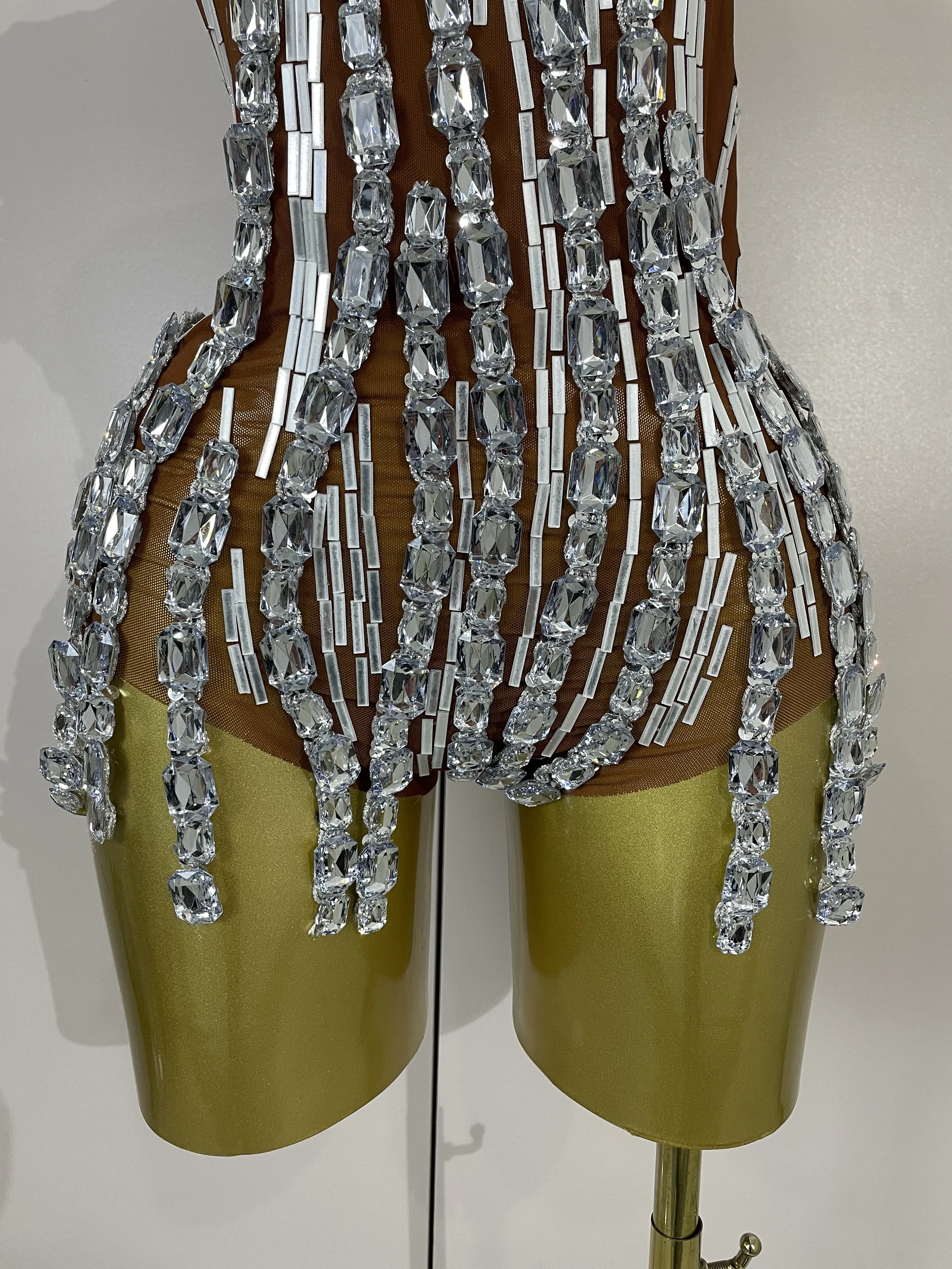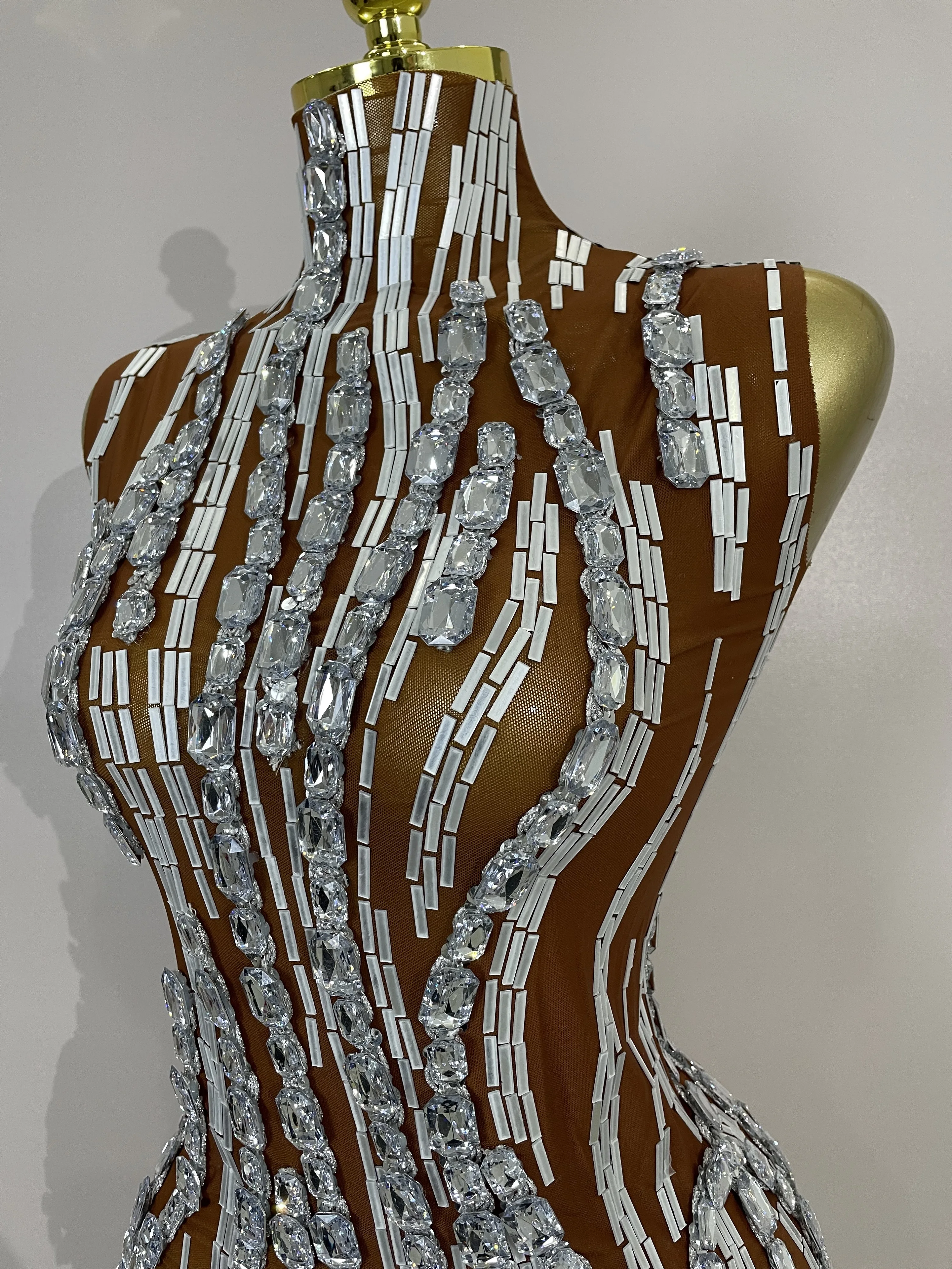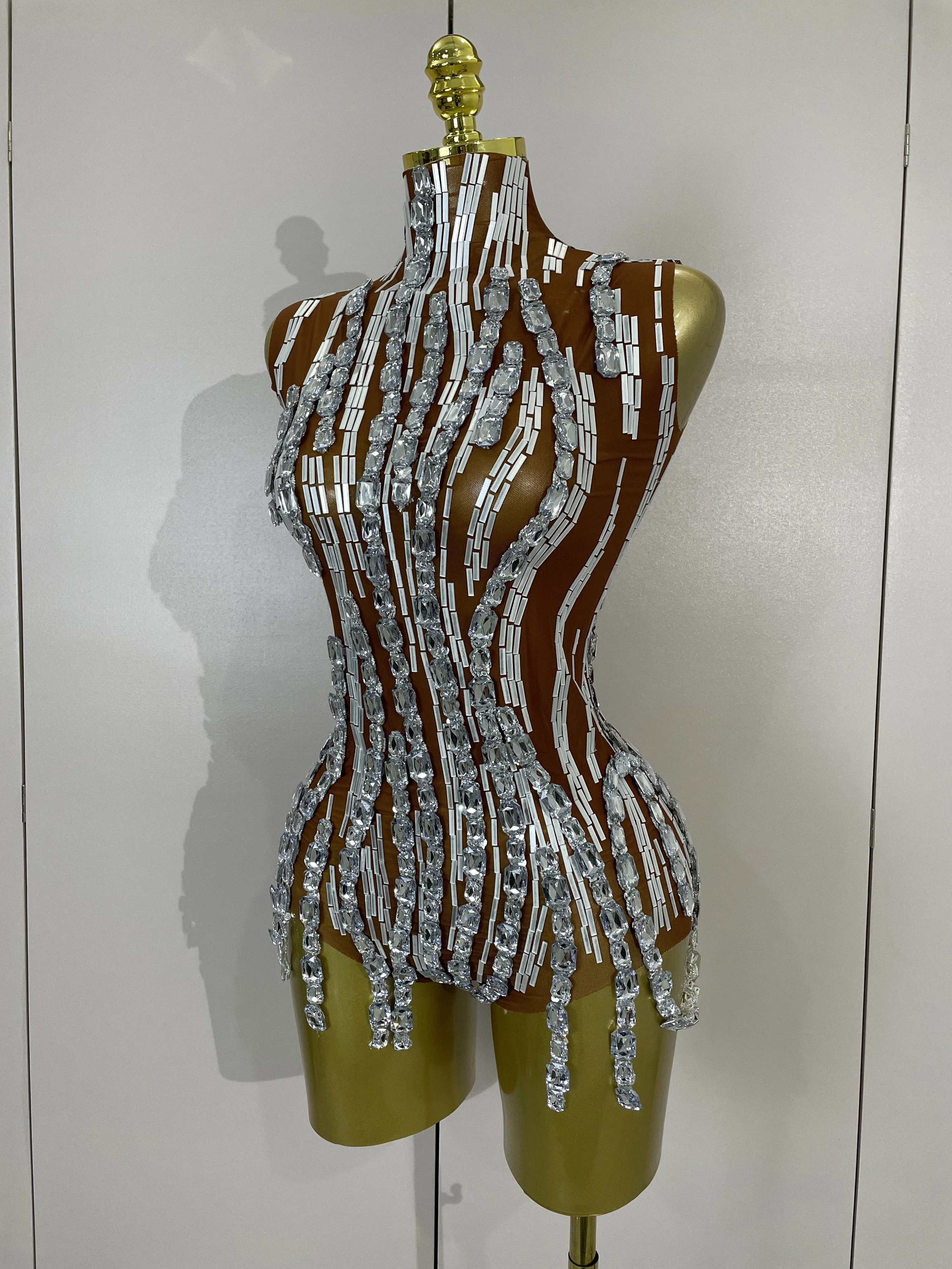 Sparkly Rhinestone Chain Sexy Transparent Sleeveless Bodysuit 2025Women Party Nightclub Team Performance Costume Show Stage Wear