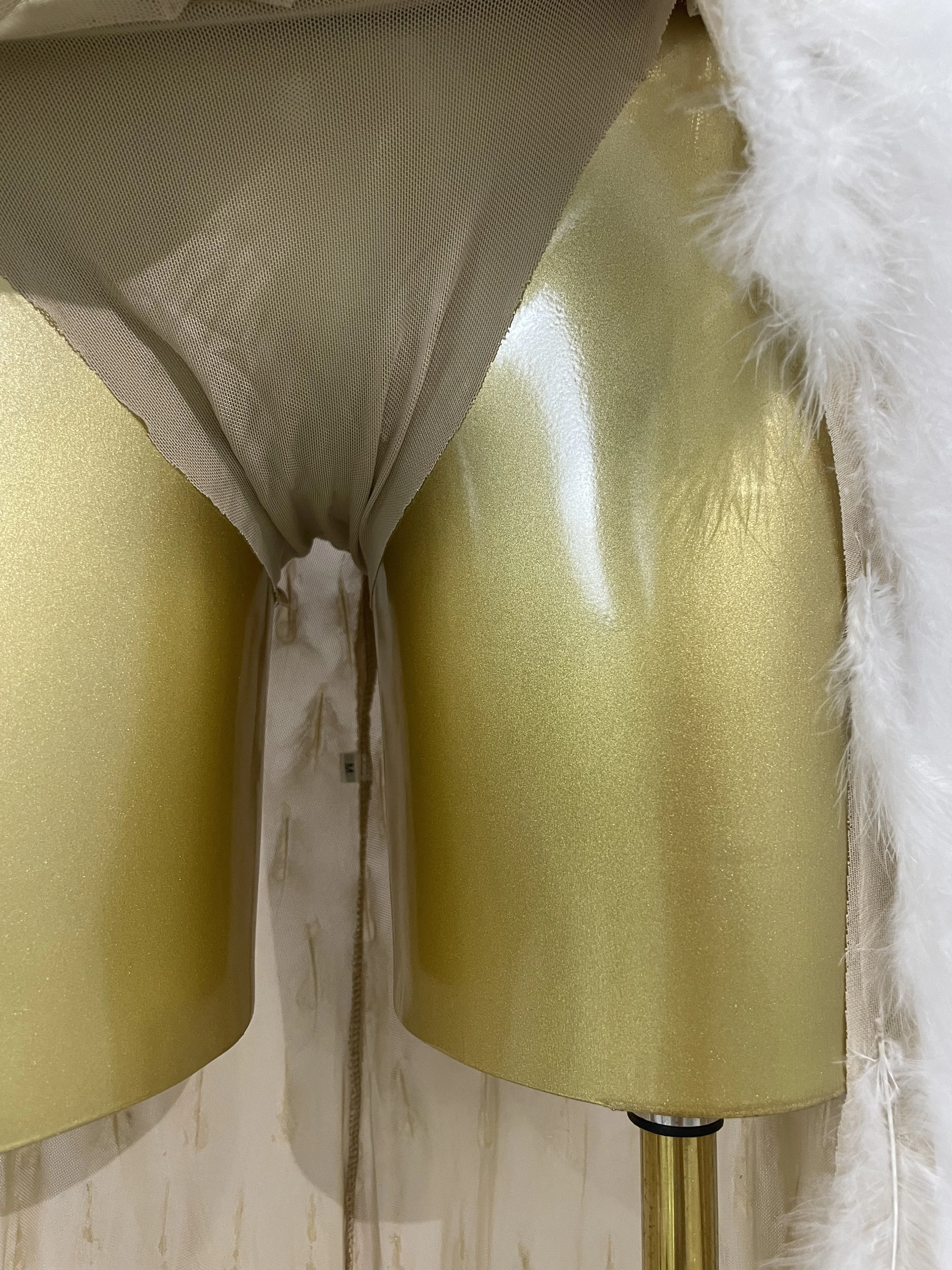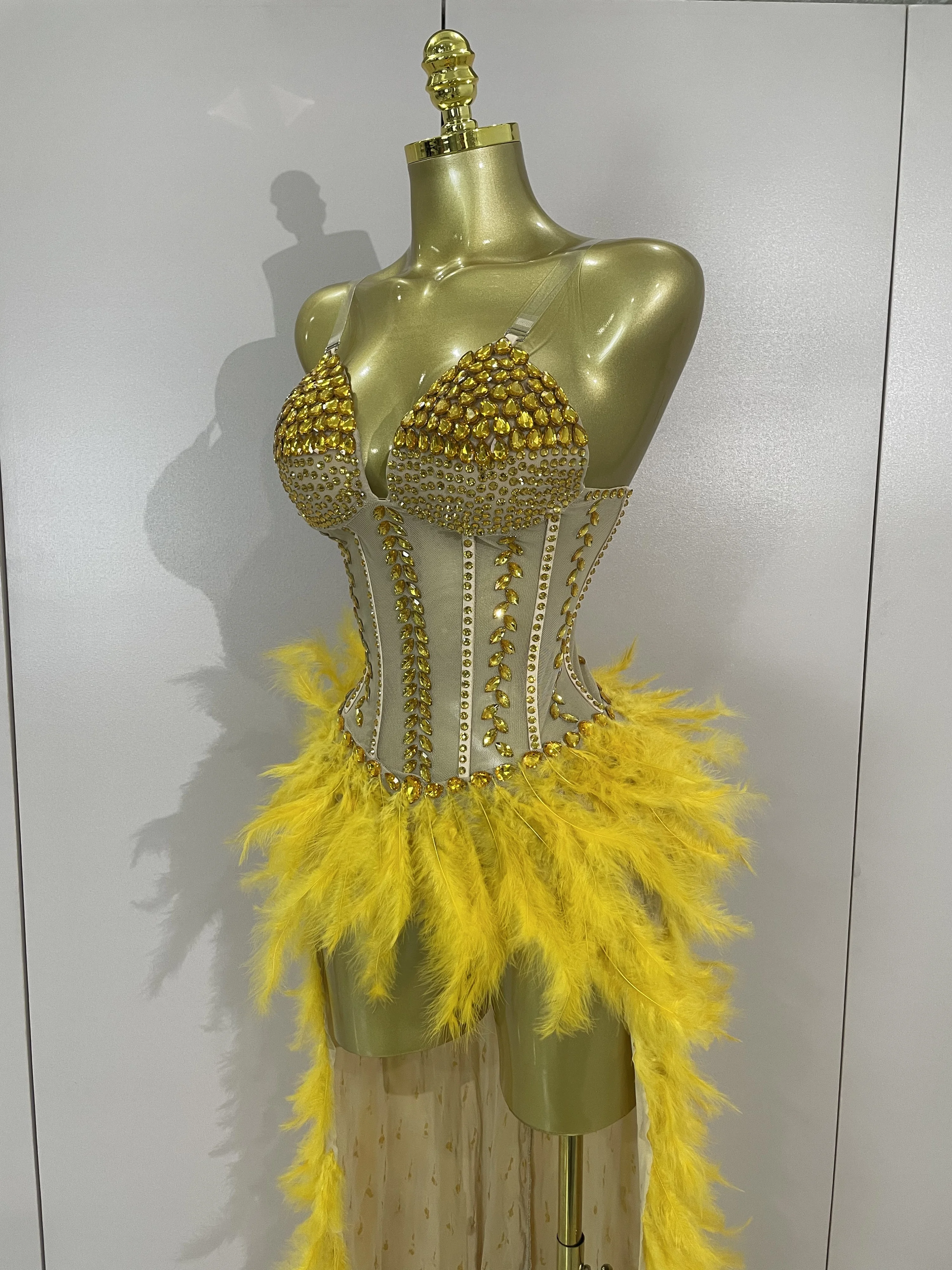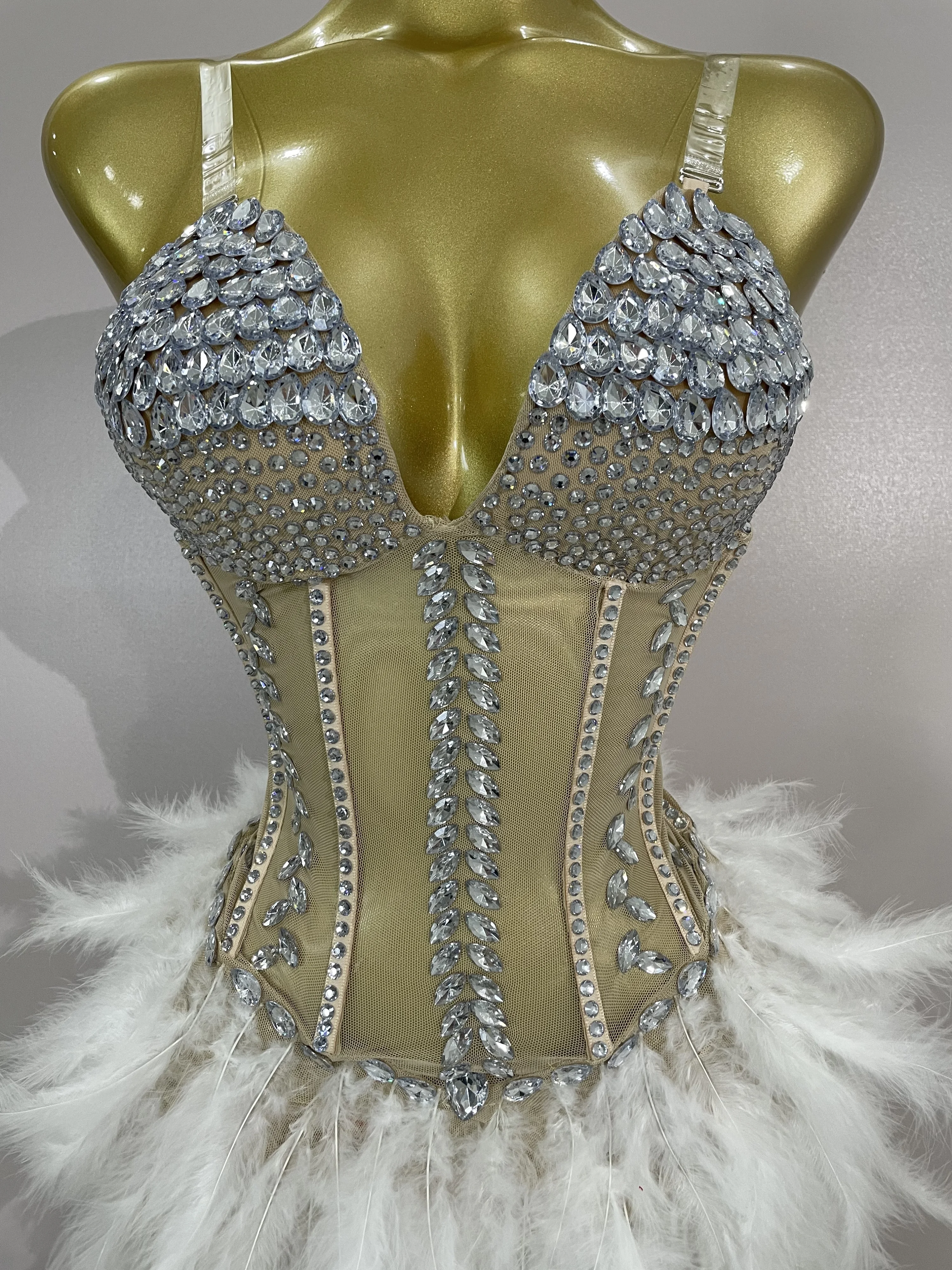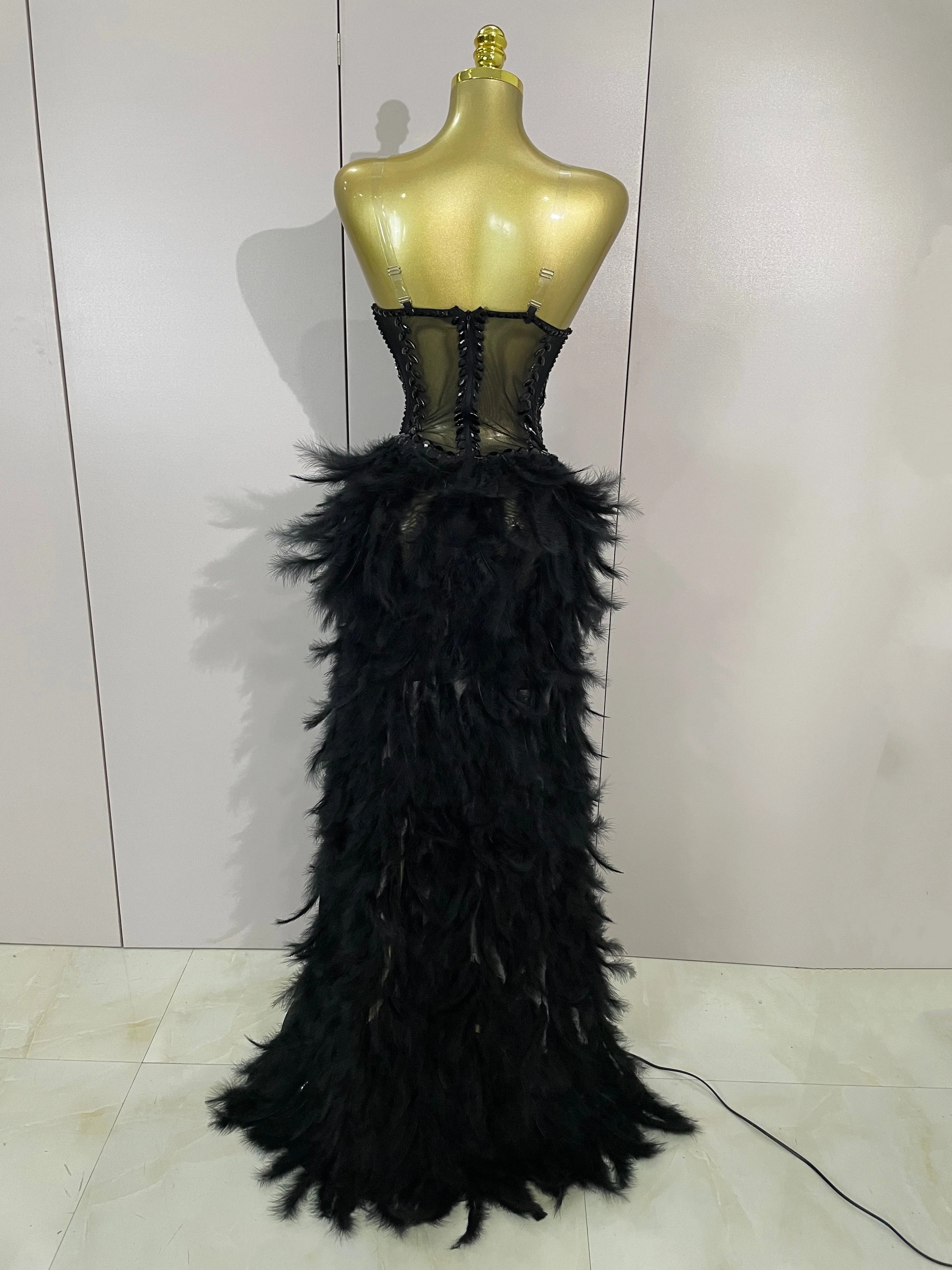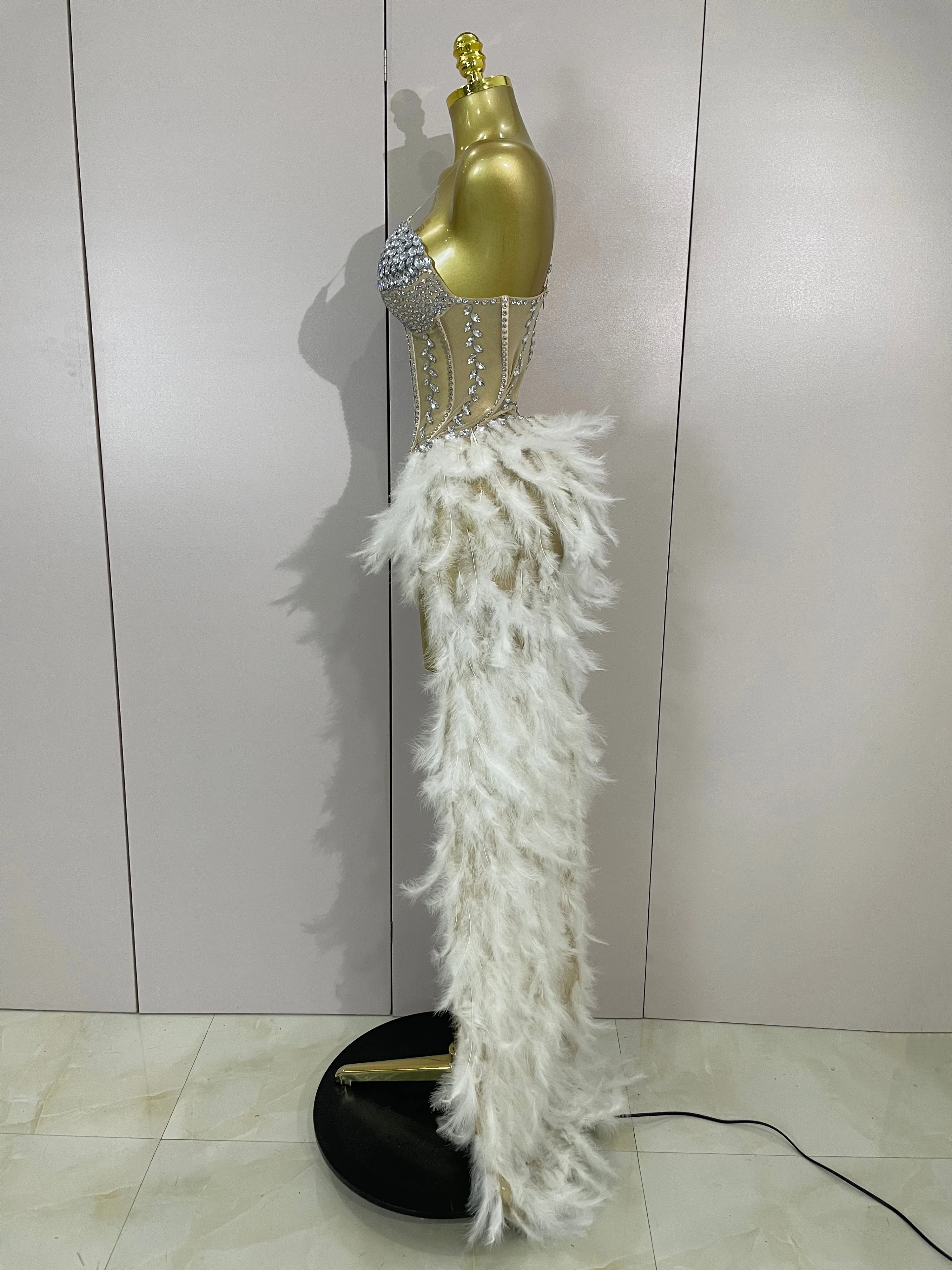 Sparkly Rhinestones Feathers Long Tail Bodysuits Sexy Mesh Transparent Stage Dress Evening Party Celebrate Luxury Birthday Dress