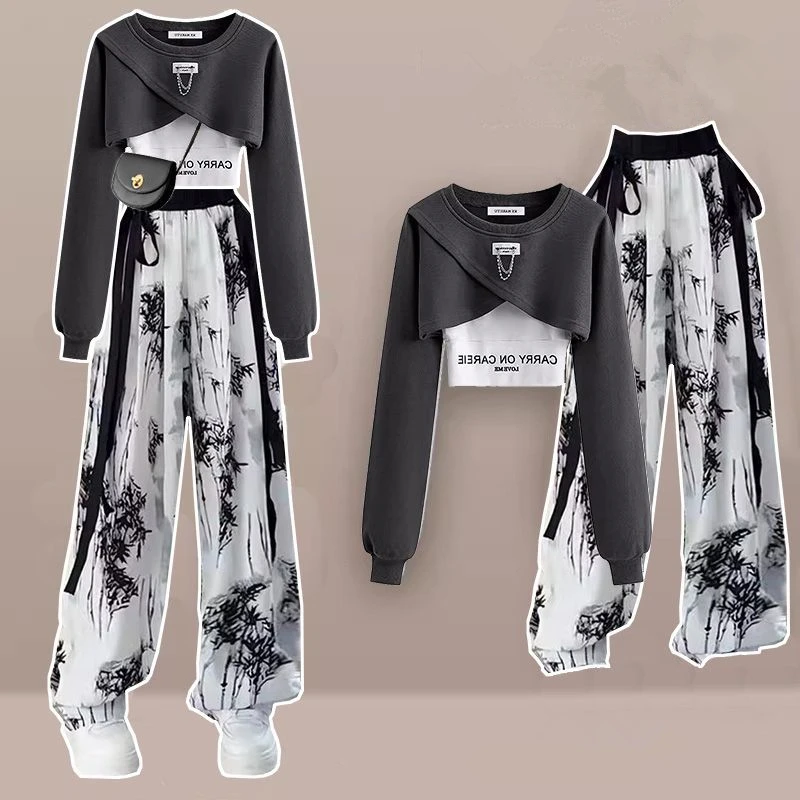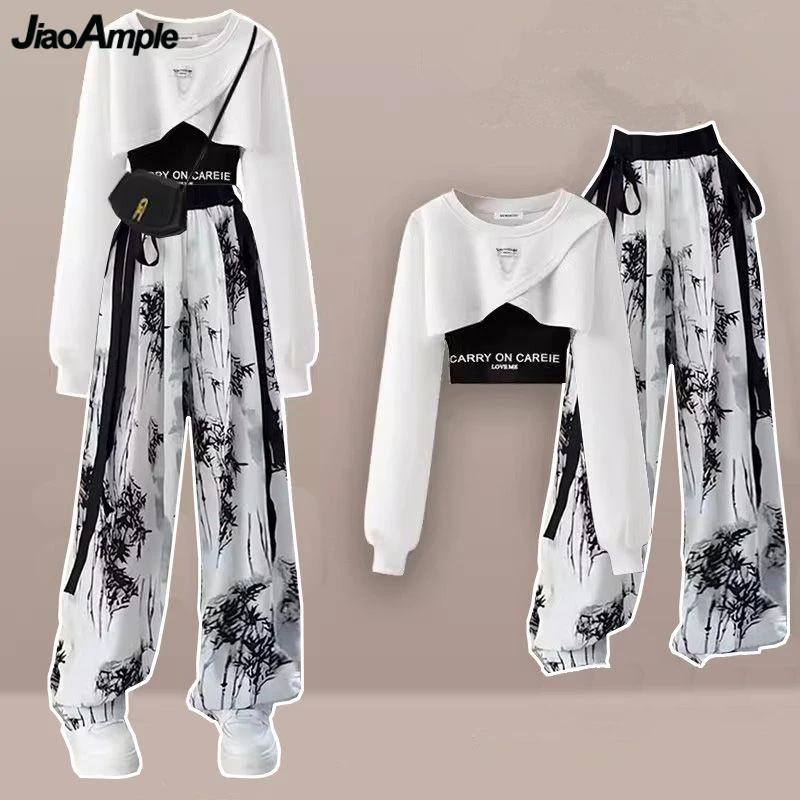 Spring Autumn Women Fashion Crop Sweatshirt Letter Sling Print Pants 1 or 3 Piece Set Lady Cool Streetwear Outfits Tops Trousers