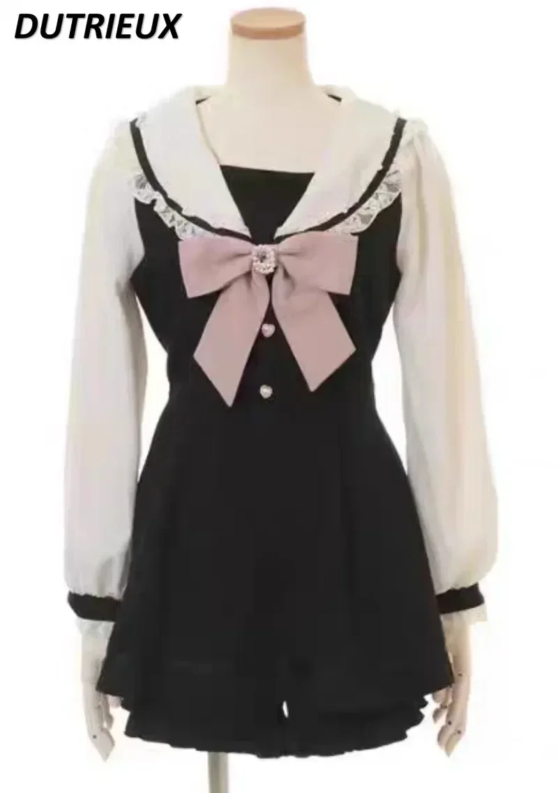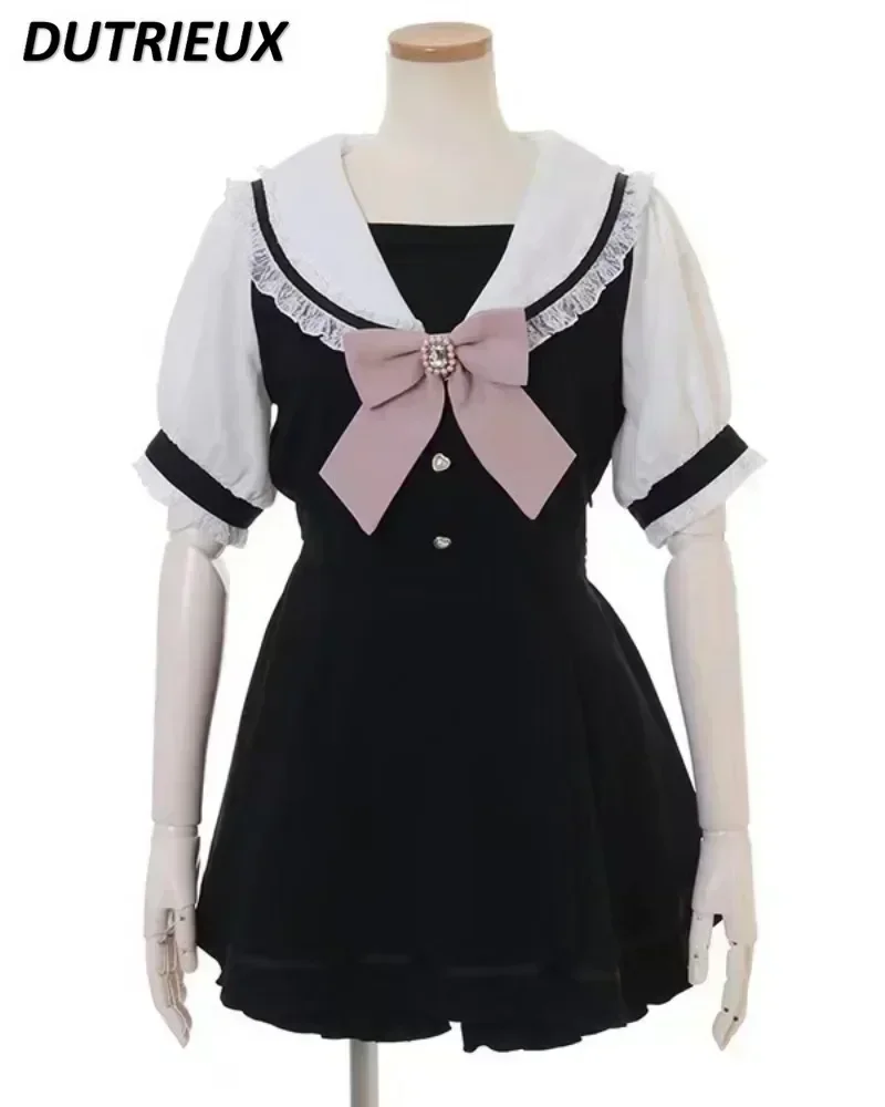 Spring Summer Sweet Lolita Bow Dress Shorts Suit Two-Piece Set Rojita Japanese Sailor Collar Slimming Short Dress for Women