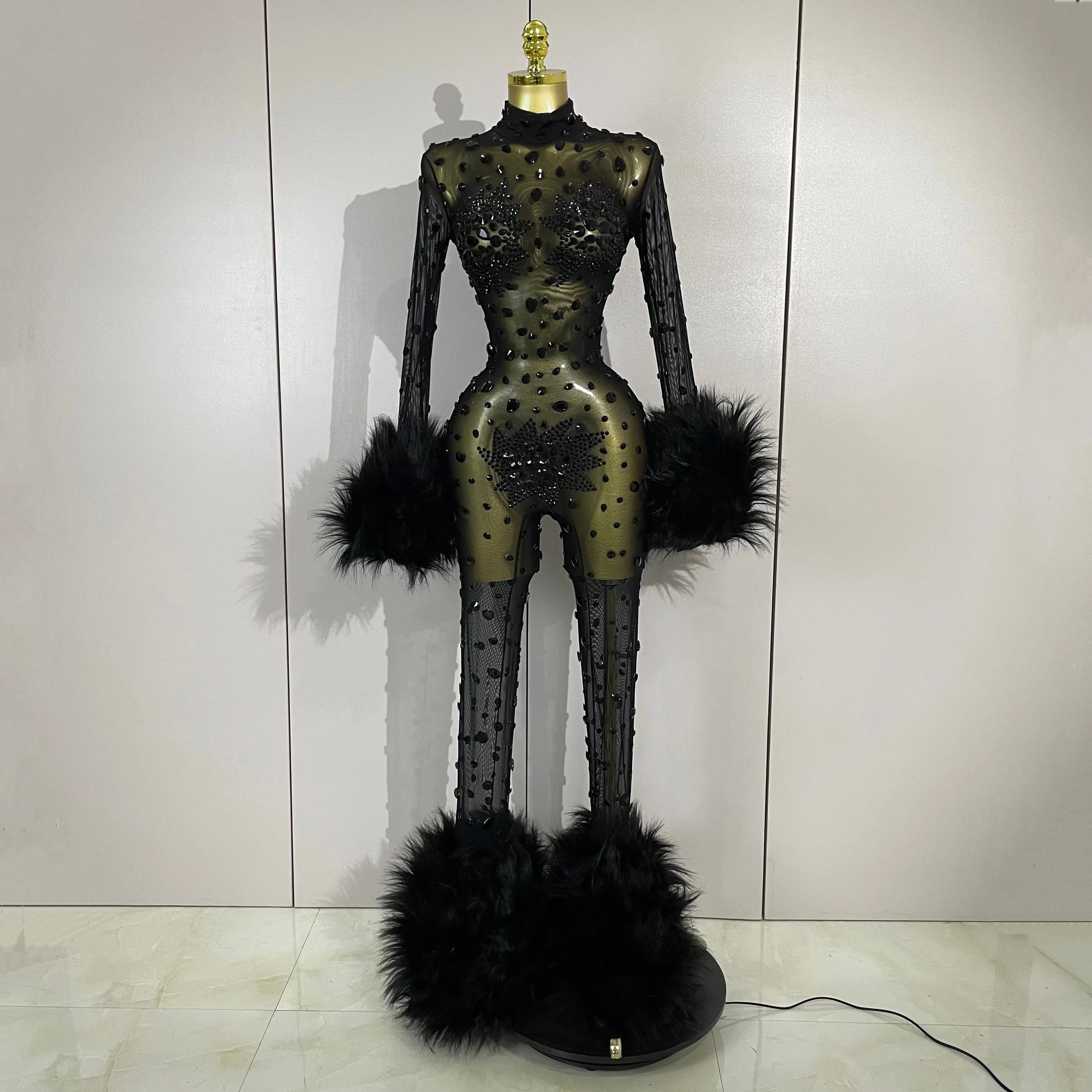 STOCK Luxury Diamond Black Mesh Transparent Stretchy Long Sleeve Jumpsuit Women Sexy Performance Singer Costume Nightclub Outfit