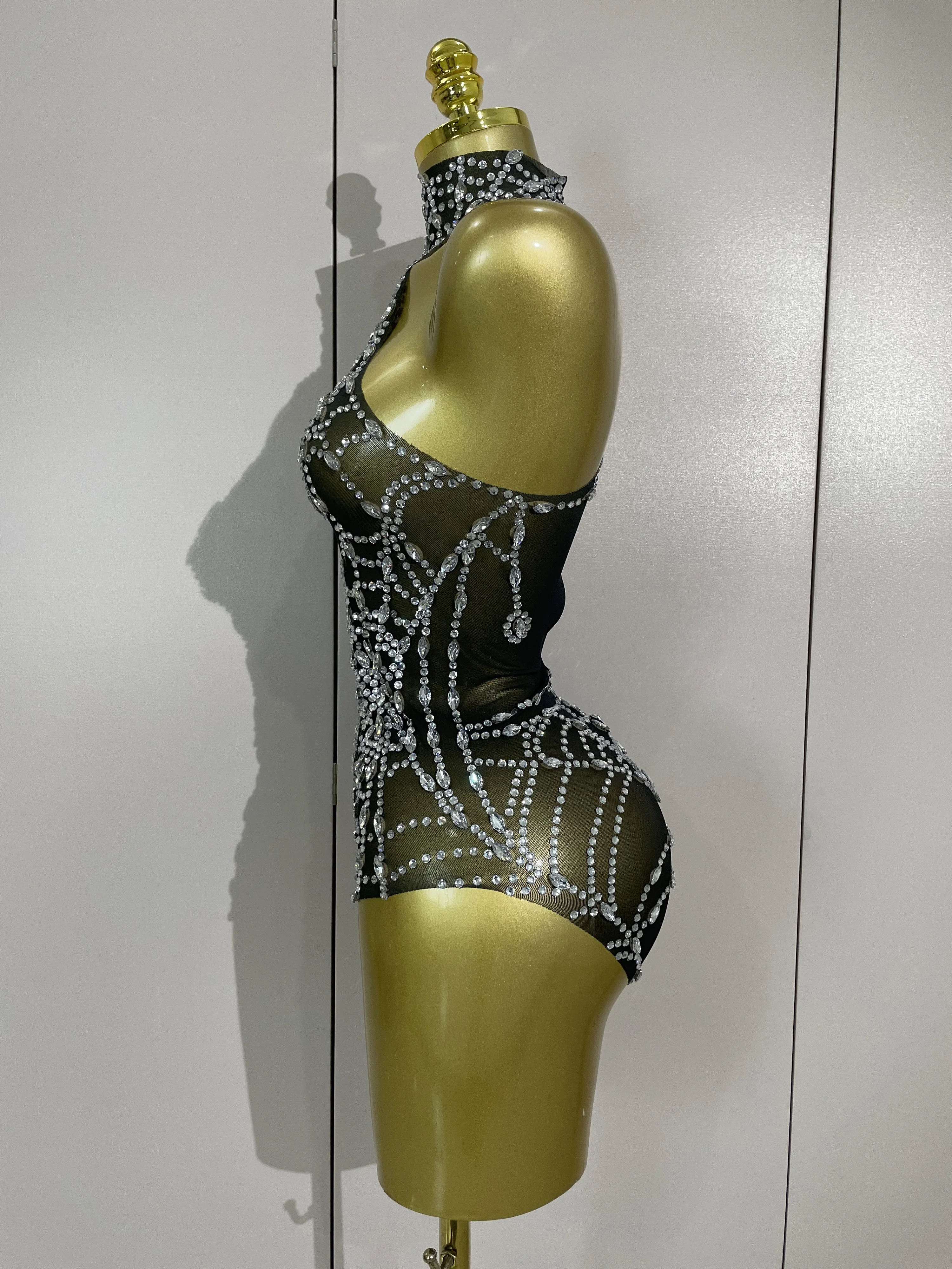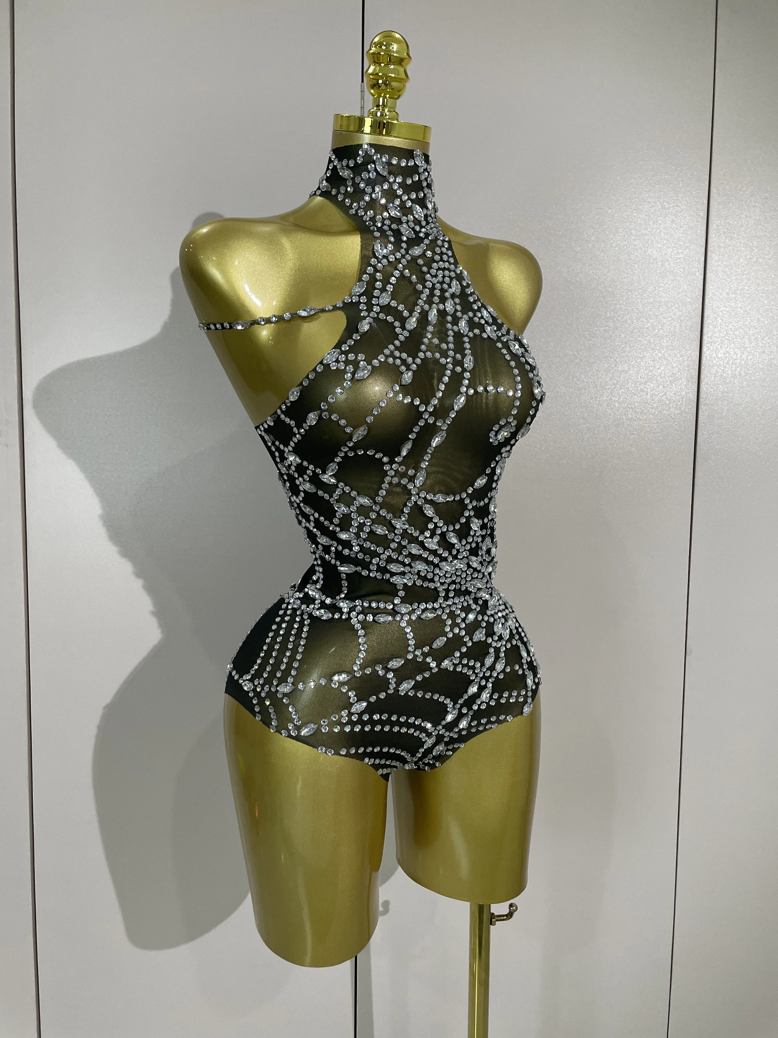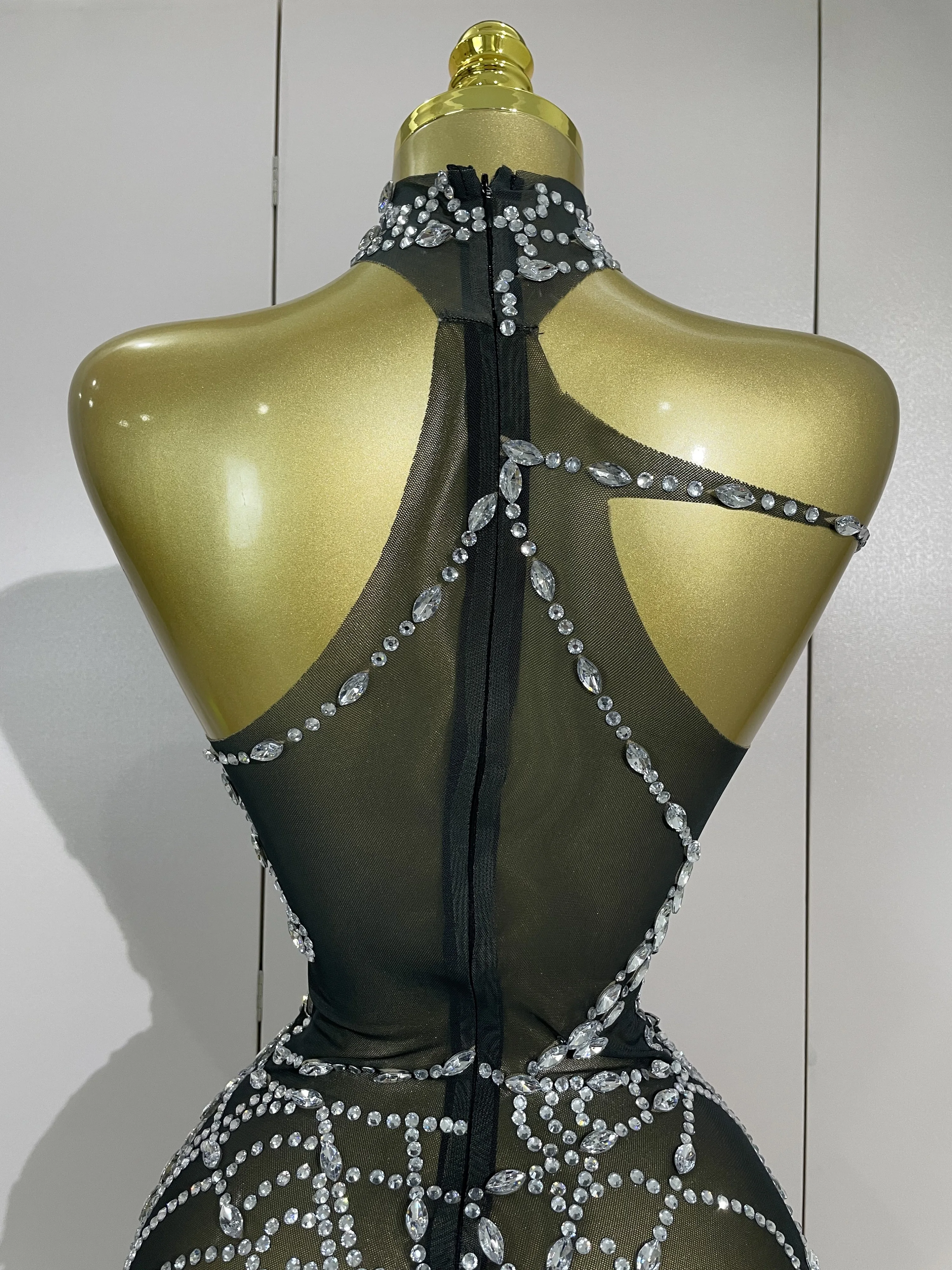STOCK New Sparkly Diamond Sexy Mesh Stretch Bodysuits Women Evening Nightclub Bar Party Show Gogo Dancer Clothing Stage Costume
