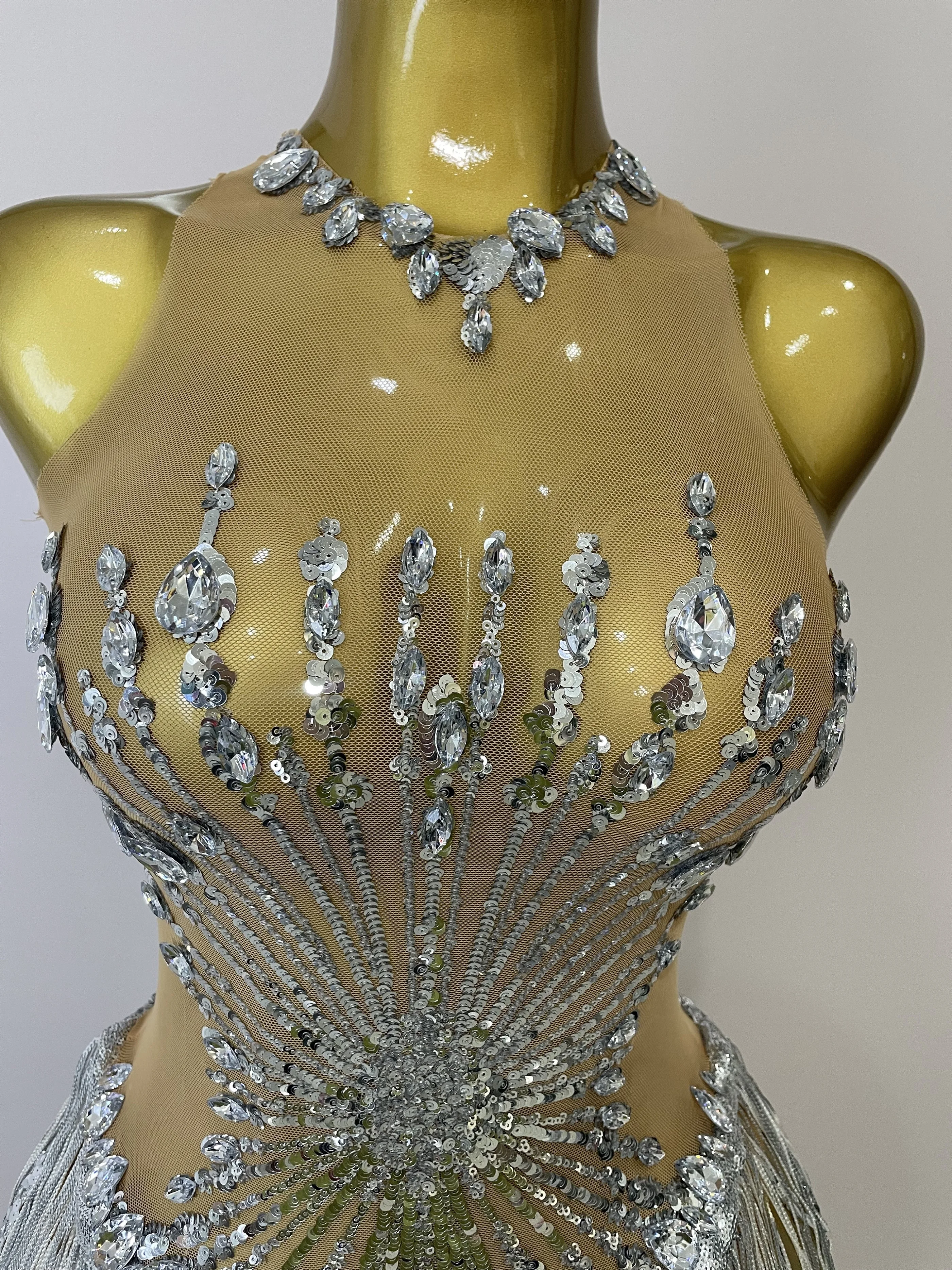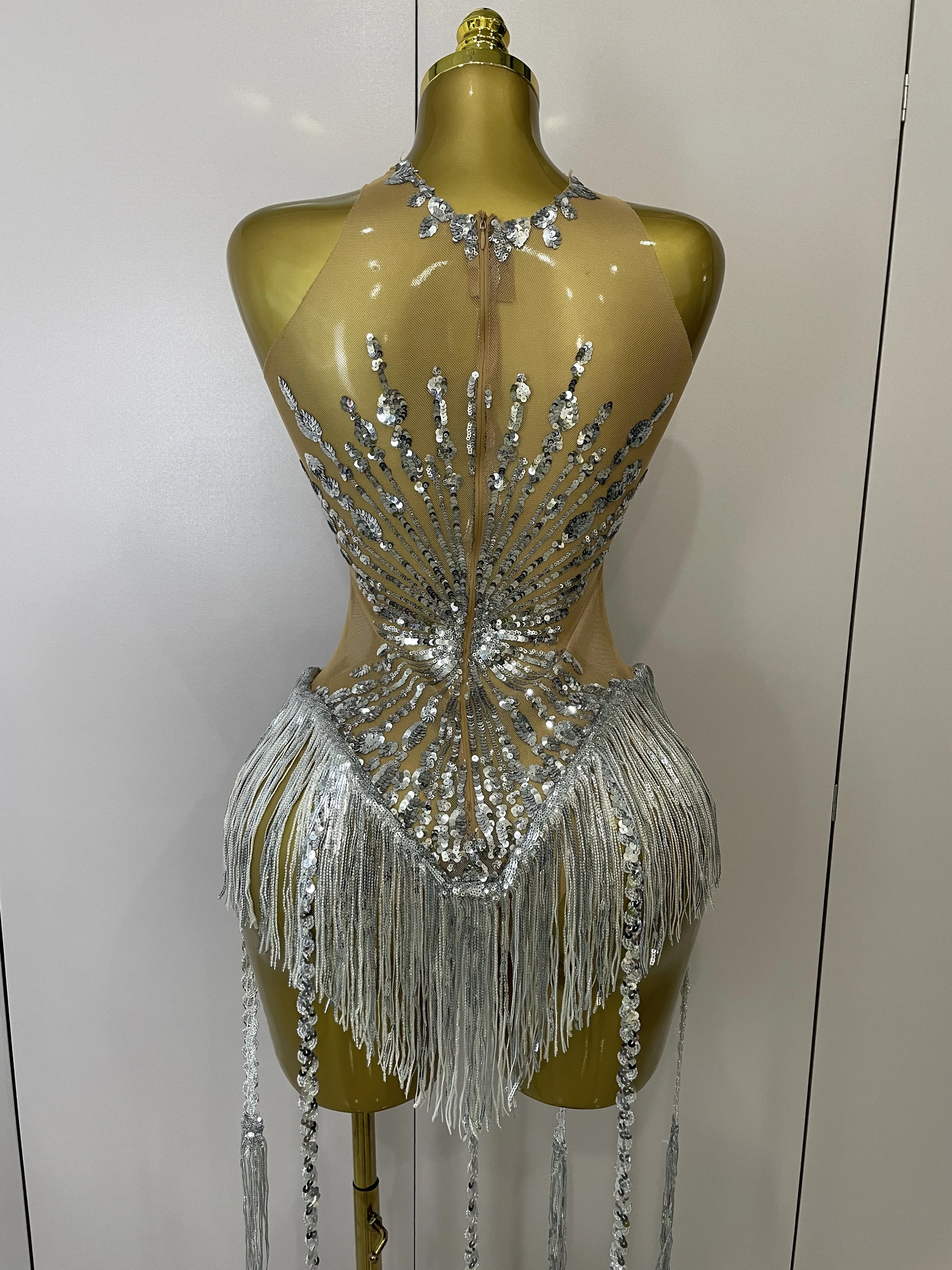 STOCK Sliver Sequins Shining Diamonds Sexy Mesh Long Tassel Bodysuit Women Nightclub Party Birthday Stage Performance Costume
