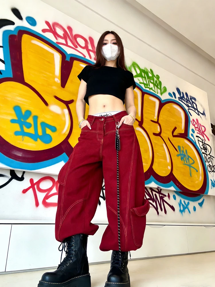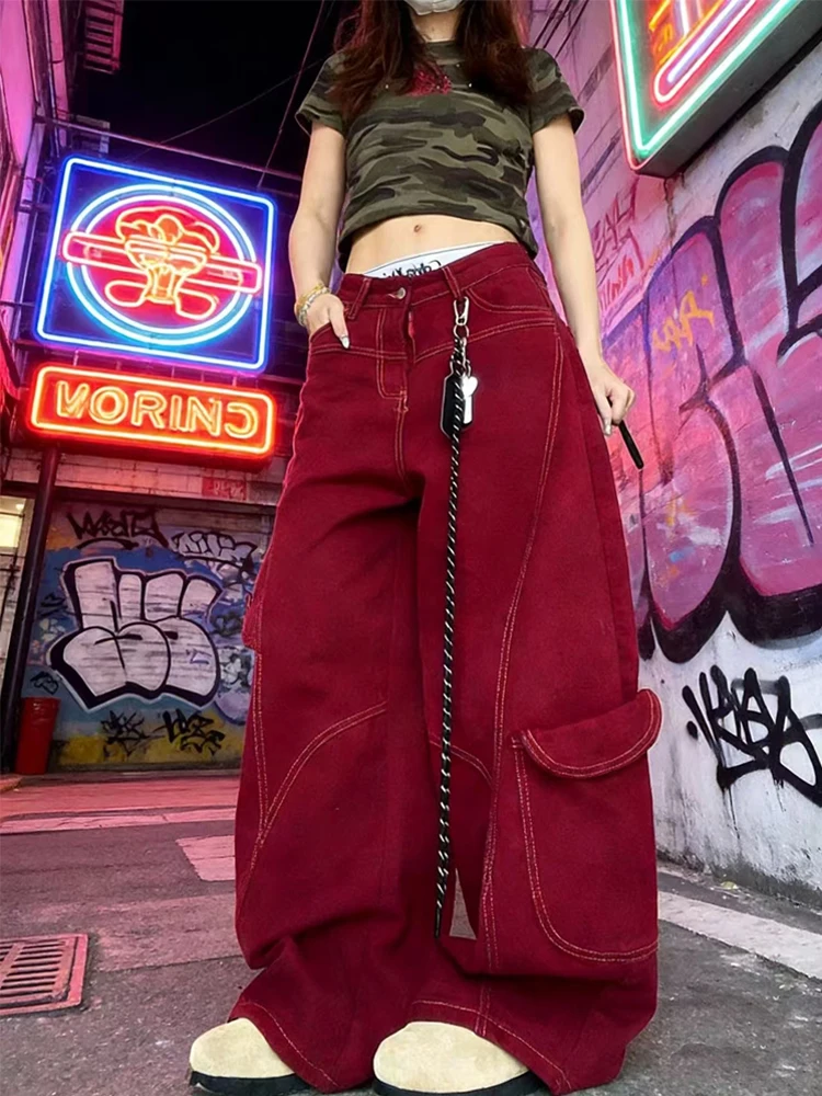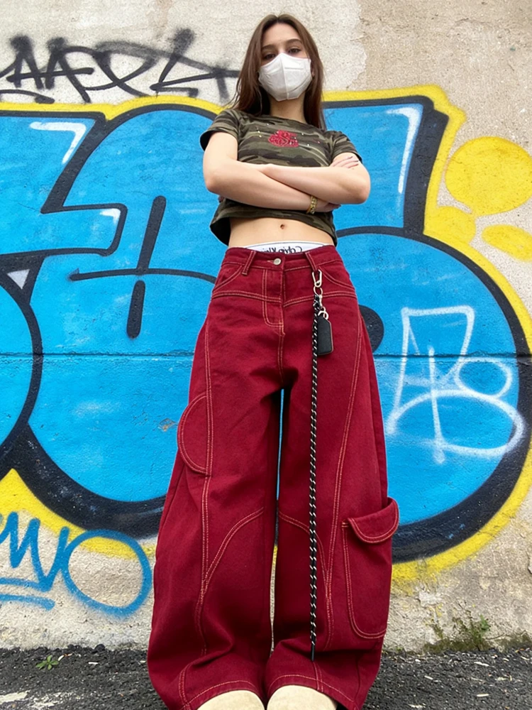 Street Vintage Jeans New Y2K Harajuku Wash Red Streetwear Baggy Jeans Denim Pants Mens Womens High Waist Wide Trousers 2025