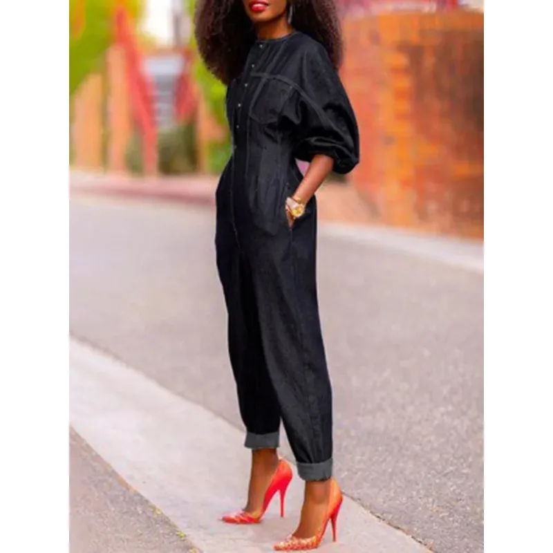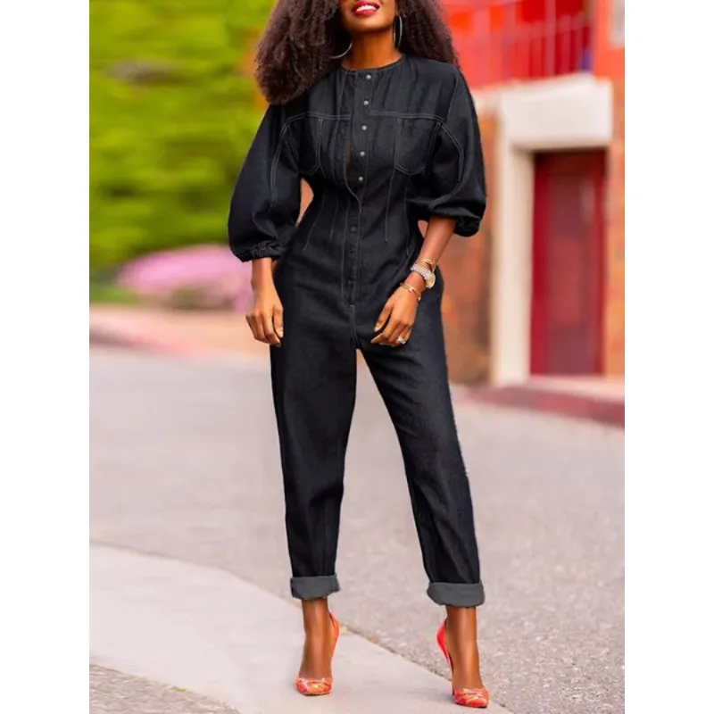 Streetwear Denim Jumpsuits Women 2026 Vintage Puff Sleeve O-Neck Button High Waist Pockets Bright Line Decoration Jumpsuit