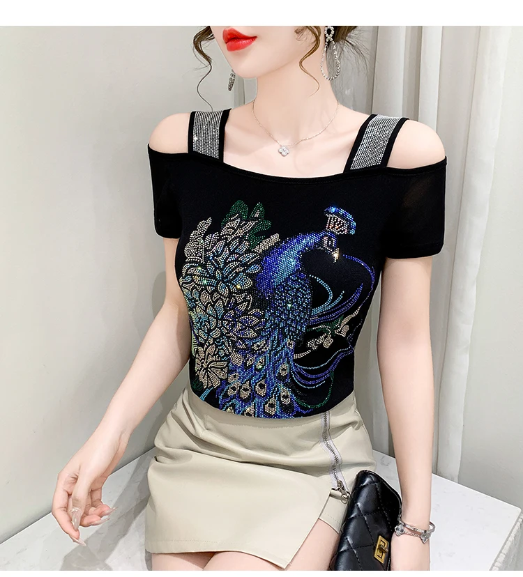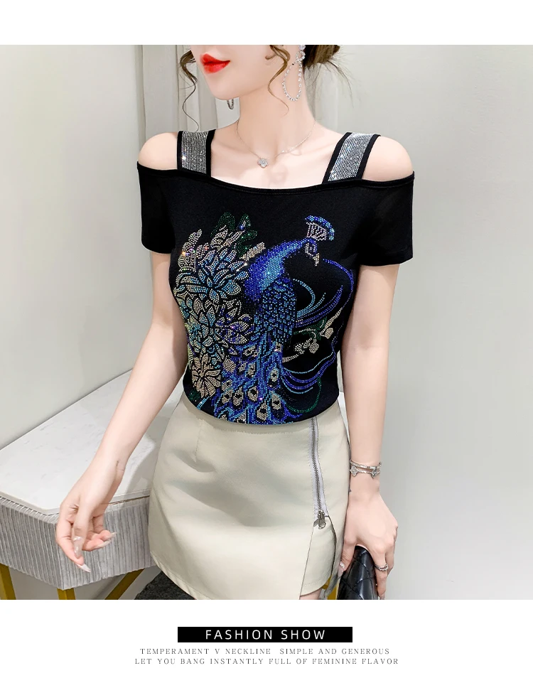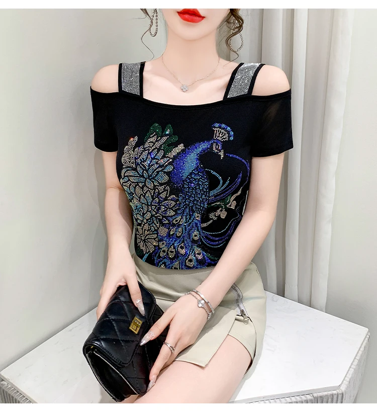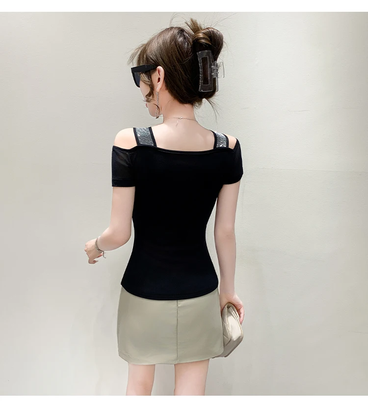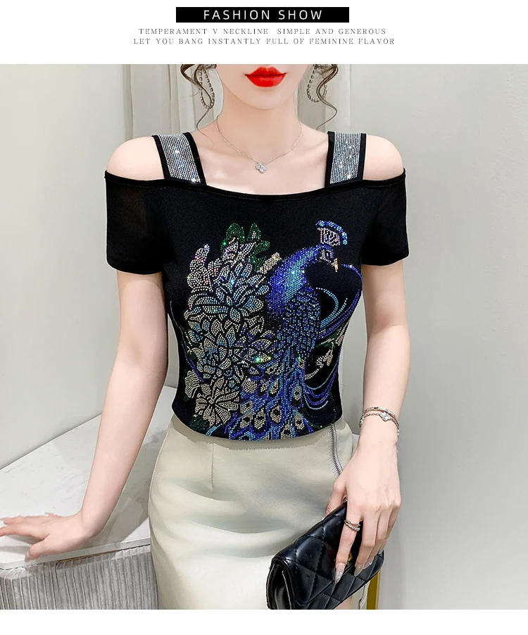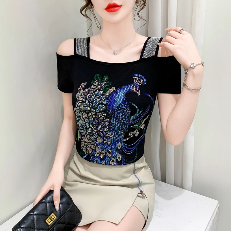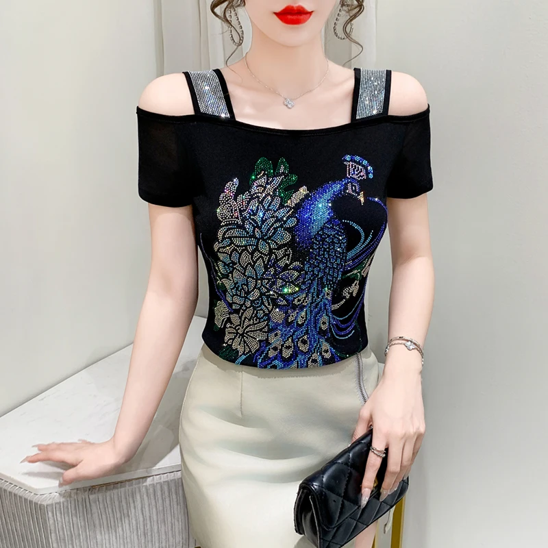 Streetwear Sexy Off-Shoulder Summer T-shirt for Women High Quality Luxury Shiny Diamond Tees Slim Fit Girl Top European Clothing