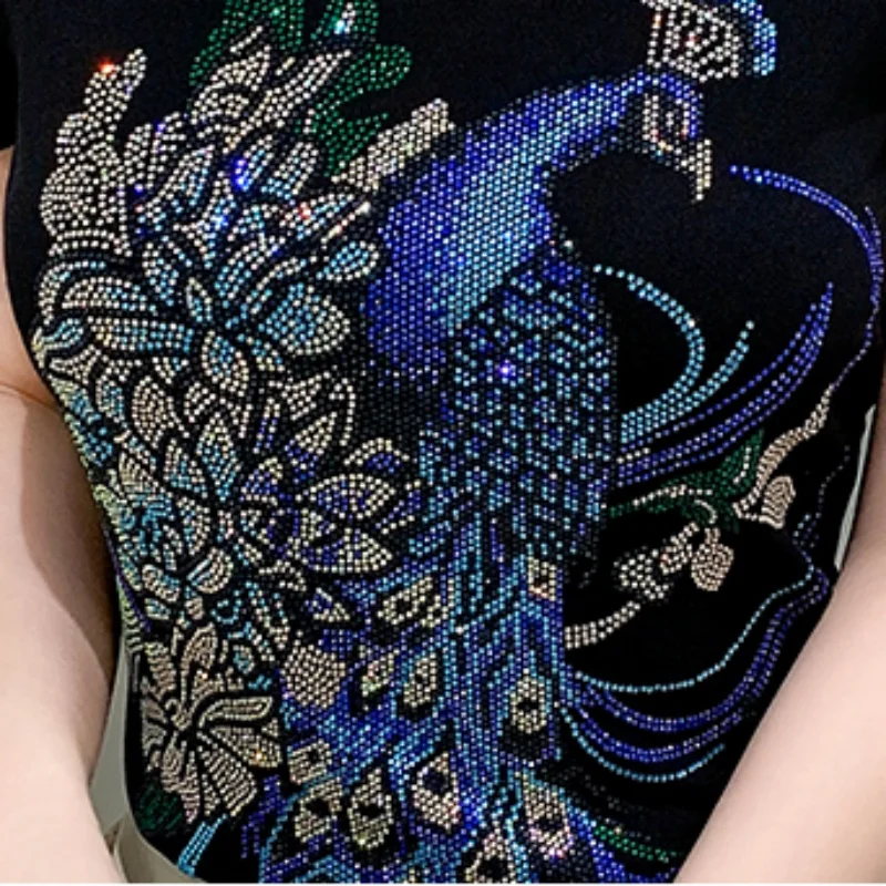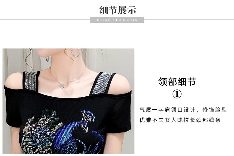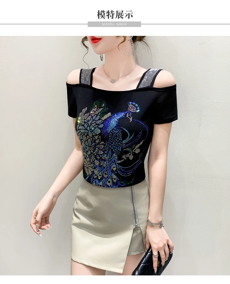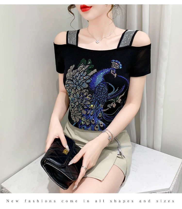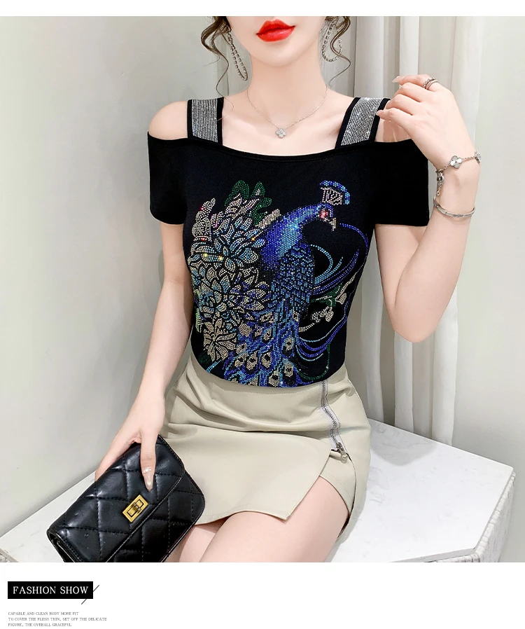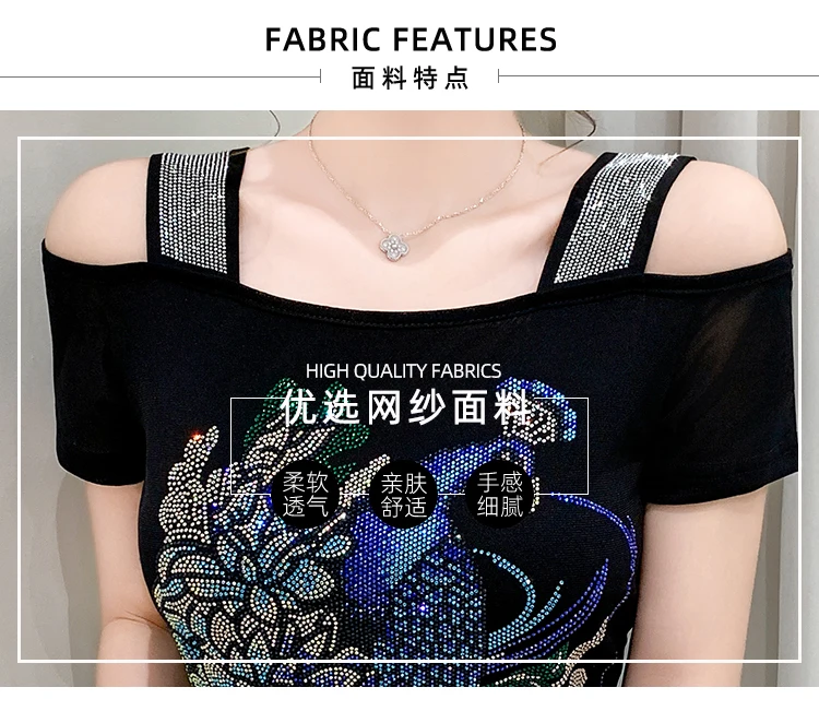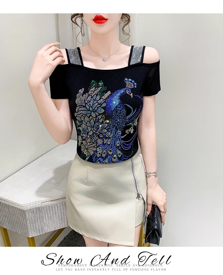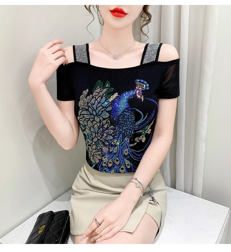 Streetwear Sexy Off-Shoulder Summer T-shirt for Women High Quality Luxury Shiny Diamond Tees Slim Fit Girl Top European Clothing