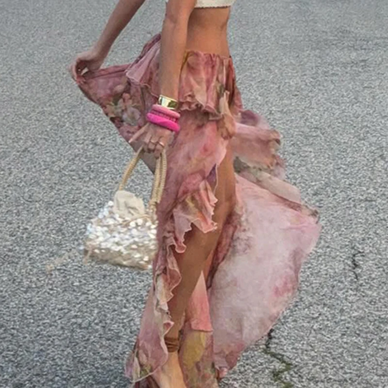 SUCHCUTE Y2K Vacation Floral Printed Long Skirts Holiday Beach Sexy Low Waist Aesthetics Lace Skirt Women Grunge Party Outfits