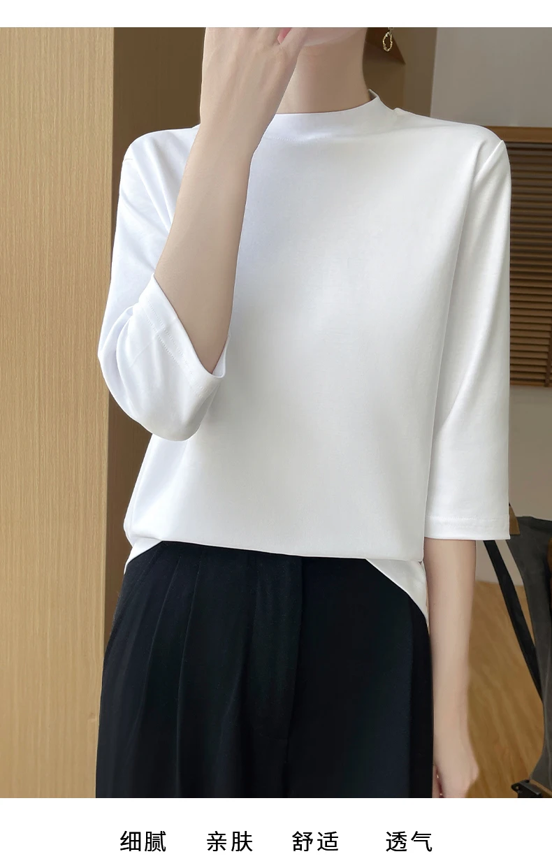 Summer And Autumn New 100% Cotton T-shirt Women’s Semi-High-Necked Cropped Sleeves Loose Solid Color Bottoming Top
