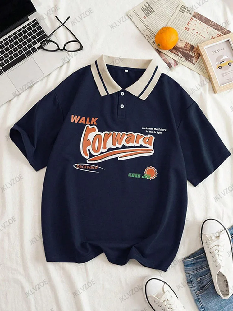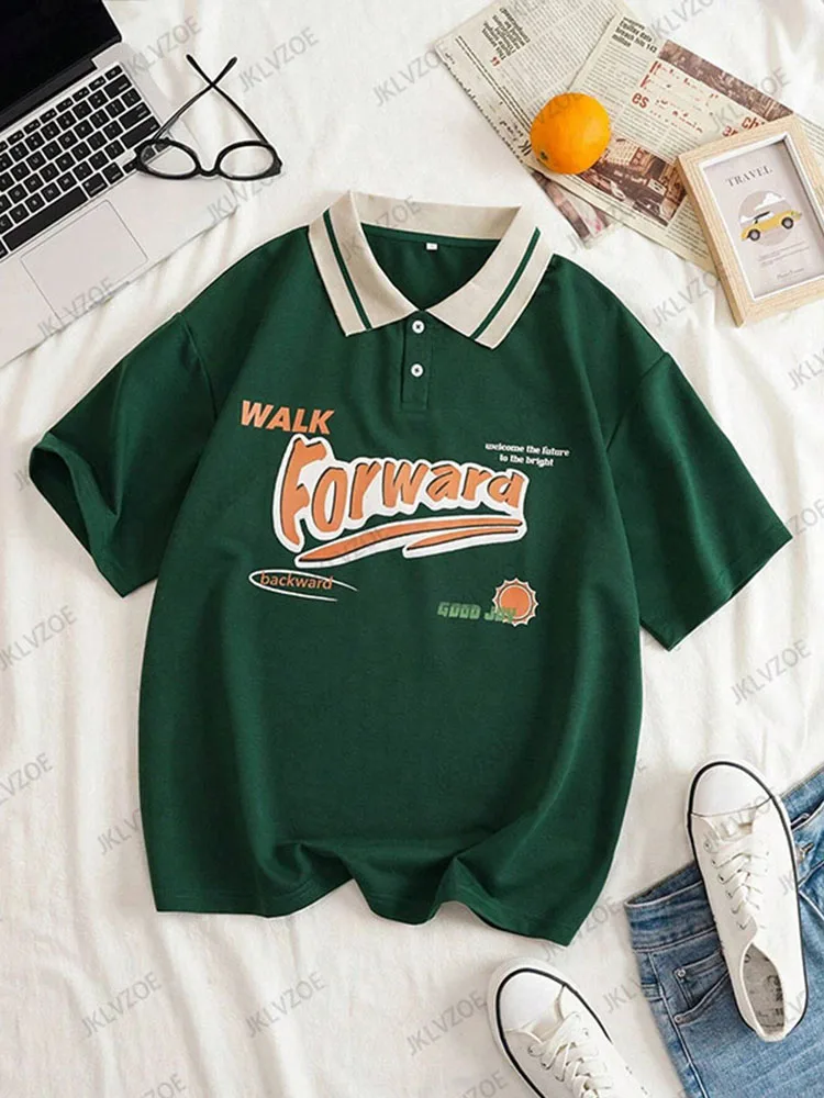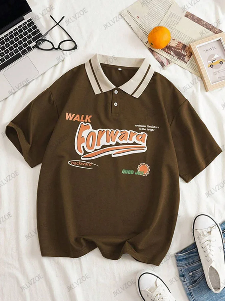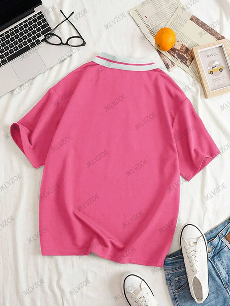 Summer Autumn Forward Print Graphic Contrast Color Loose Polo Shirt Short Sleeve Lapel T-shirt Women’s Oversized Unisex Tops