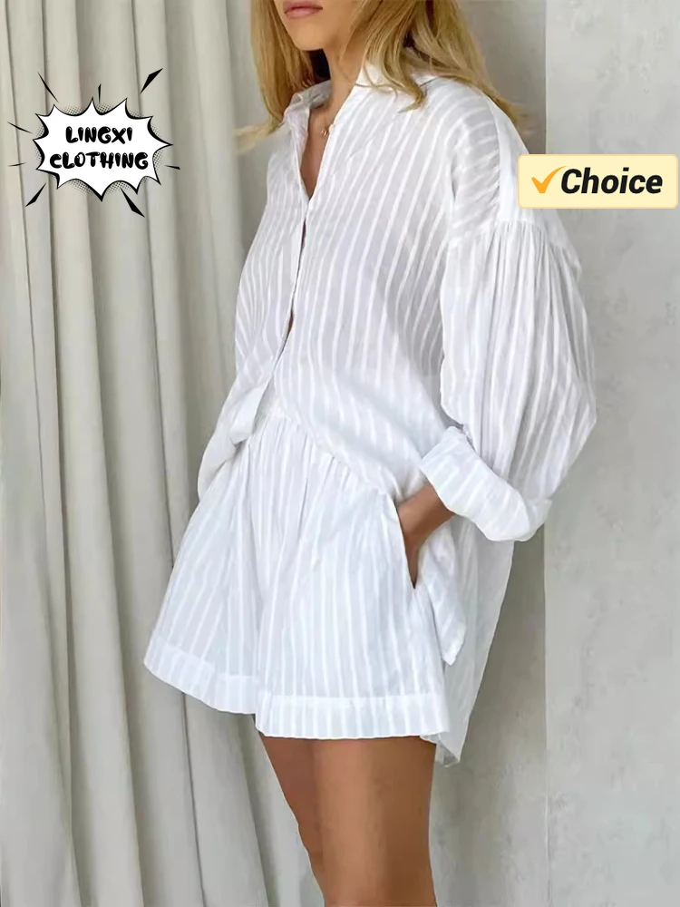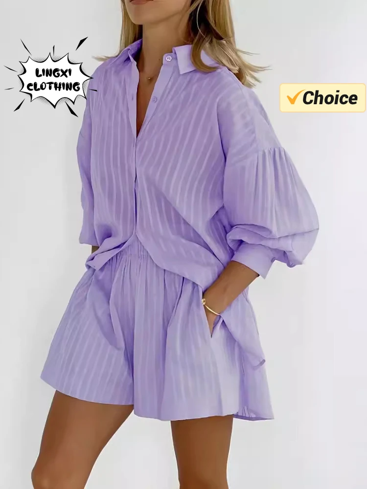 Summer Fashion New Matching Collection Women’s Solid Color Jacquard Shirt Shorts Two Piece Elegant Casual Sports Set