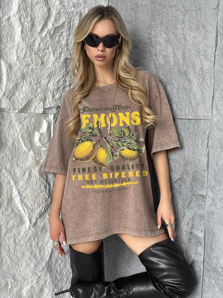 Summer Fresh Lemons Prints Washed T-Shirts Womens Cotton Oversized O-Neck Tops Street Vintage Short Sleeve Casual Woman Clothes