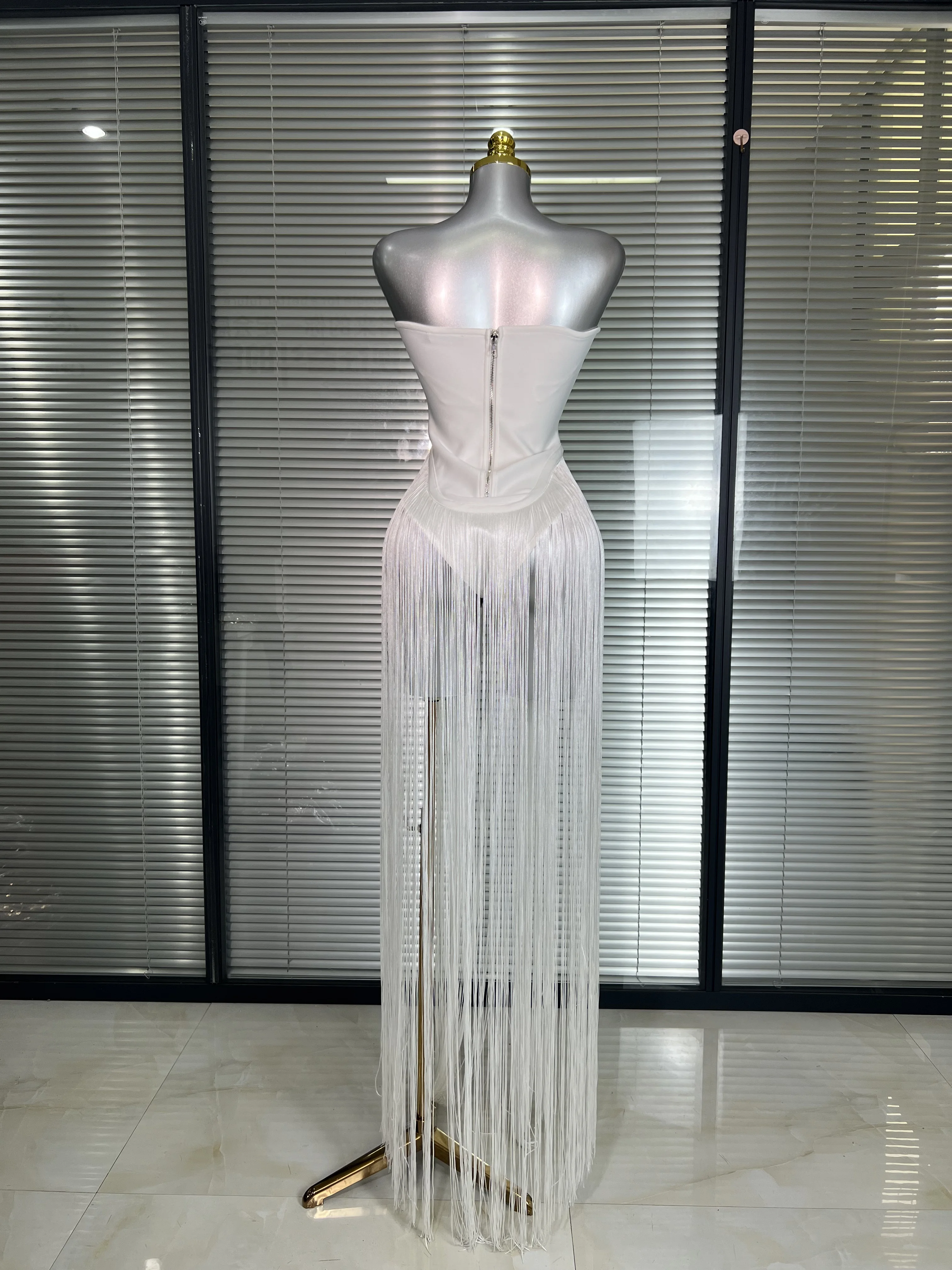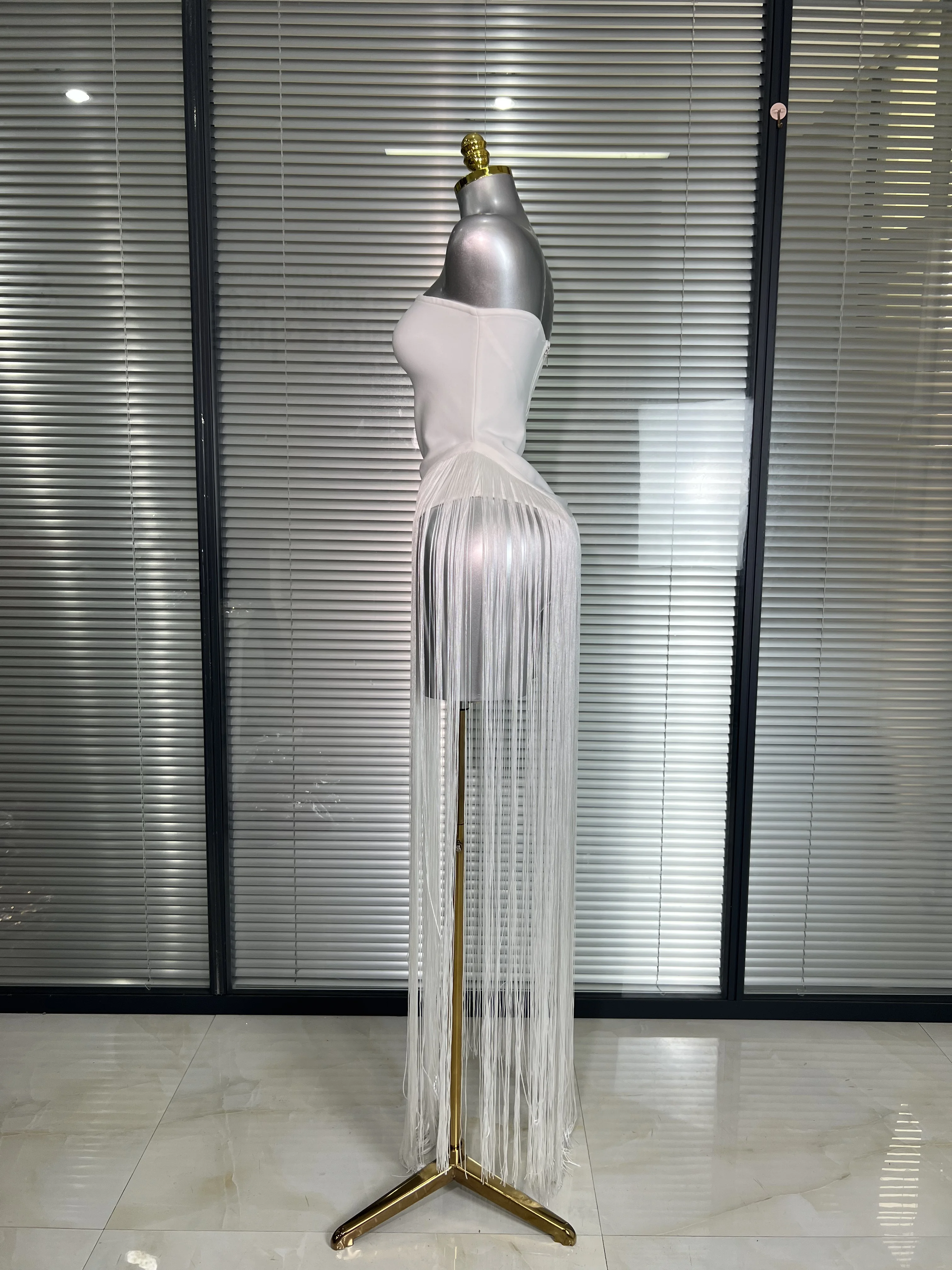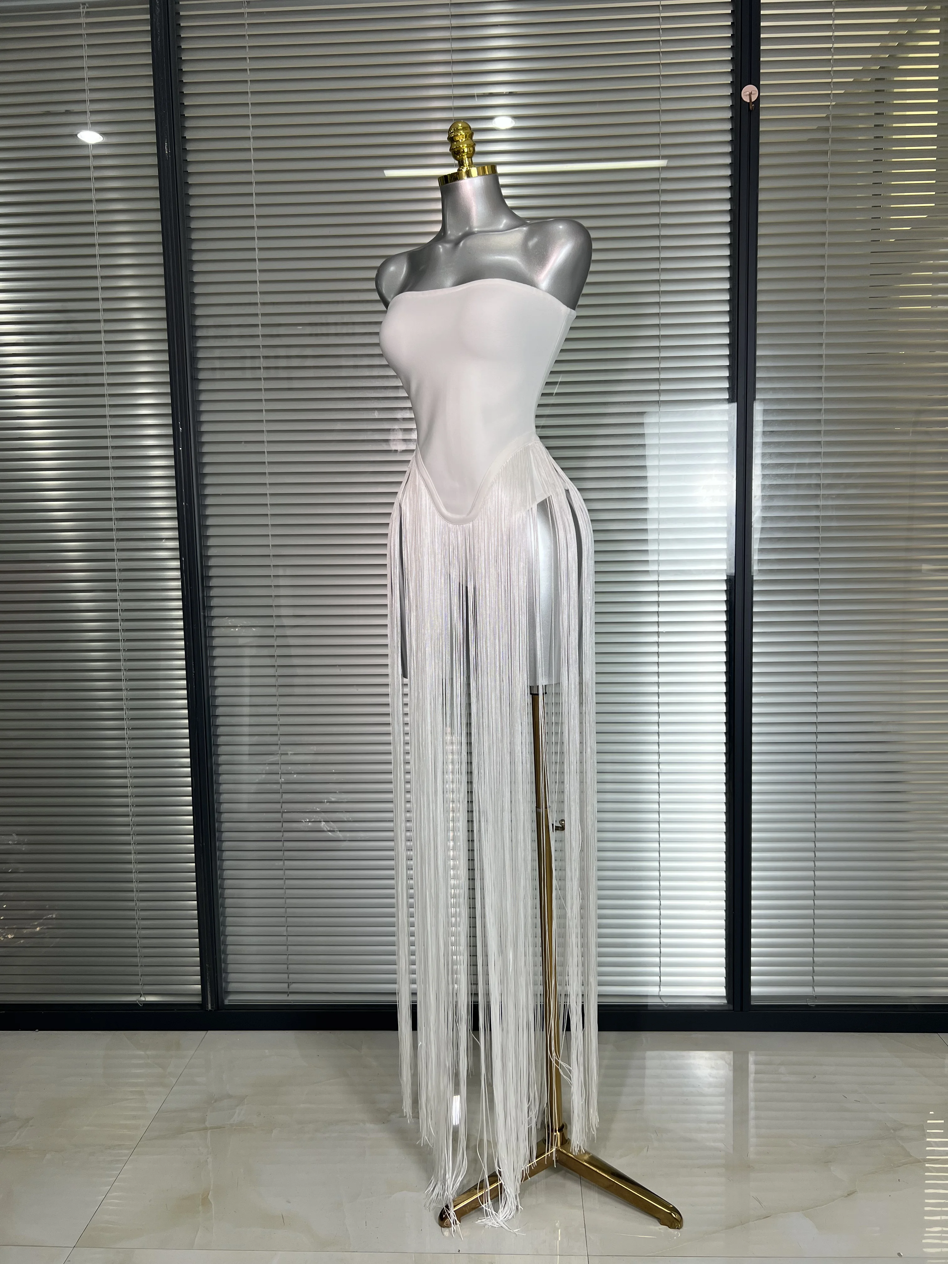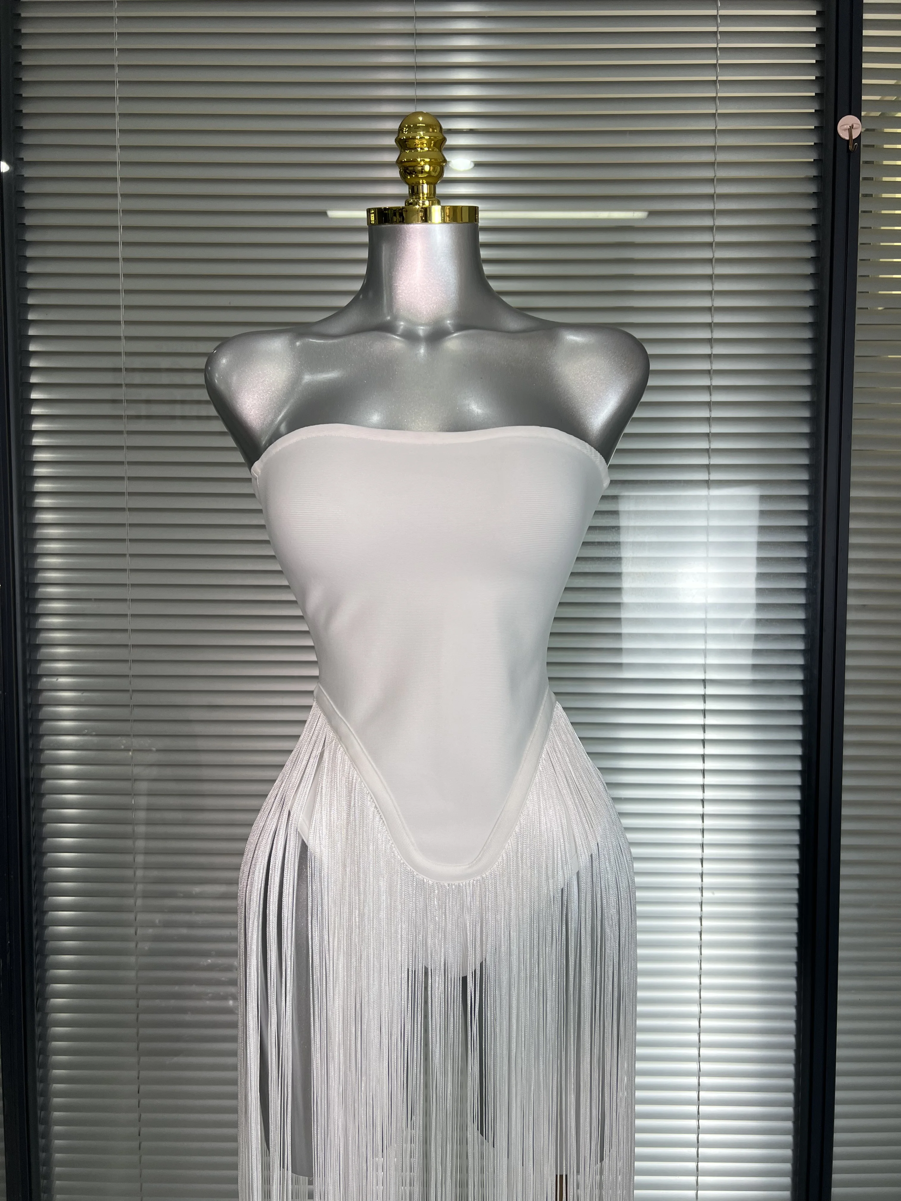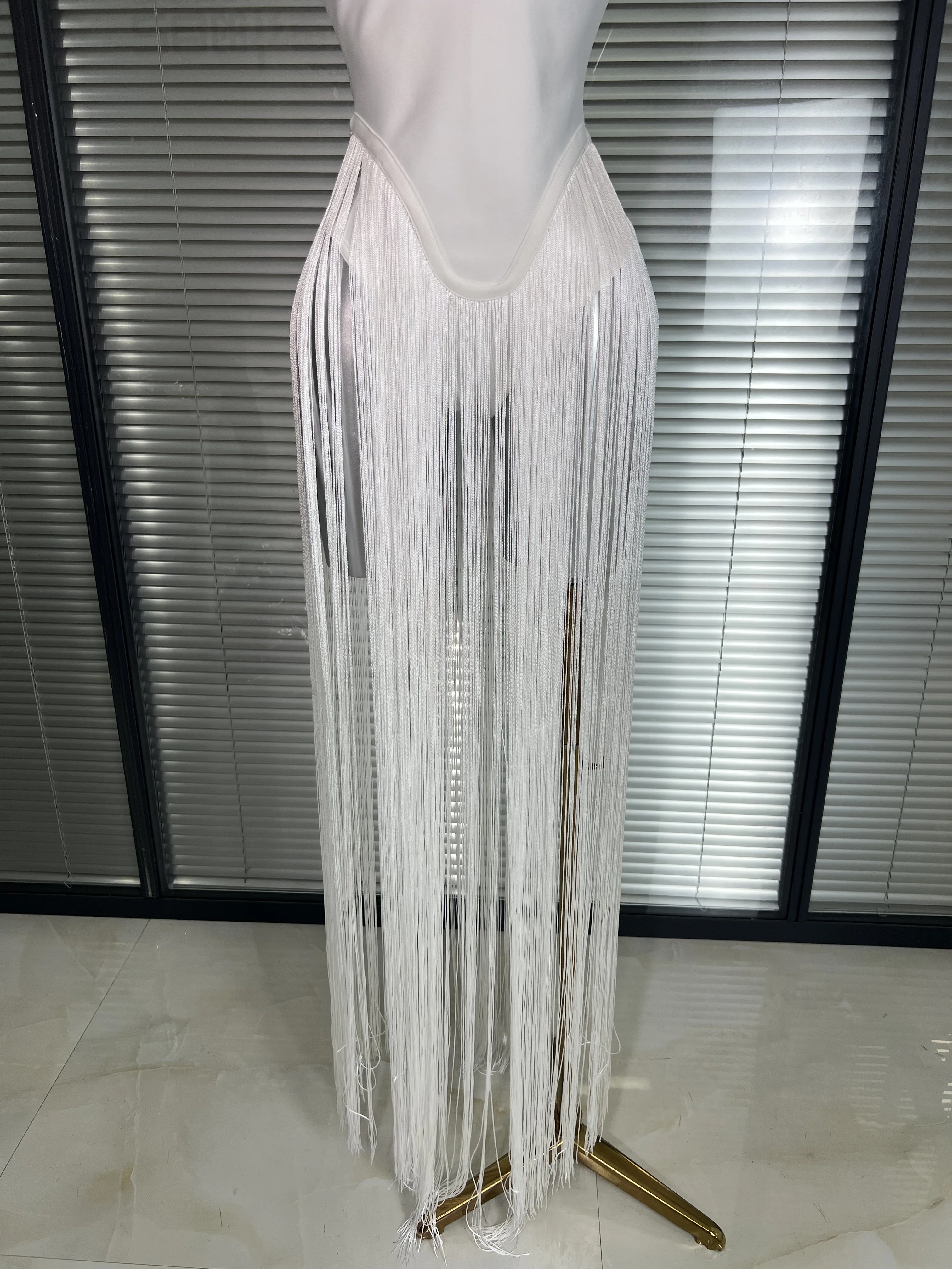 Summer New Women Sexy White Red Tassel Bandage Bodysuit Celebrity Designer Bodysuit Dancer Night Club Stage Stage Costume