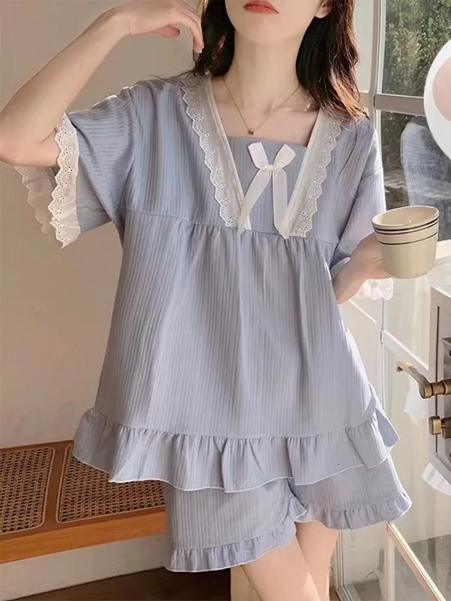 Summer ort Sve Spwear Set for Women Cute Princ Sle Home Clothes with Chest Pad Two-Piece Polyester Fiber Set
