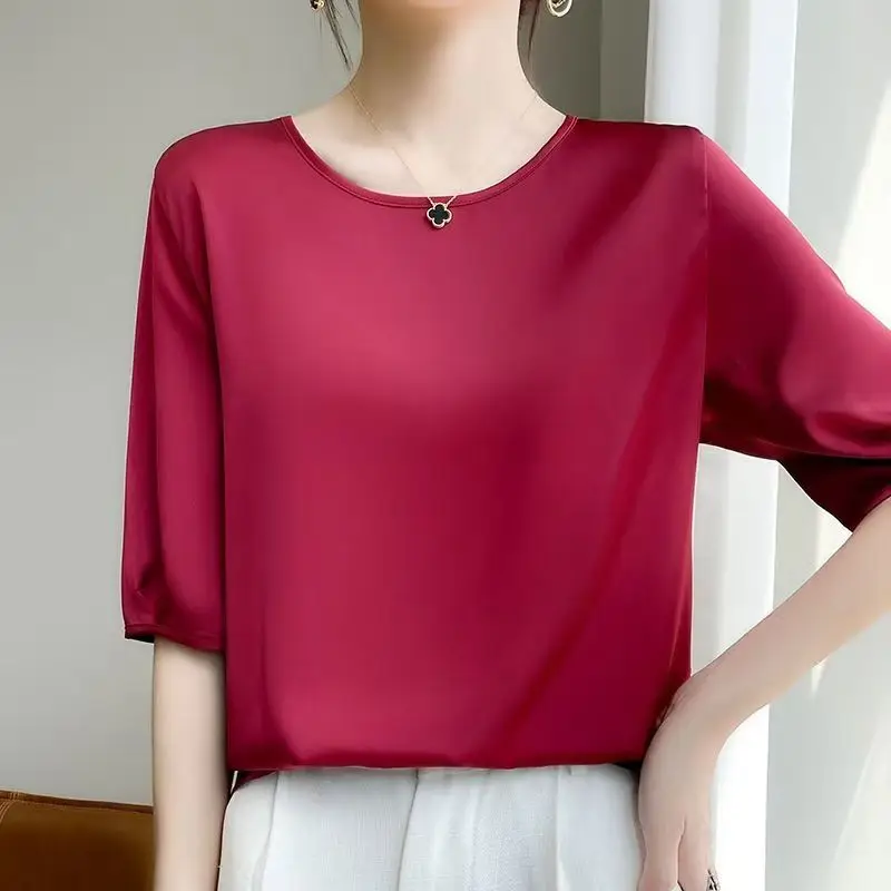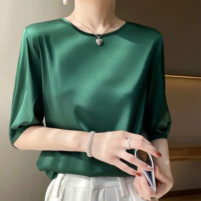 Summer satin Women Blouse Silky Loose Woman Shirt lady’s half Sleeve tops Casual solid t-shirt O-Neck pullover women’s clothing