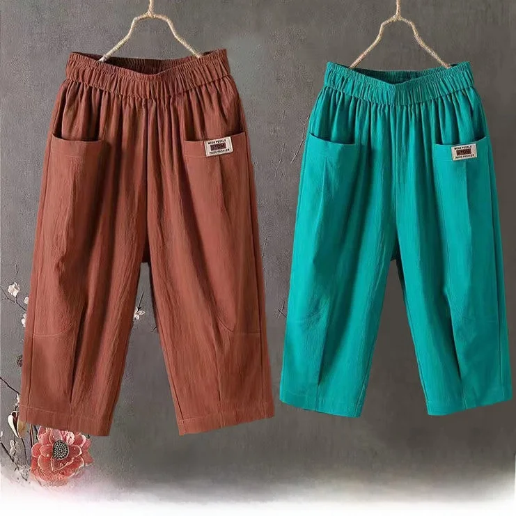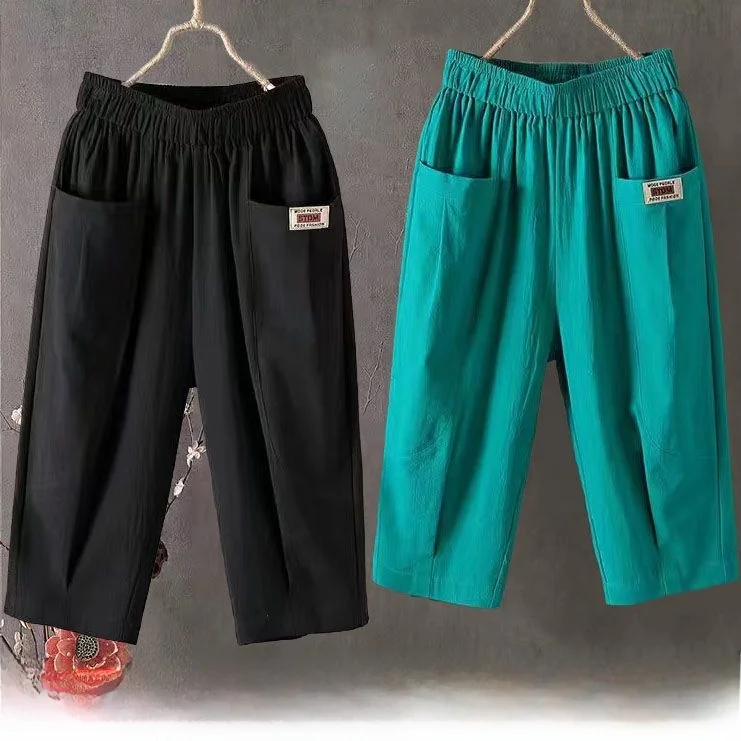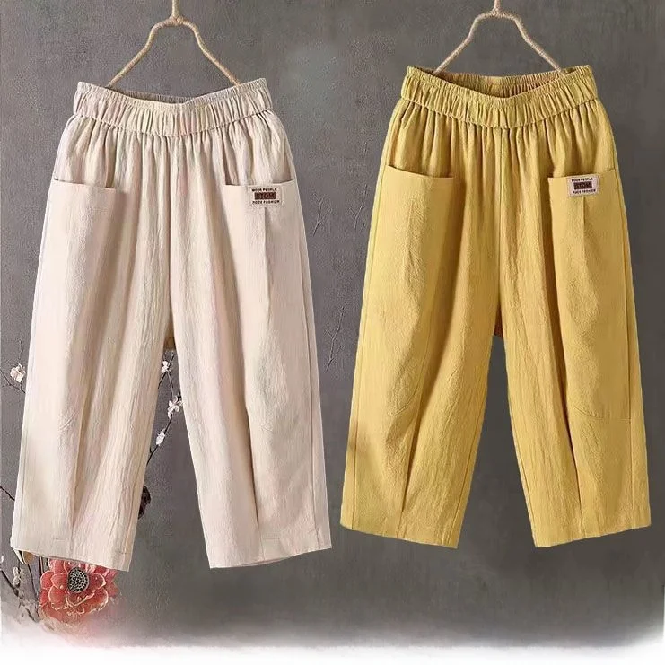 Summer Thin Cotton Linen Mom Pants Women Loose Large Size Elastic Waist Harem Casual Pants Comfortable High Waist ket Design