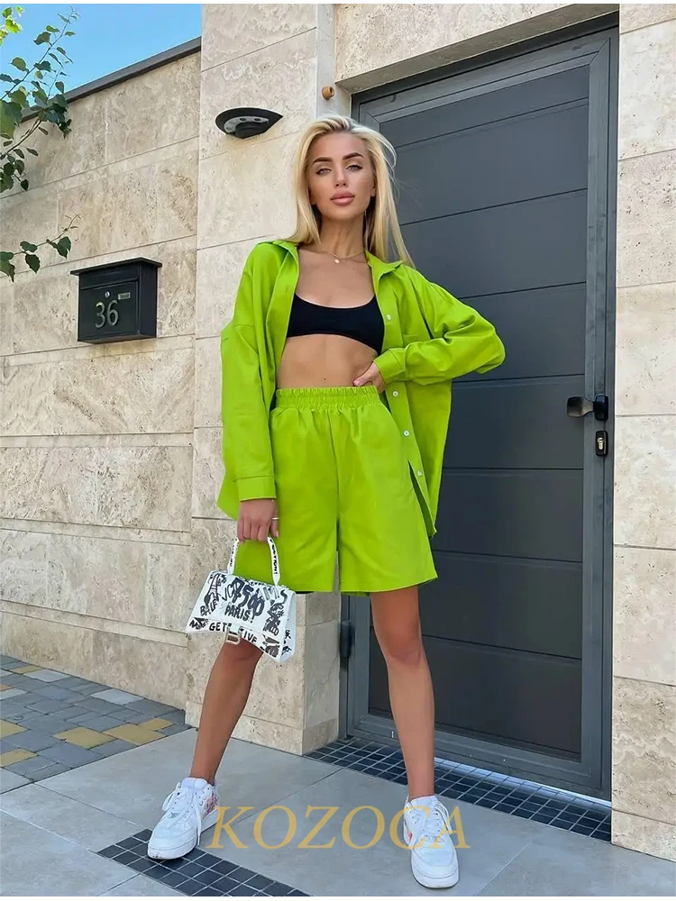 Summer Two Piece Set Women Shorts Suit Green Lapel Long Sleeve Shirts Sets Female Elegant Casual High Waist Pants Lady Outfits