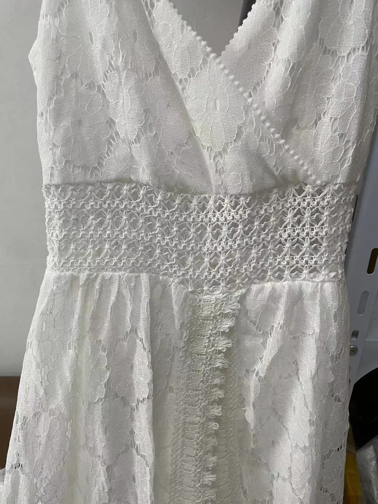 Summer V Neck Solid Color Lace Hollow-Out Sleeveless Sling Party Wear High Waist Rompers Holiday Casual White Women’s Jumpsuit