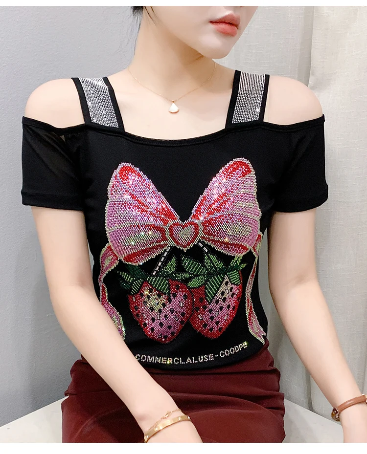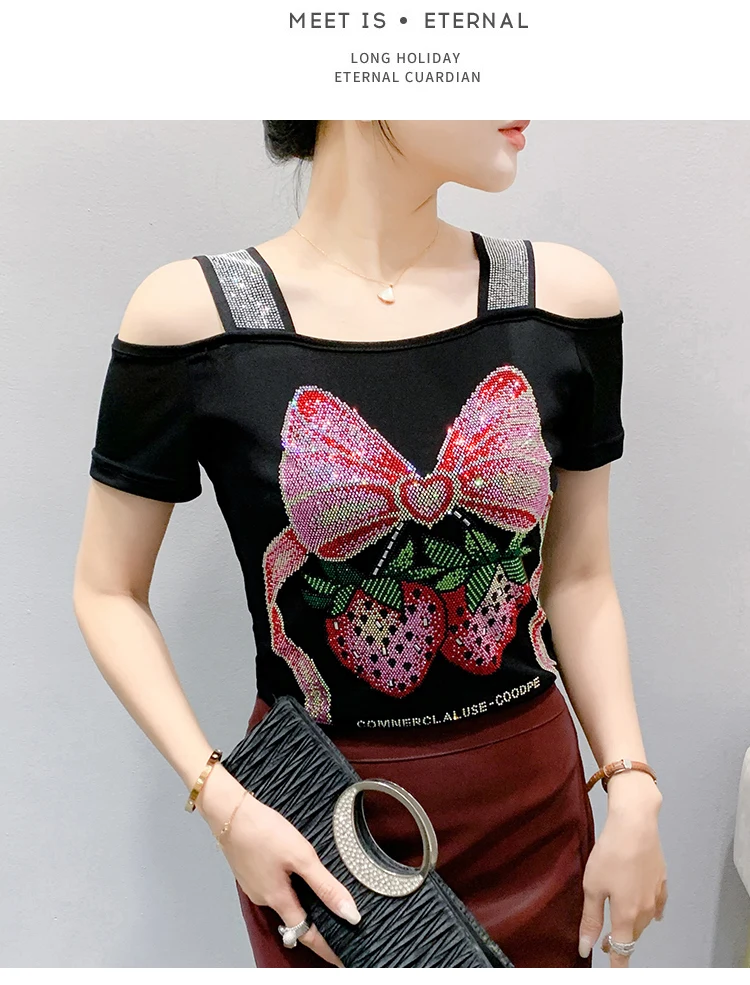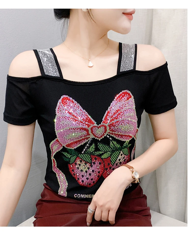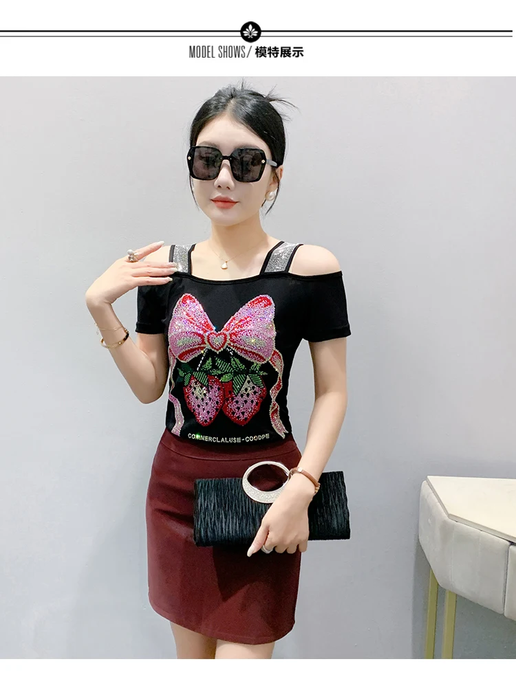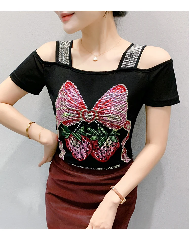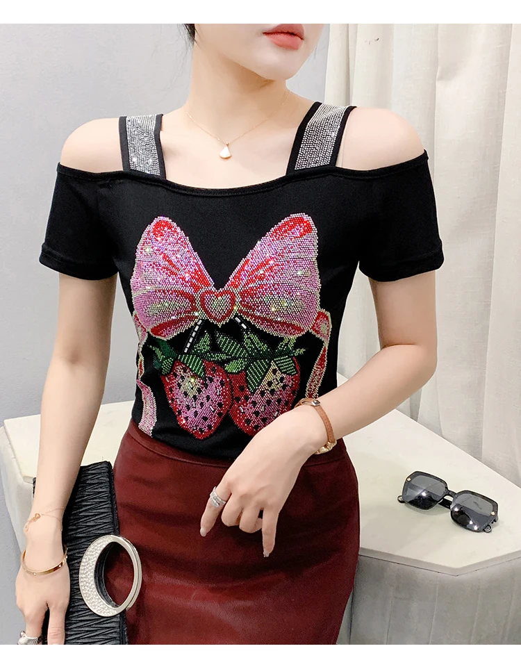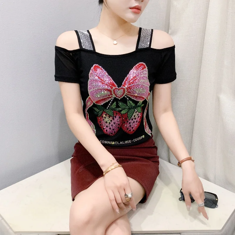 Summer Women European Clothes T-Shirt Sexy Luxury Hot Diamonds Elegant Tops Female Brand Design Bow Streetwear Tees