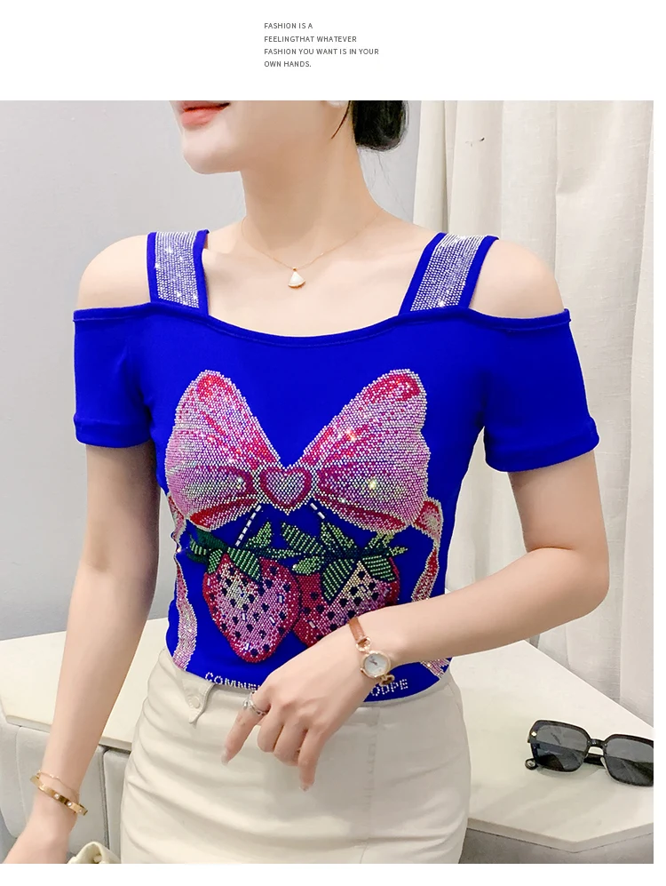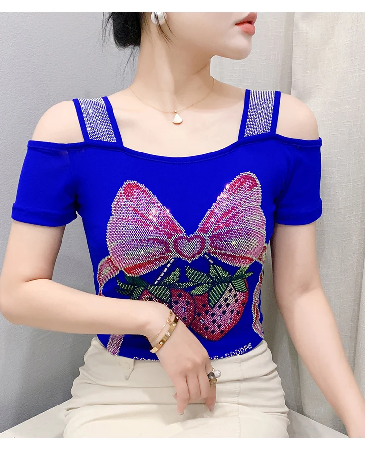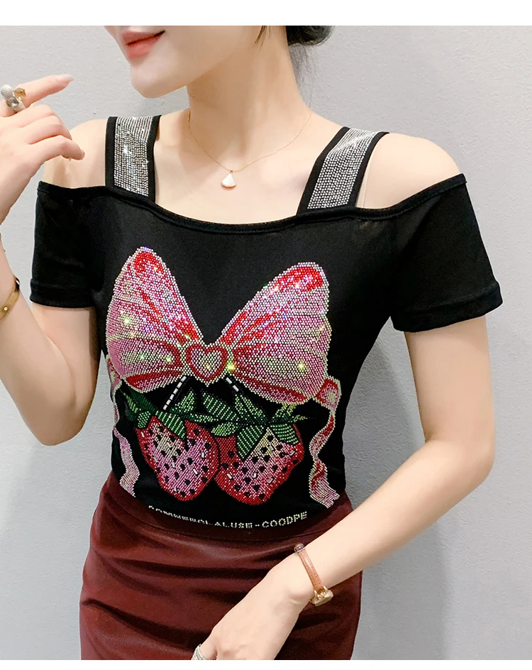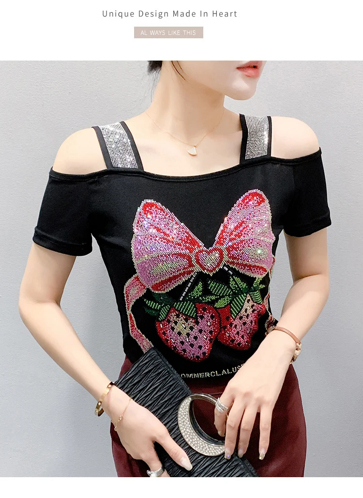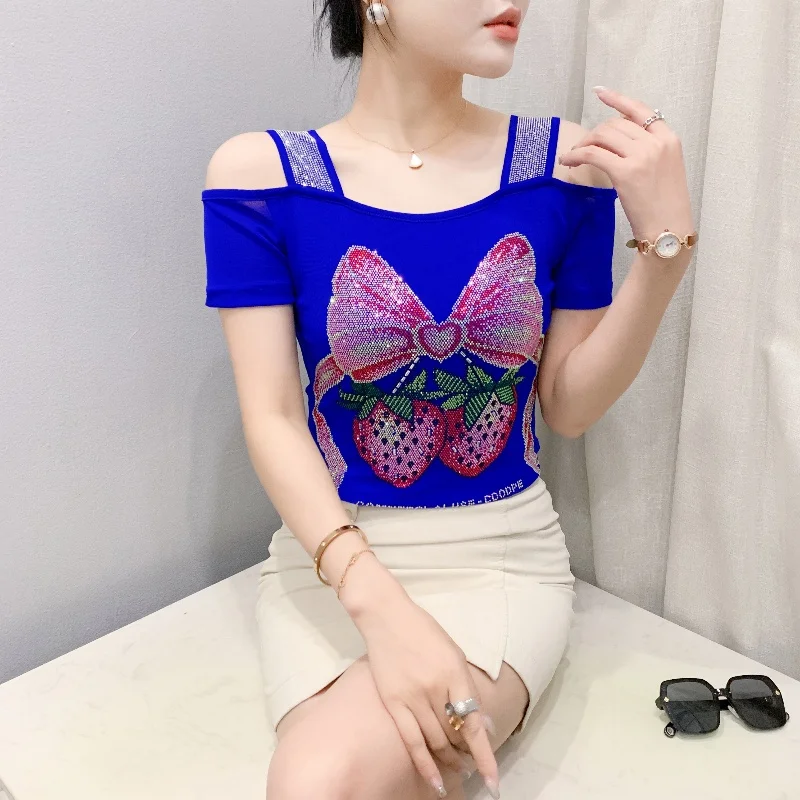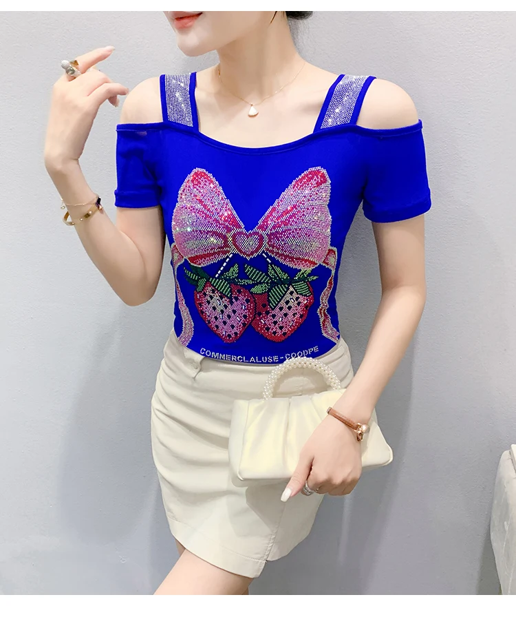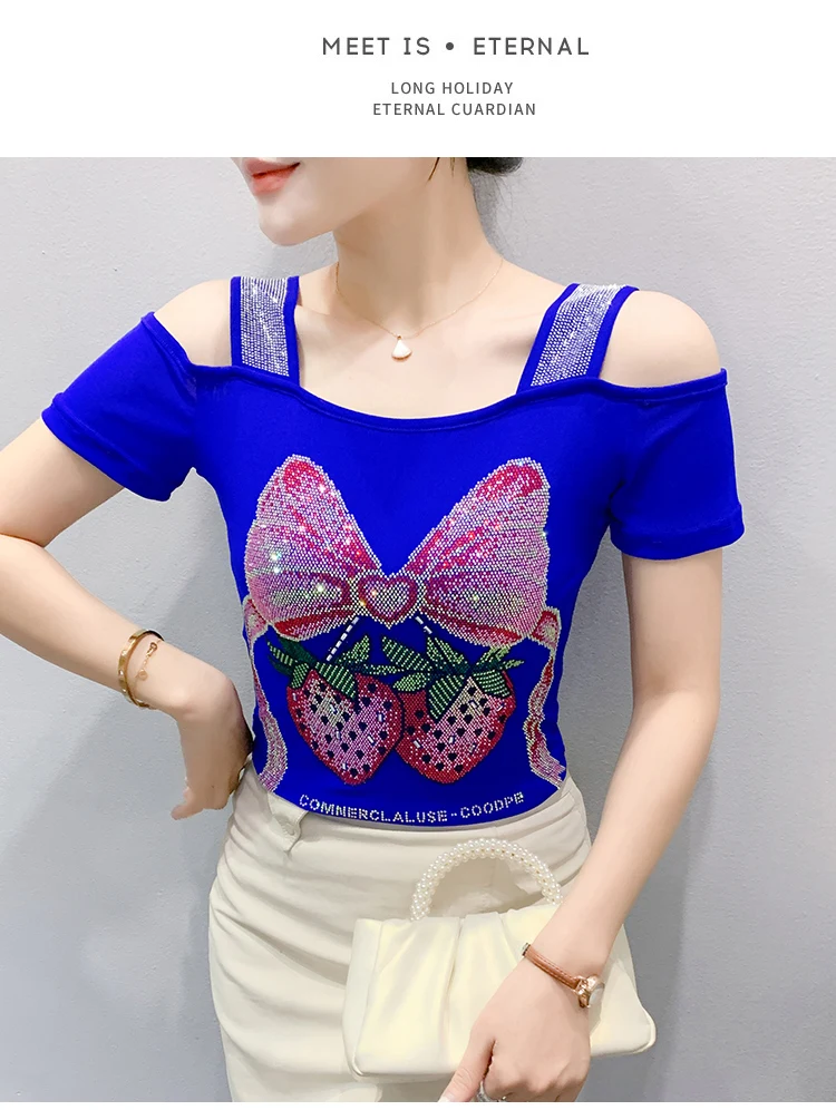 Summer Women European Clothes T-Shirt Sexy Luxury Hot Diamonds Elegant Tops Female Brand Design Bow Streetwear Tees