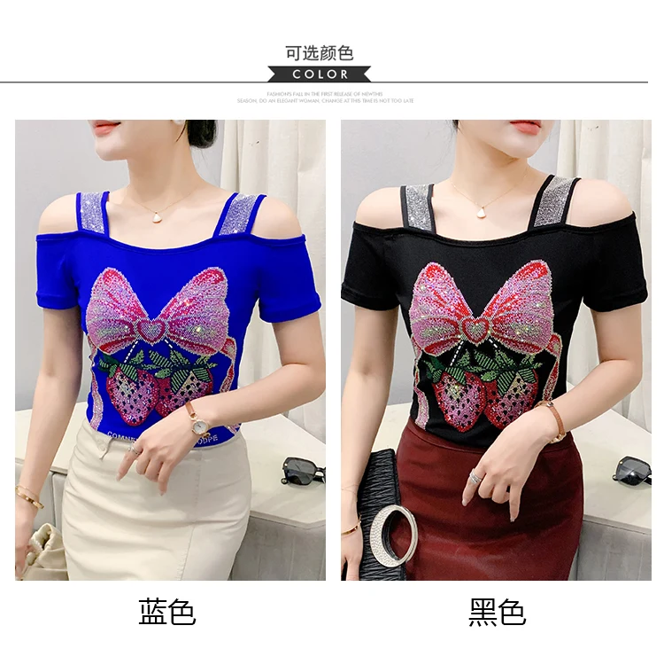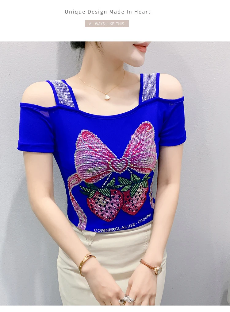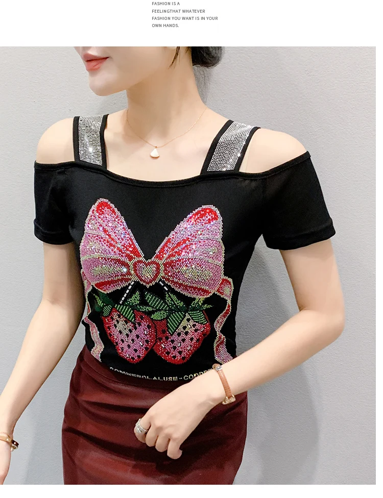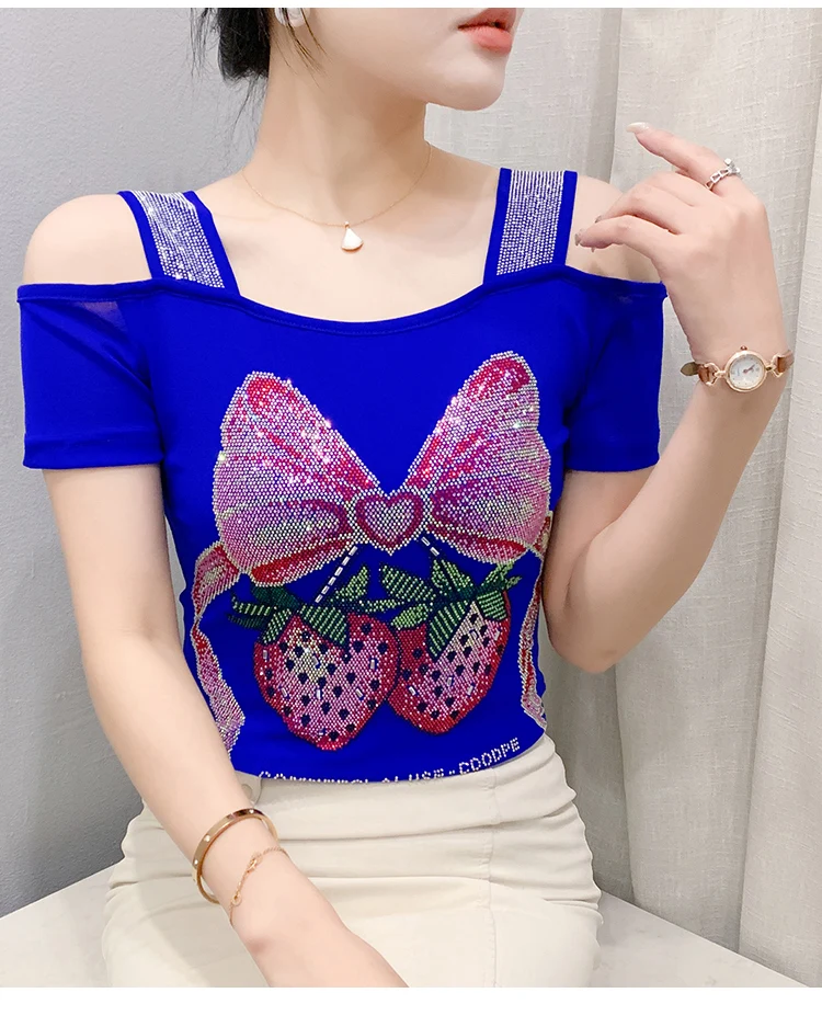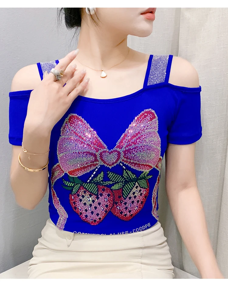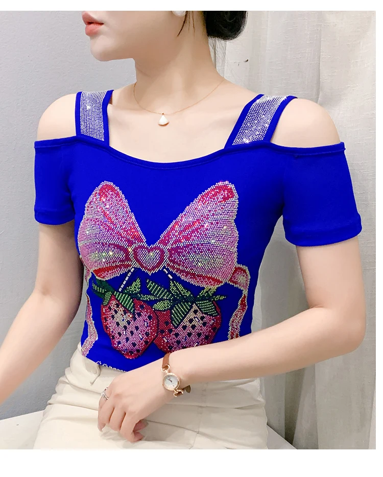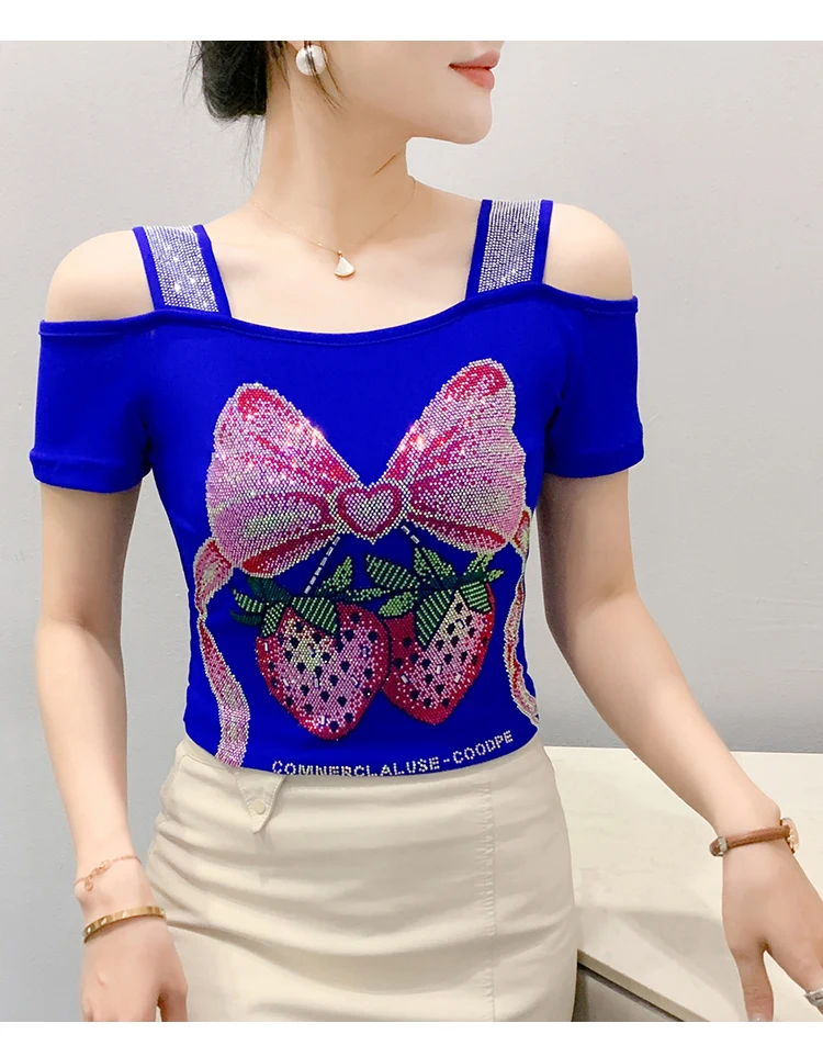 Summer Women European Clothes T-Shirt Sexy Luxury Hot Diamonds Elegant Tops Female Brand Design Bow Streetwear Tees