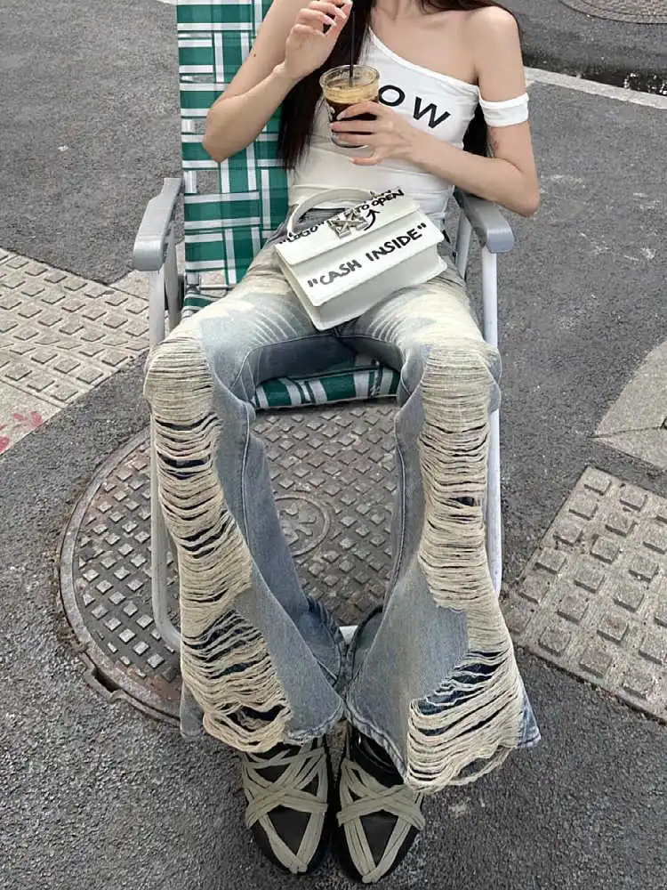 Summer Women Goblin Core Abi Grunge Cyber Punk Flare Jean Y2k Japanese Harajuku Low Rise Ripped Denim Pants 2000s Bell-Bottom