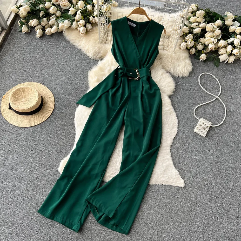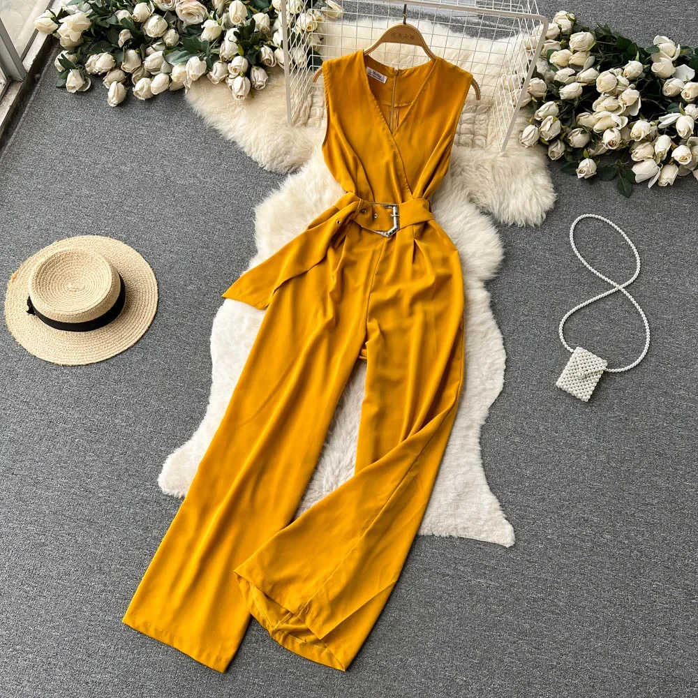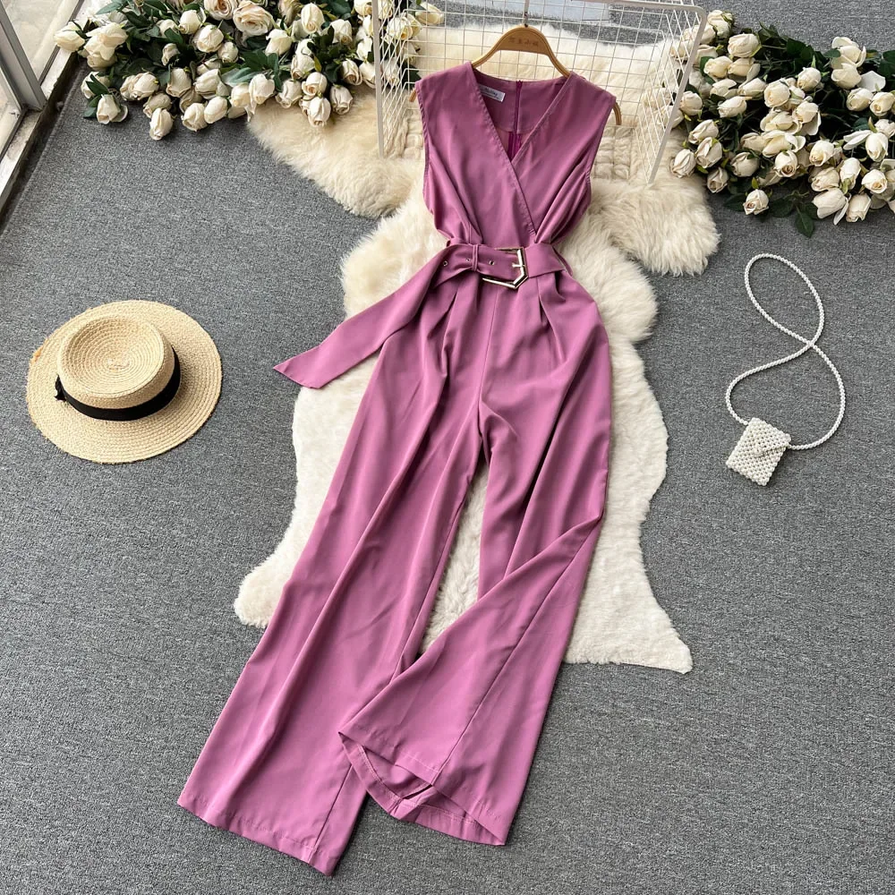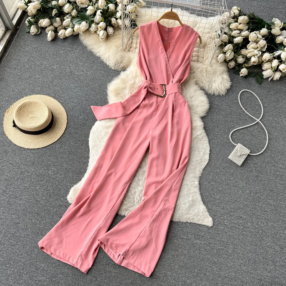 Summer Women Long Jumpsuits V Neck Sleeveless Belt Design Zipper Loose Wide Legs Pants 2024 New Fashion OL Bodysuits