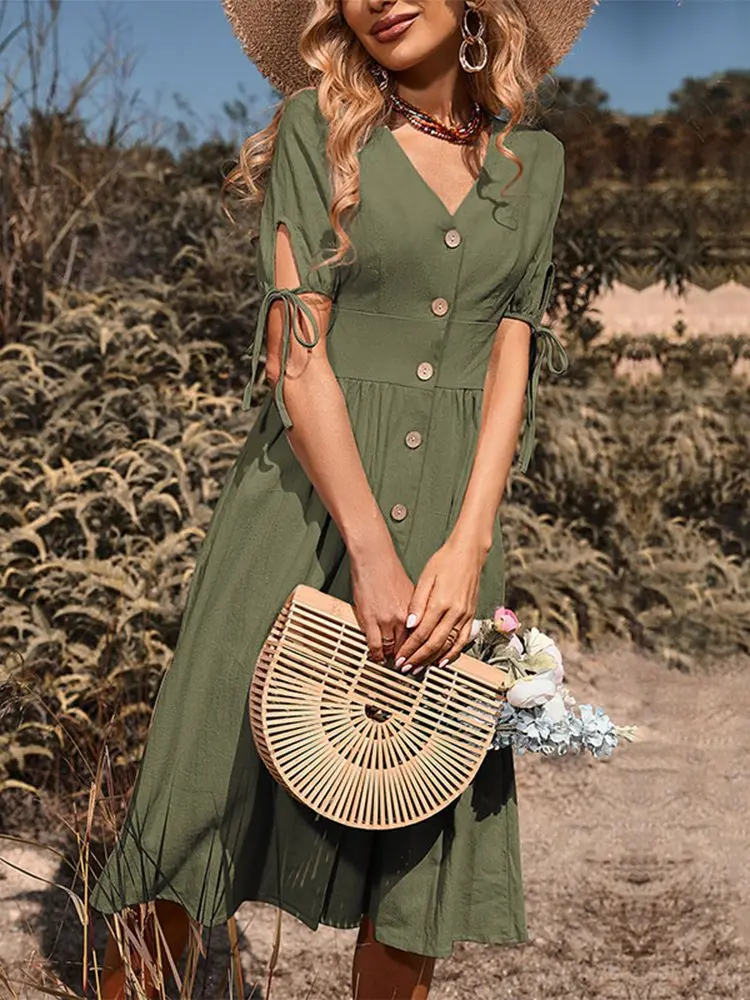 Summer Women Short Sleeve V Neck Solid Color Single Breasted Cotton Linen A Line Dress