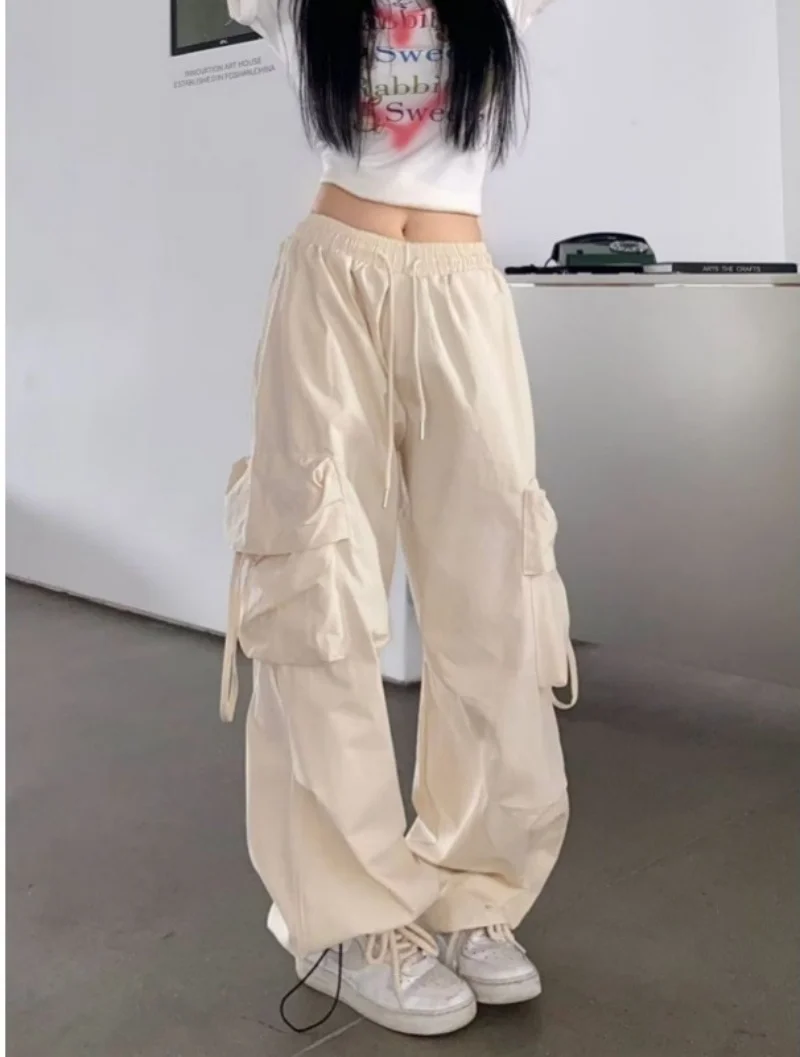 SweatPants Women Vintage Cargo Pants Fashion Elastic Waist Retro Oversized Solid Wide Leg Pant Casual Streetwear Baggy Trousers