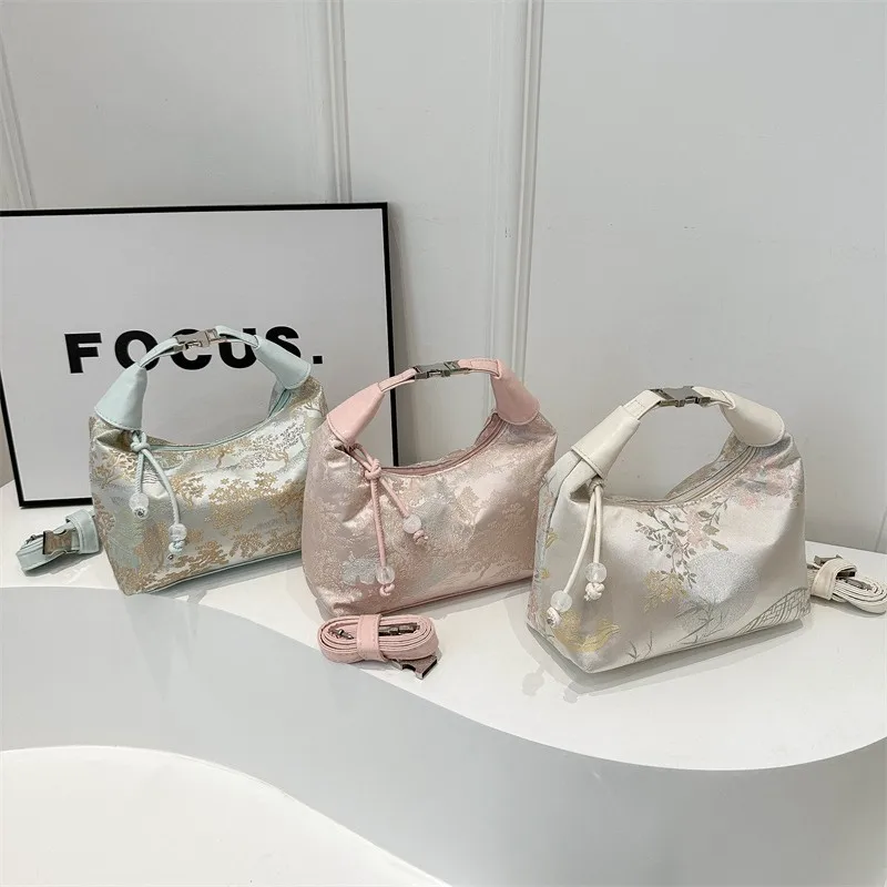 Sweet Embroidery Shoulder Bag Nylon Texture Pearl Pendant Crossbody Bag Small Bucket Handbag Women Girl