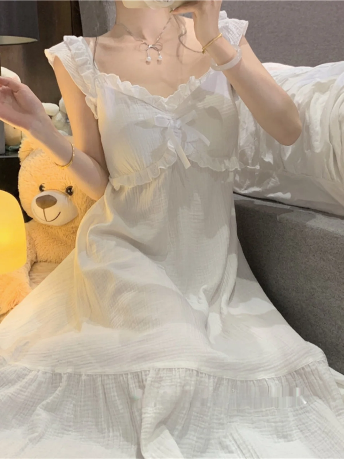 This sleepwear set features a sweet style design with a V-neck and long skirt, perfect for young women who love a touch of cuteness in their loungewear.