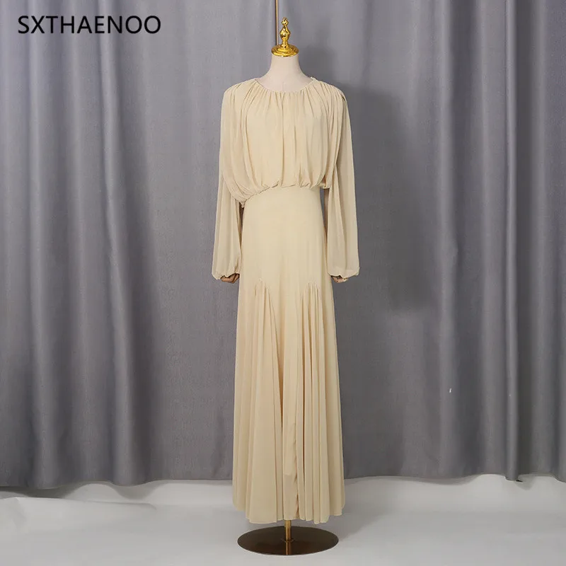 SXTHAENOO Yellow Dinner Loose Folds Maxi Dresses Women O Neck Shoulder Pud High Waist Temperament Dress Female Fashion Clothing