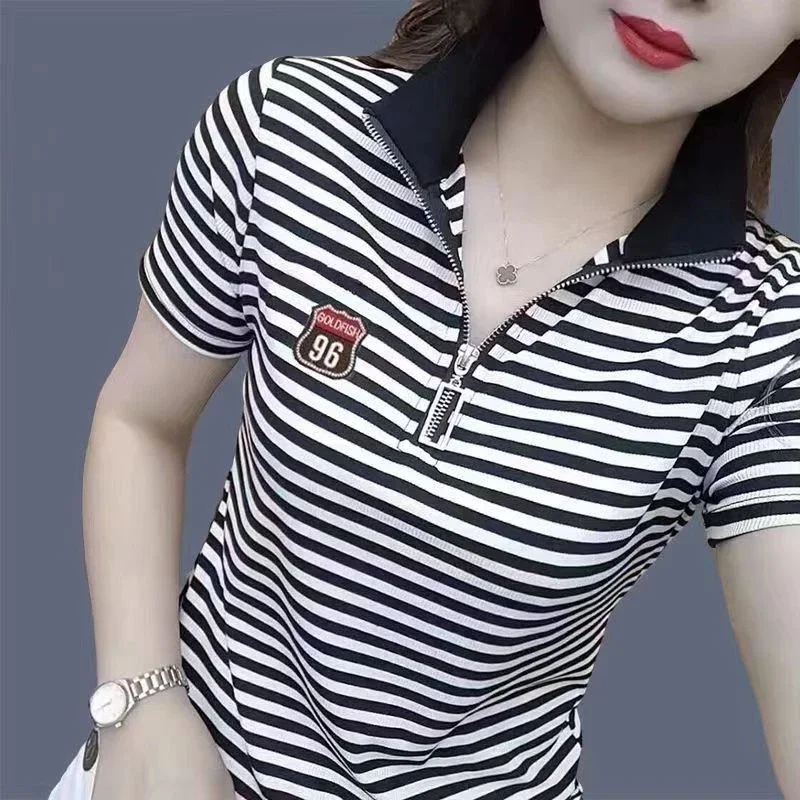 T-shirts Red Striped Women’s Polo Baggy Clothing Trend 2025 Synthetic Summer Female Tee Youthful Elegant New Korean Cheap Tops