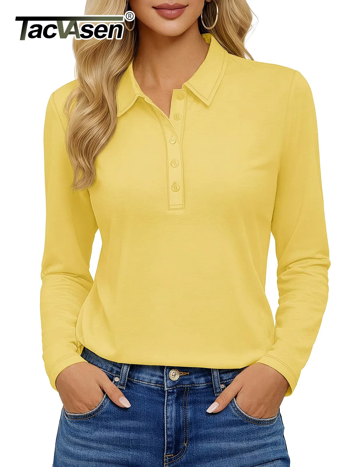 TACVASEN Women’s Long Sleeve 5-Button Polo Shirts V-Neck Collared Tops Cotton Blend Casual Work Golf T-Shirts with Side Split