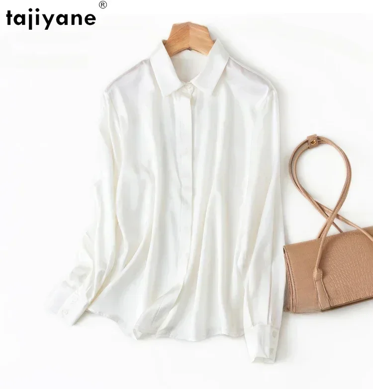 Tajiyane Women’s 93% Mulberry Silk 7% Spandex 19 momme satin Silk Buttons long sleeve shirt Top Blouse office work chemise femme
