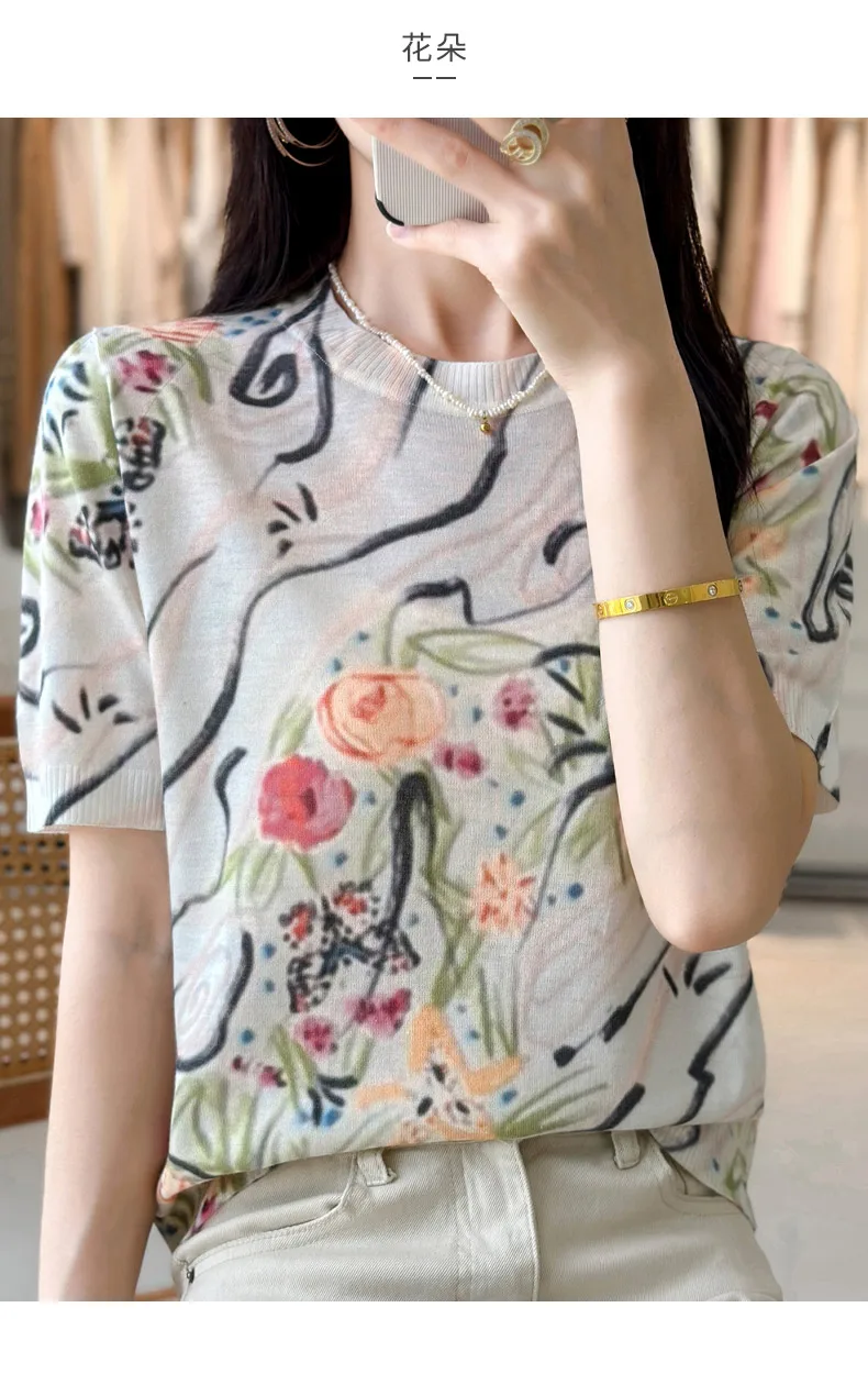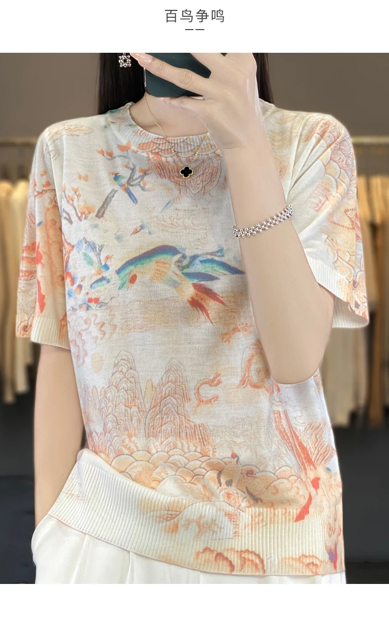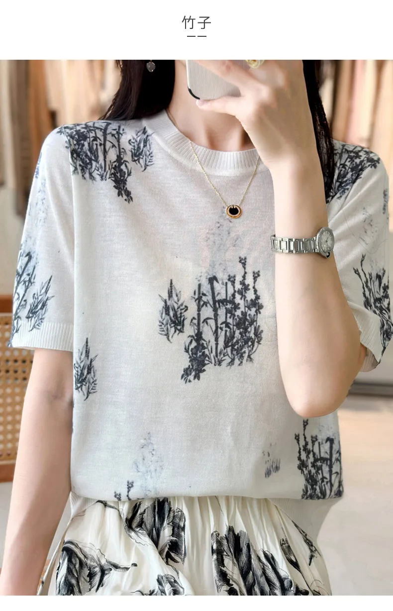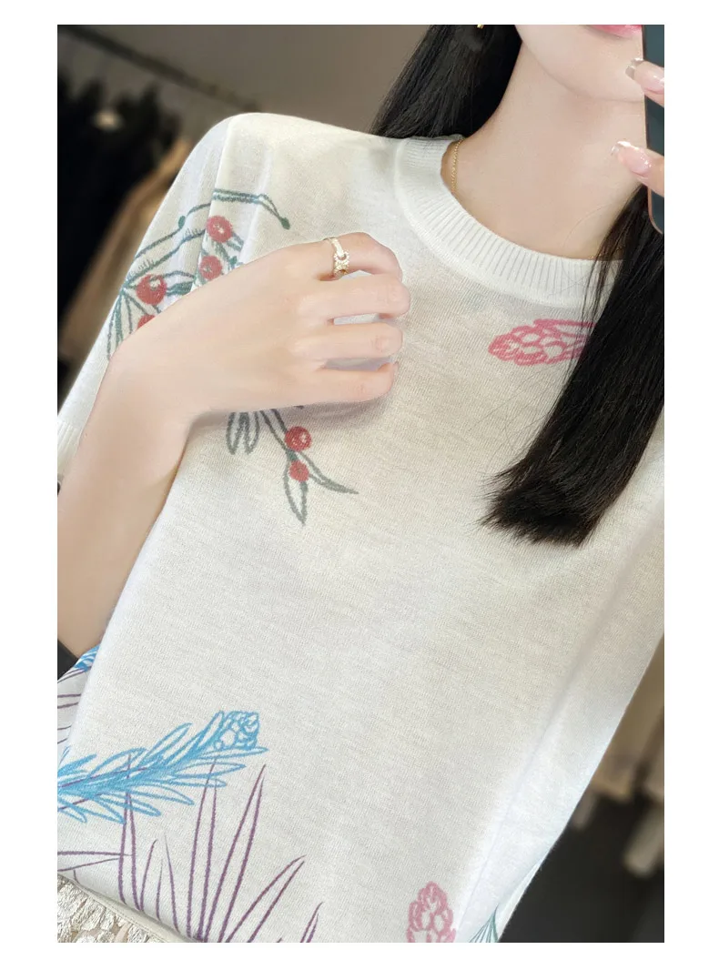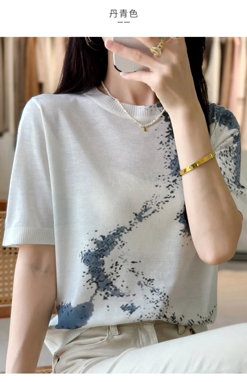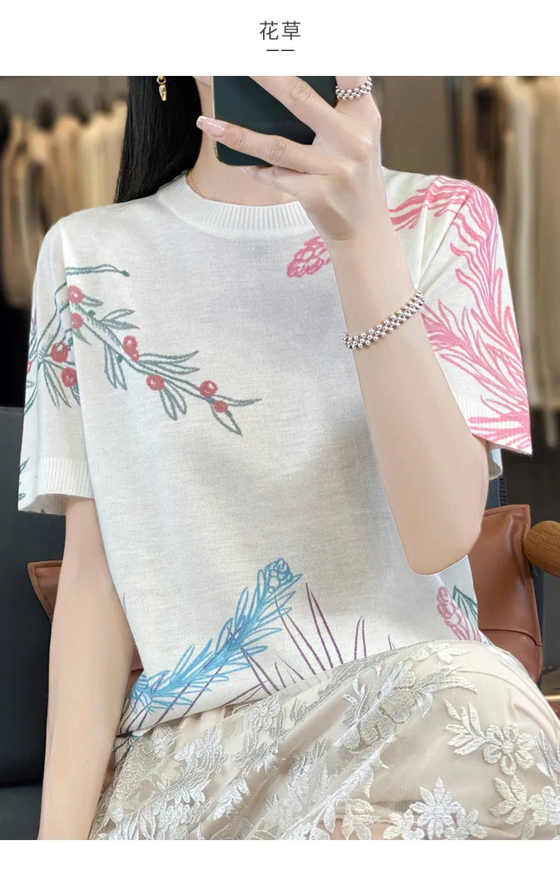 Thin Knitted Short-Sleeved Mulberry Silk T-Shirt In Summer With Women’s Wool Printed Half-Sleeve Loose Ice Silk Bottoming Shirt