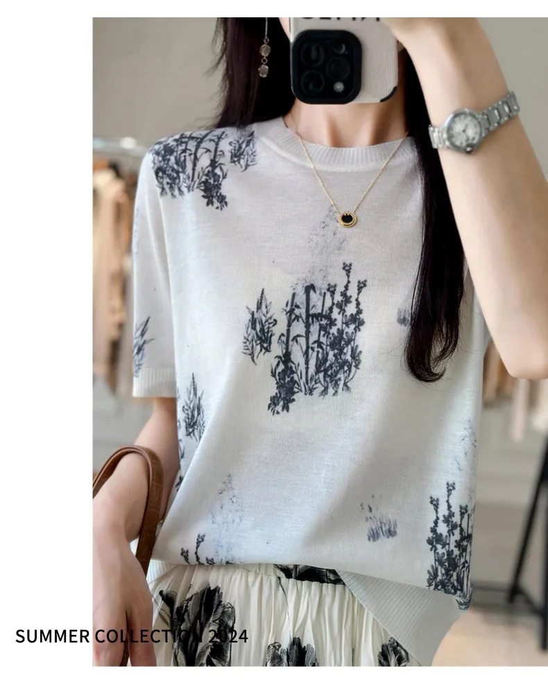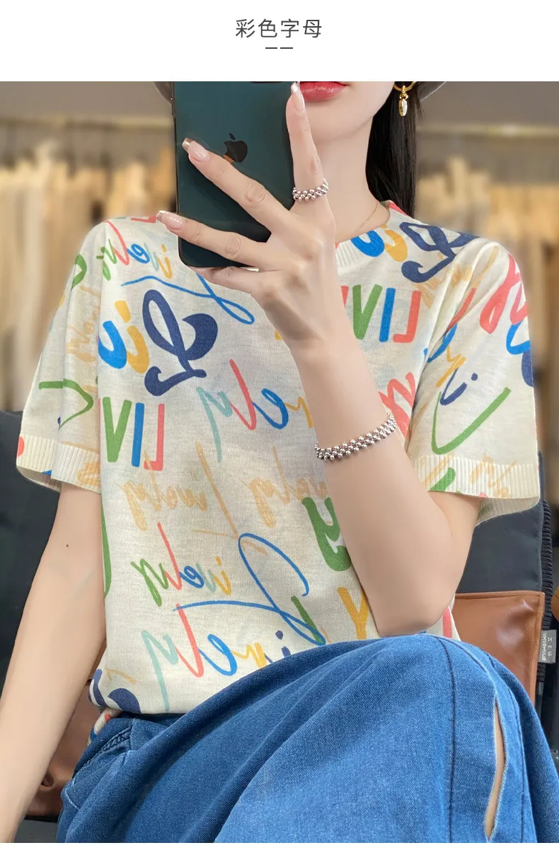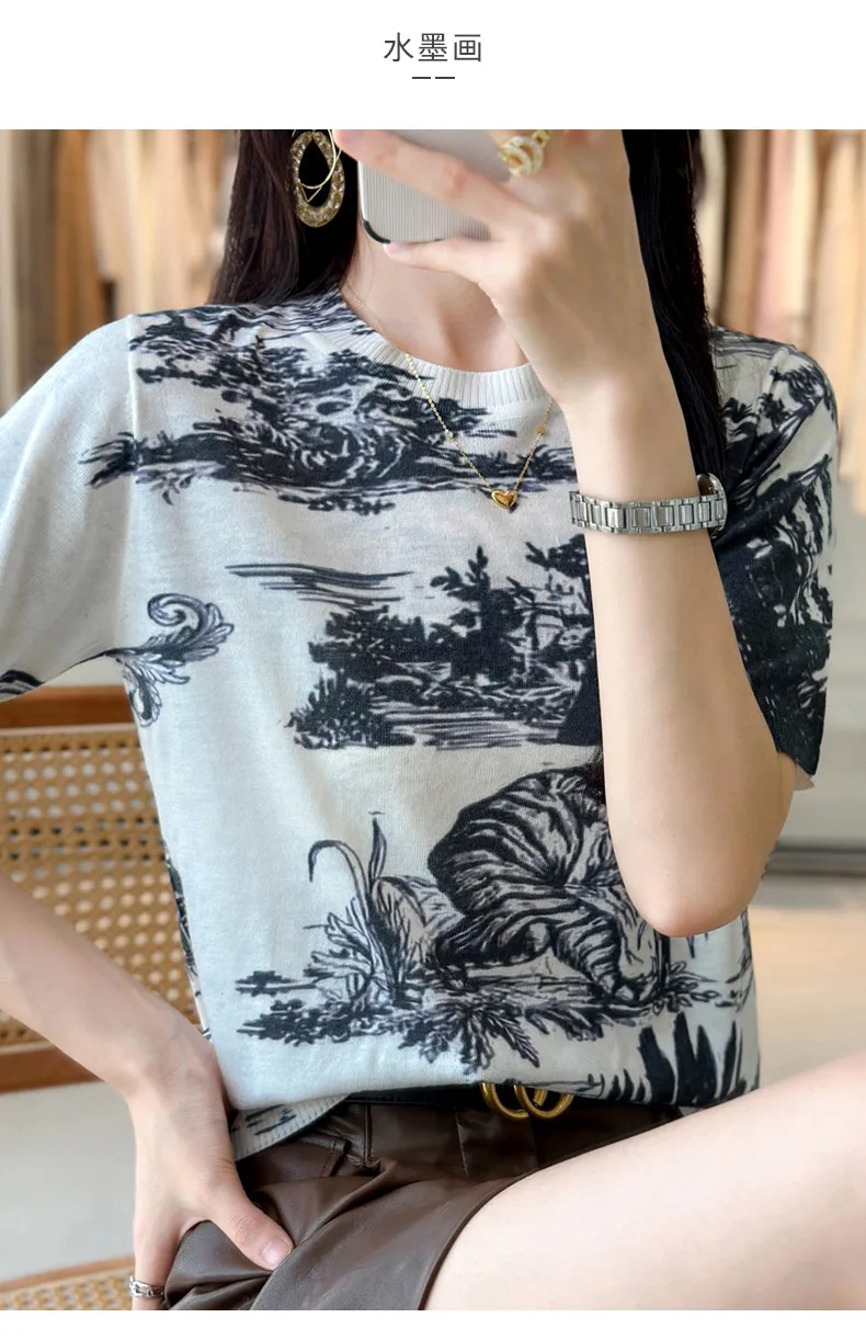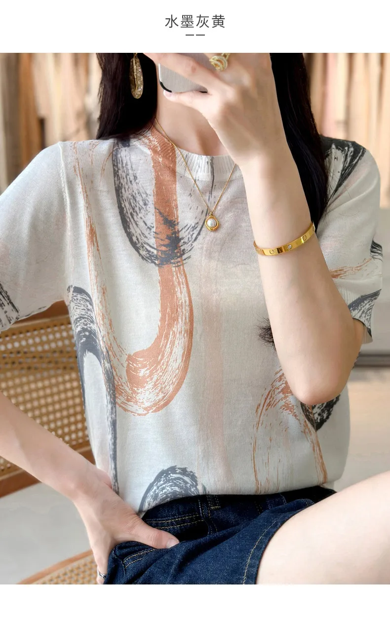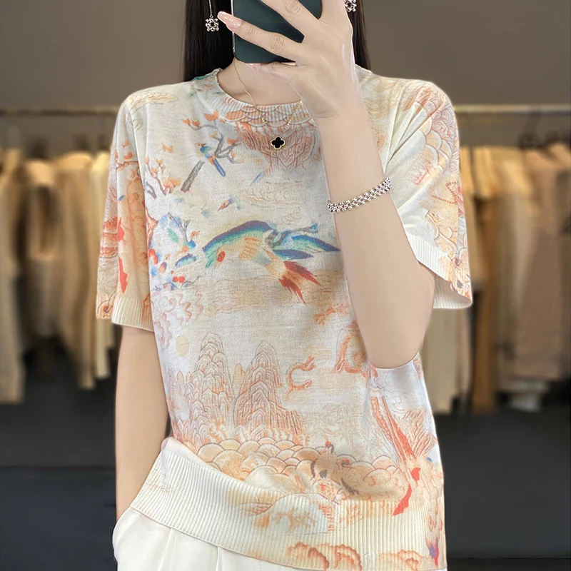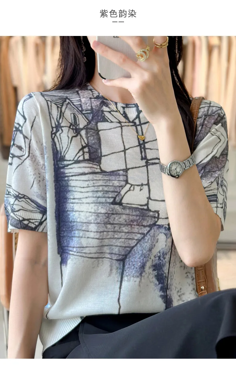 Thin Knitted Short-Sleeved Mulberry Silk T-Shirt In Summer With Women’s Wool Printed Half-Sleeve Loose Ice Silk Bottoming Shirt