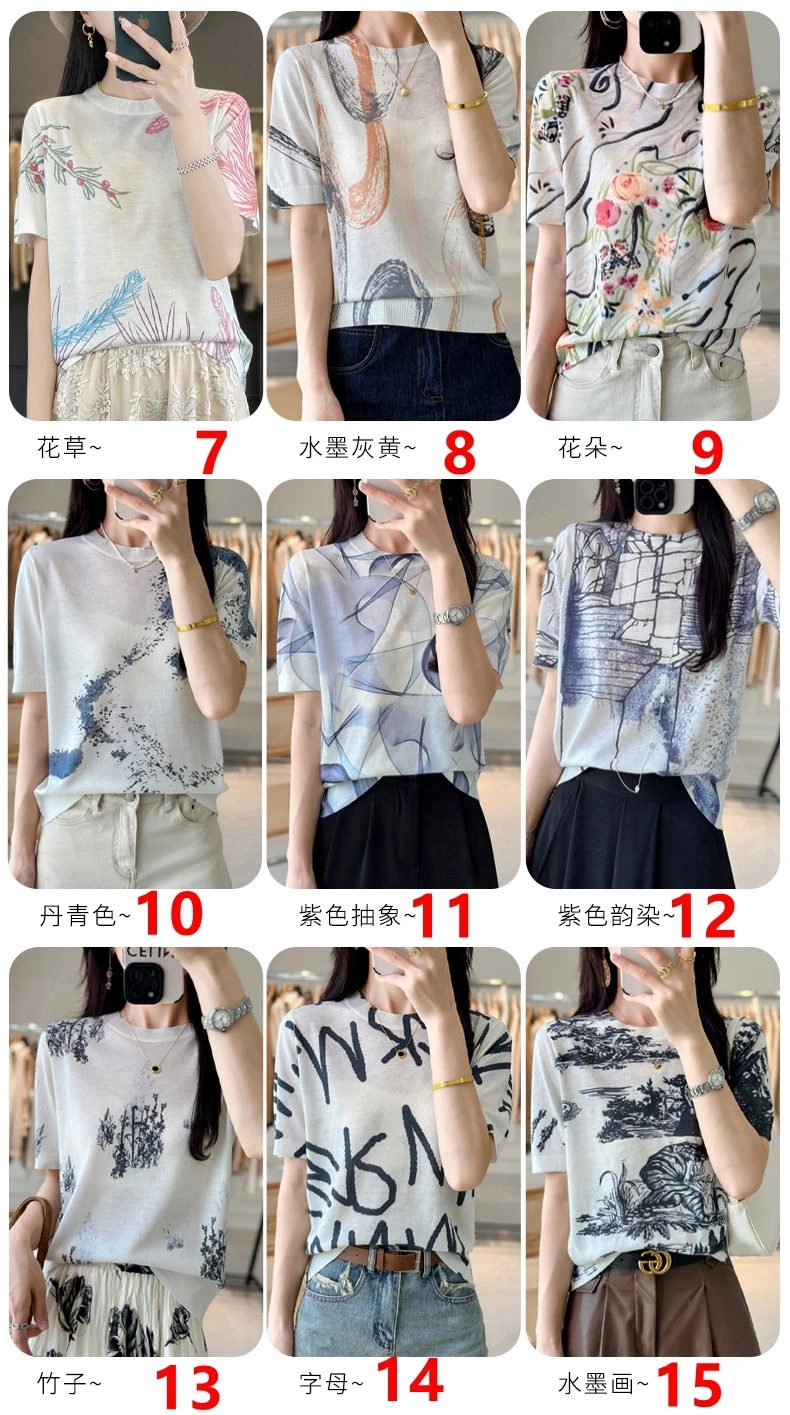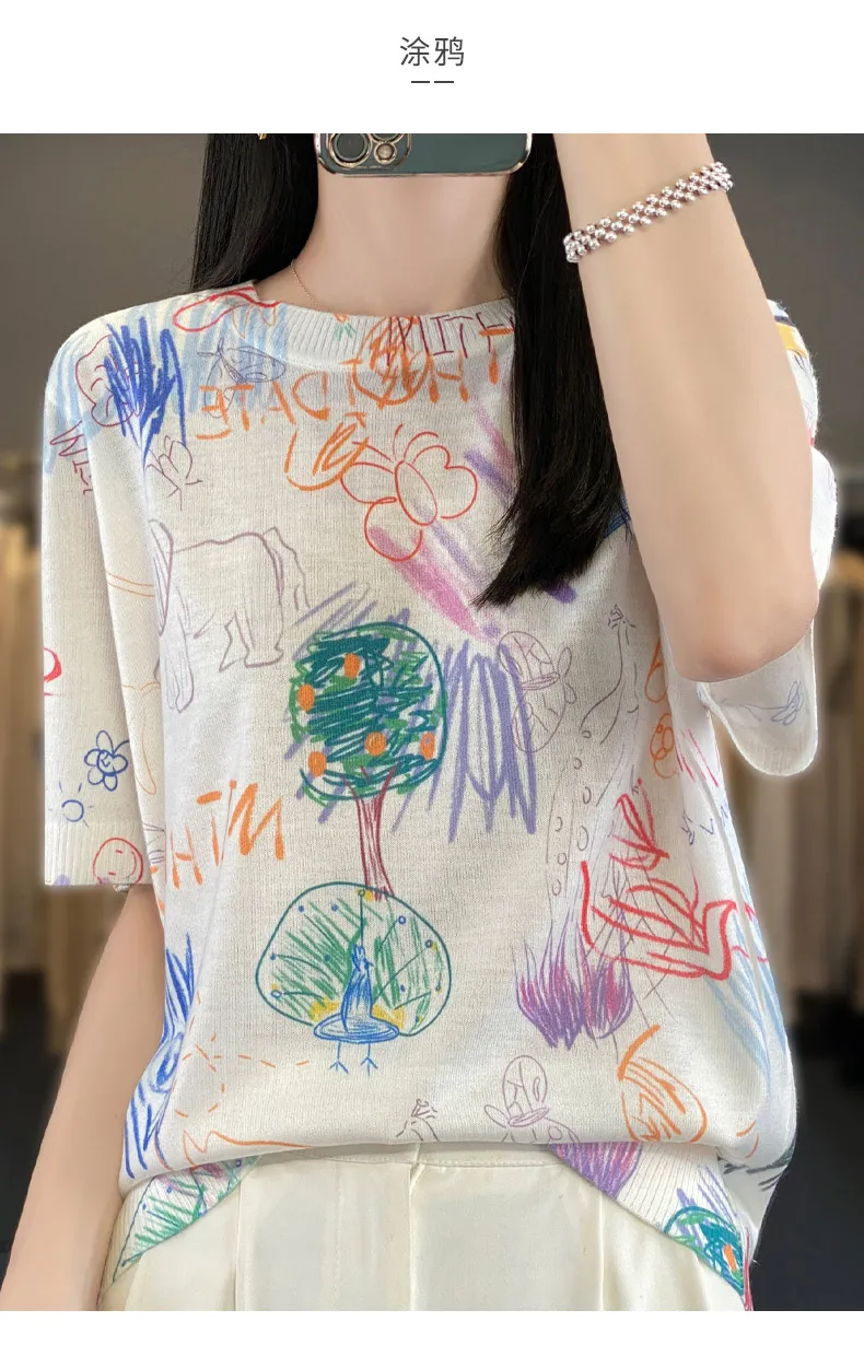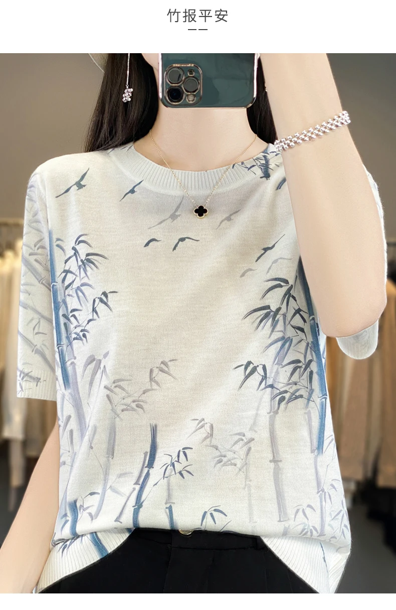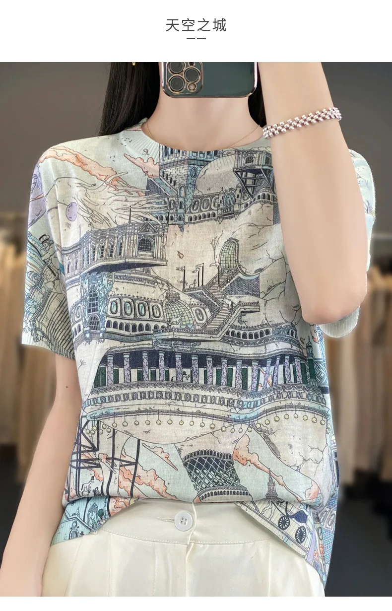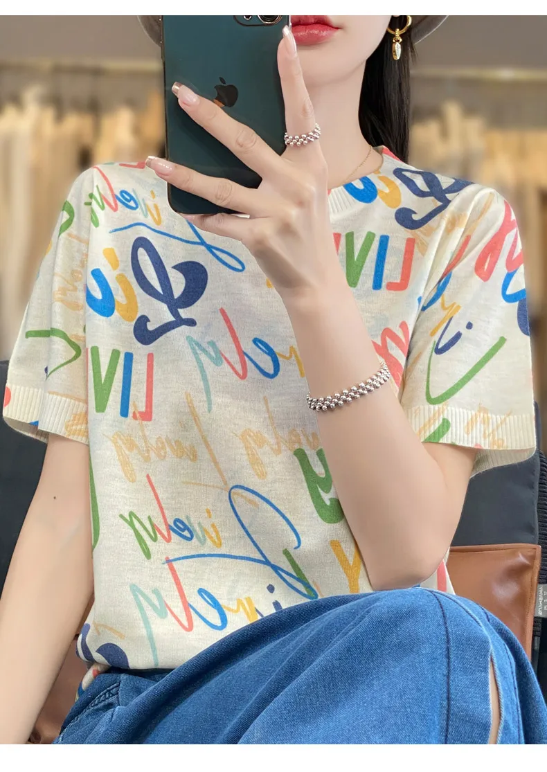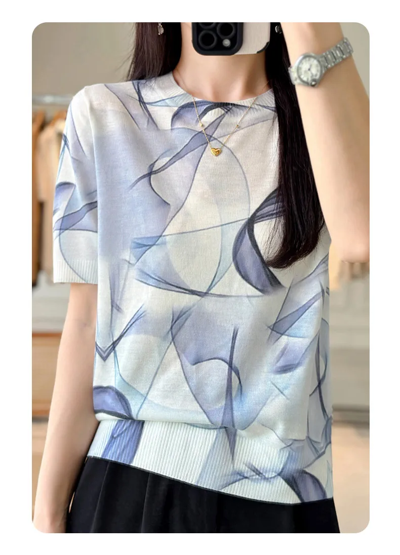Thin Knitted Short-Sleeved Mulberry Silk T-Shirt In Summer With Women’s Wool Printed Half-Sleeve Loose Ice Silk Bottoming Shirt